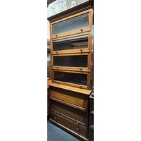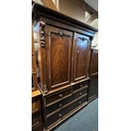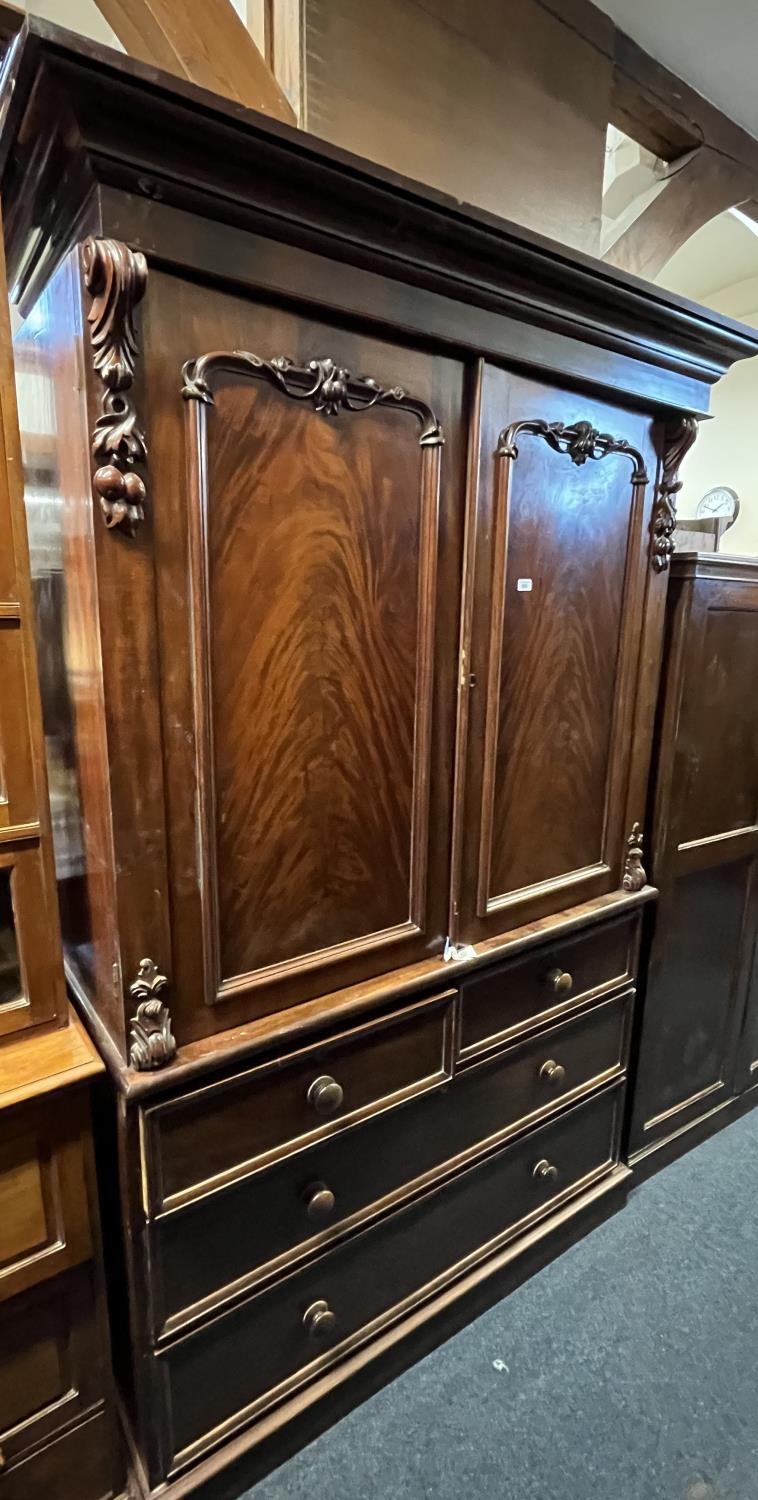 Victorian flame cut mahogany linen press with two cupboard doors above two short over two long drawers, raised on plinth base.