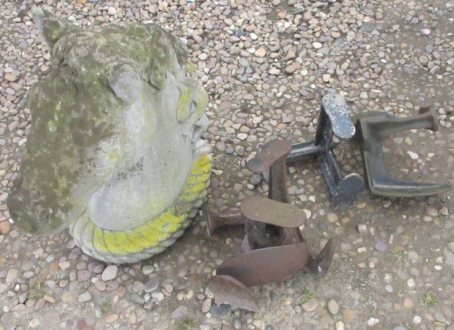 The Ricky Groves Collection - Reconstituted stone horse's head and 4 metal shoe lasts