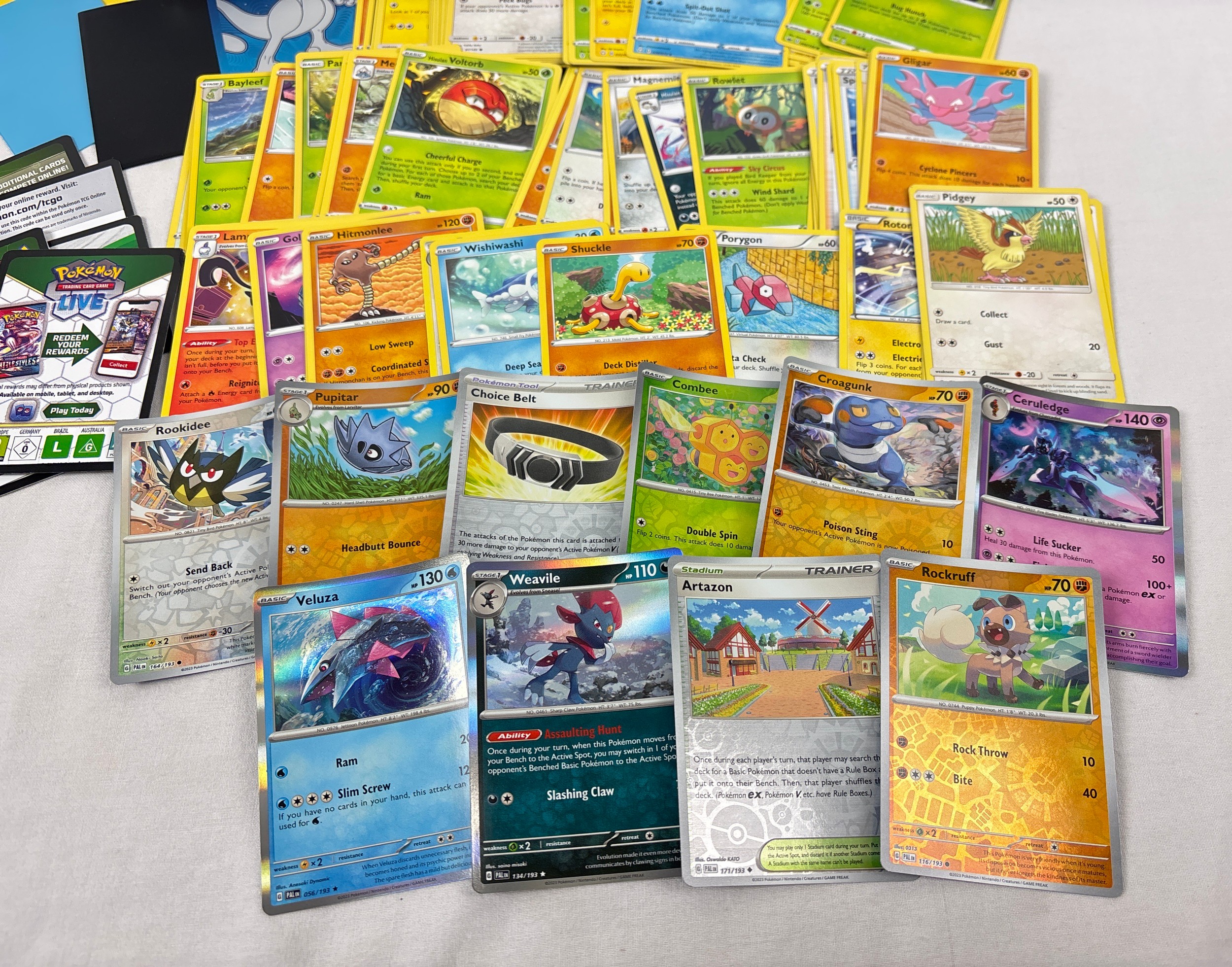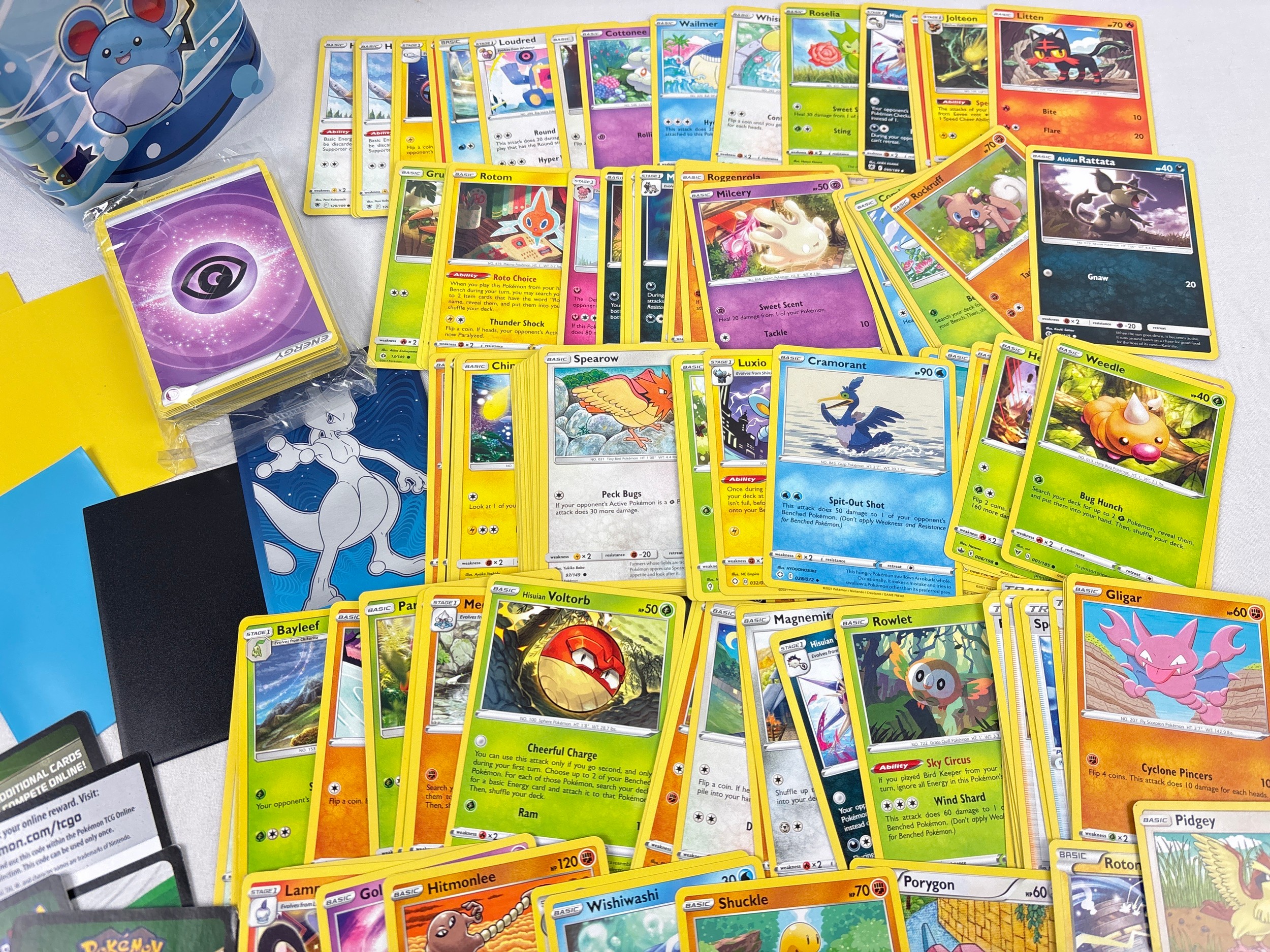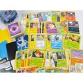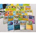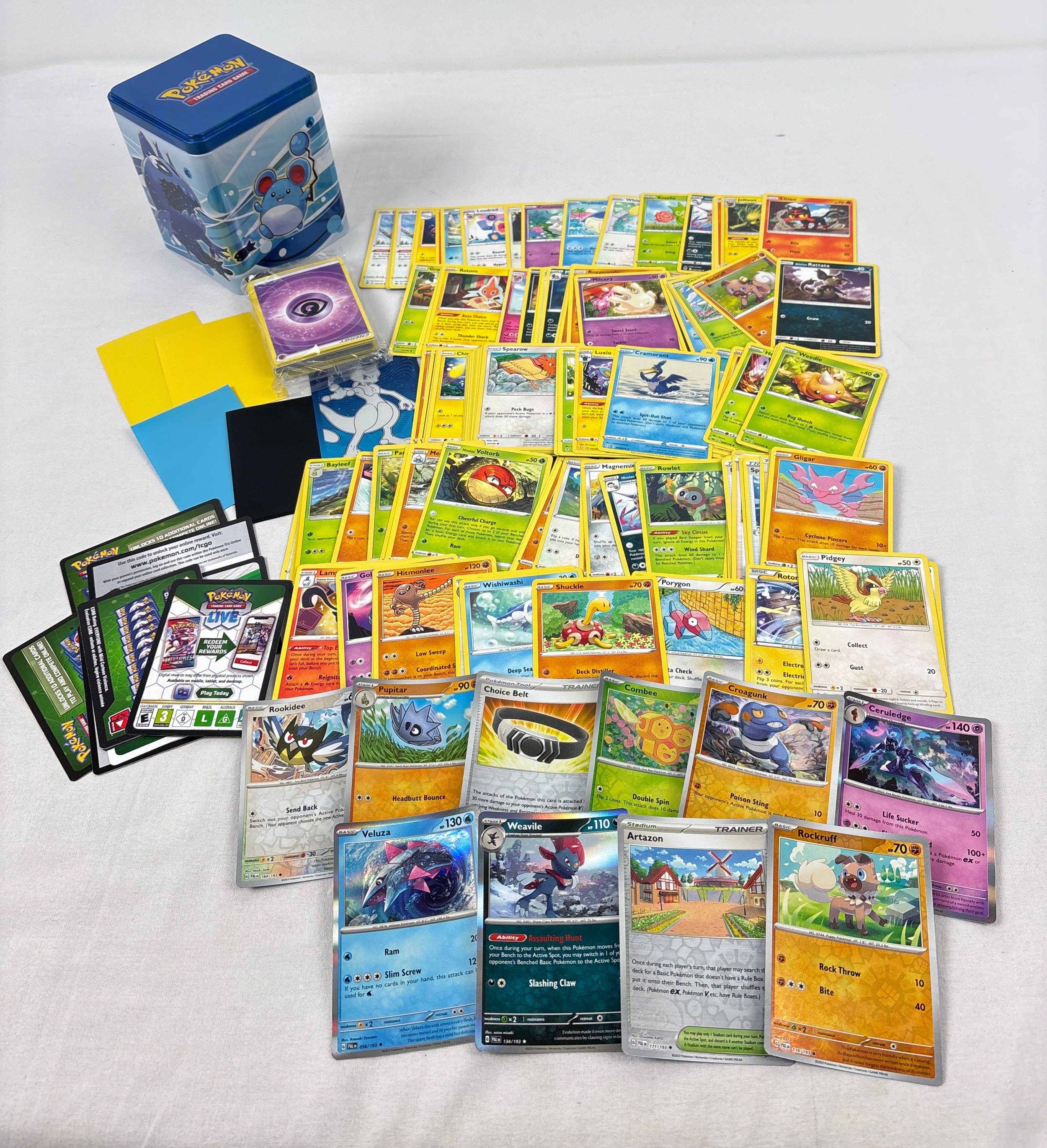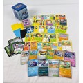 A water (blue) Pokémon stacking tin containing 200 assorted Pokémon cards & 5 card sleeves. Cards include 120 character cards, 10 Trainer cards, 10 holo's & reverse holo's, a sealed pack of energy cards and TCG online code cards.