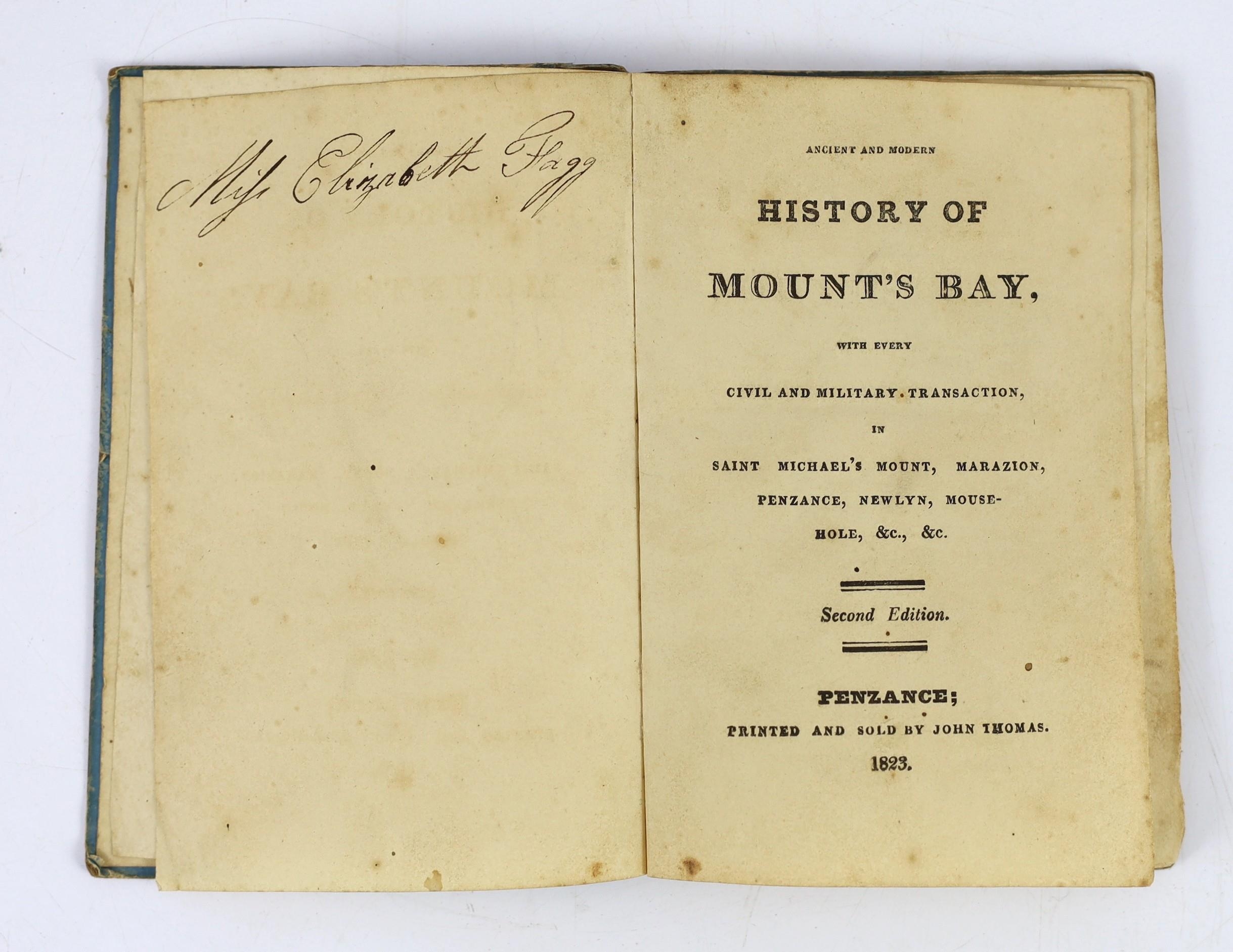 ° ° CORNWALL: Ancient and Modern History of Mount's Bay ... Saint Michael's Mount, Marazion, Penzance, Newlyn ... 2nd edition. original paper backed marbled boards, 12mo. Penzance, 1823; A Guide to the Mount's Bay and the Land's End ... By a Physician. 2nd edition. pictorial engraved and printed titles, frontis, and text engravings; old gilt half calf and marbled boards with panelled spine, sm. 8vo. 1824 (2)
