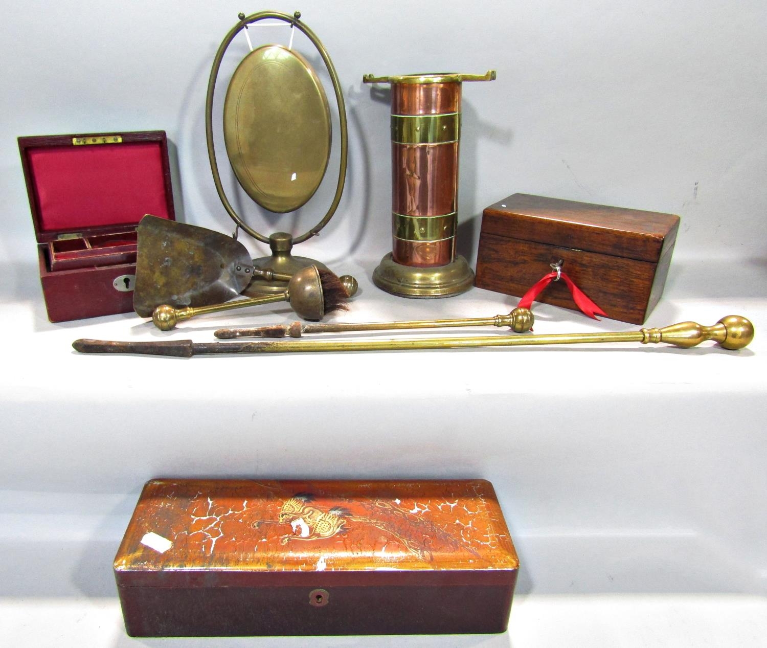 A lacquered glove box, a rosewood box, leather jewel box, brass table gong, etc