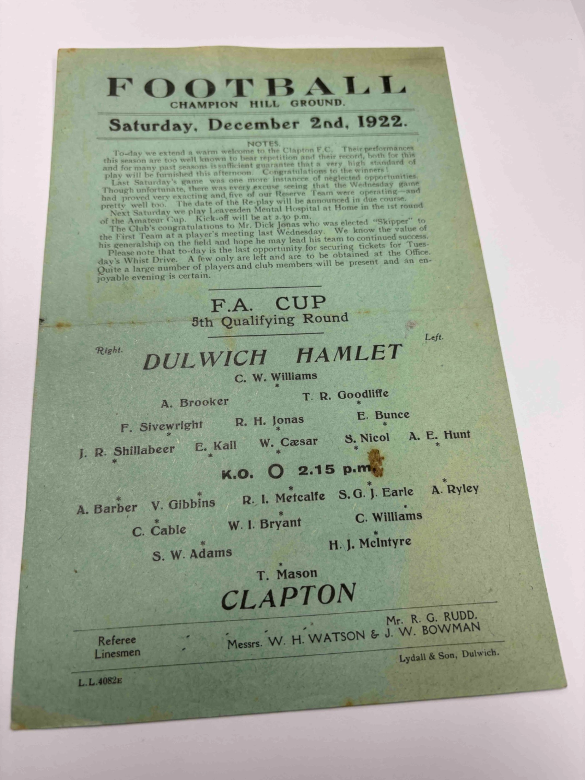 1922/3 Dulwich Hamlet v Clapton FAC, fold and marks