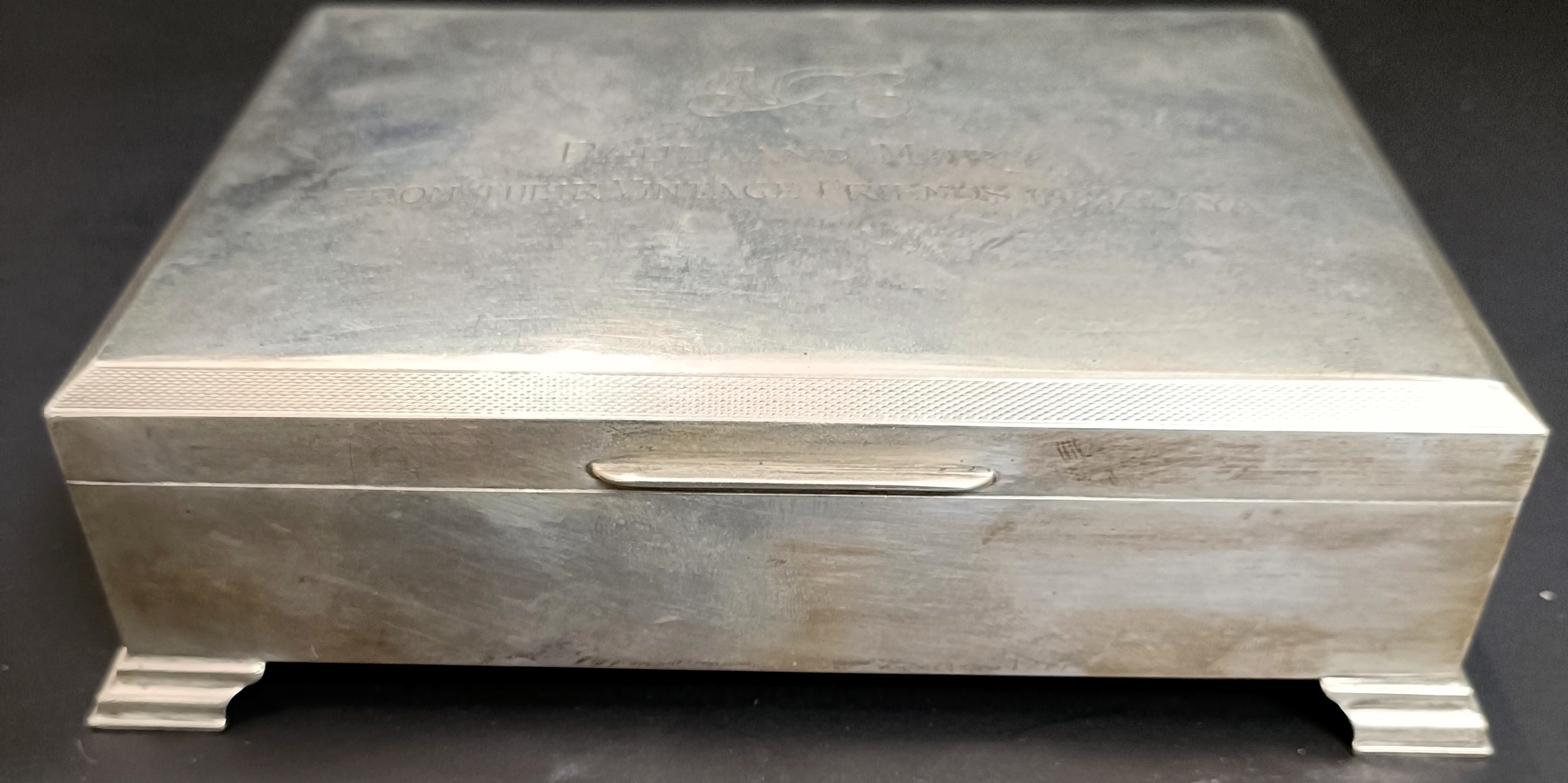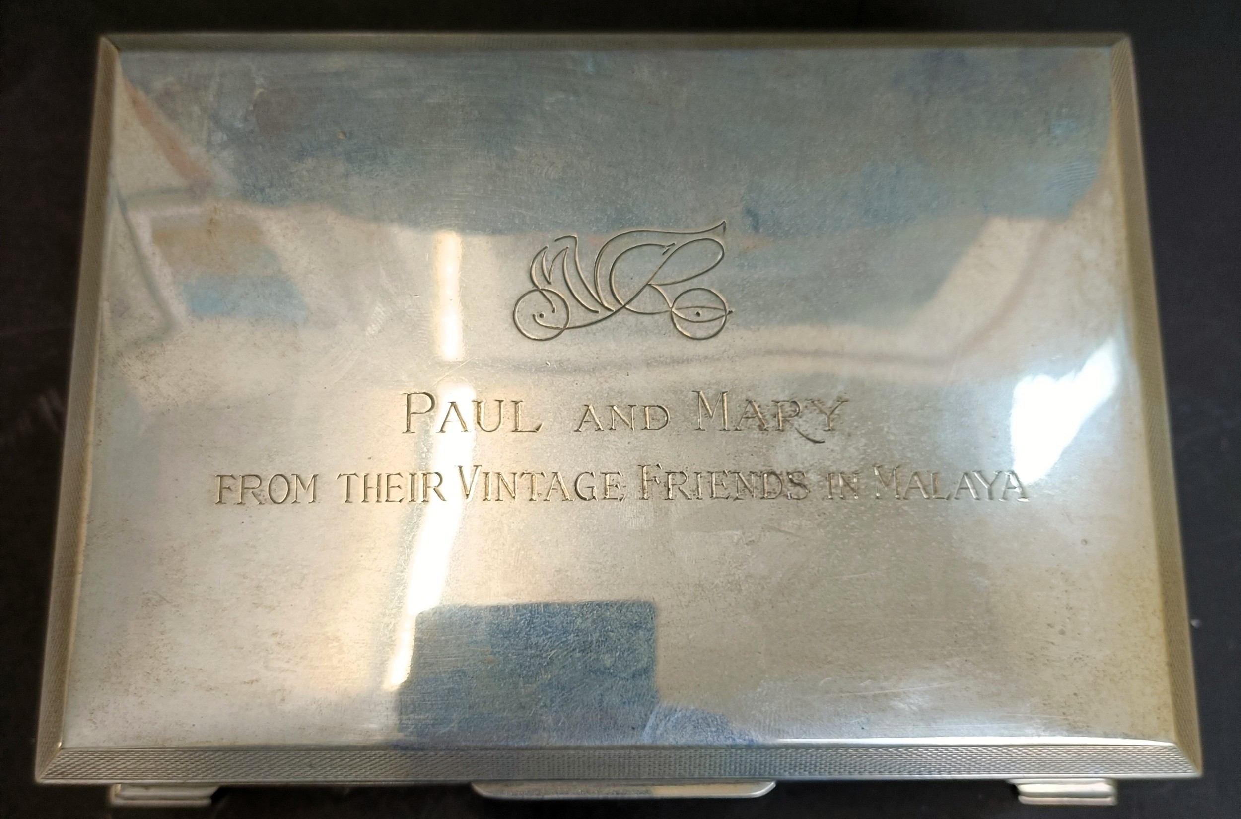 An Elizabeth II silver cigarette case, engraved Malayan Vintage Car Register Paul & Mary From Their Friends in Malaya, Birmingham 1958, 17 cm wide, sold with a letter from the Malayan Vintage Car Register