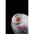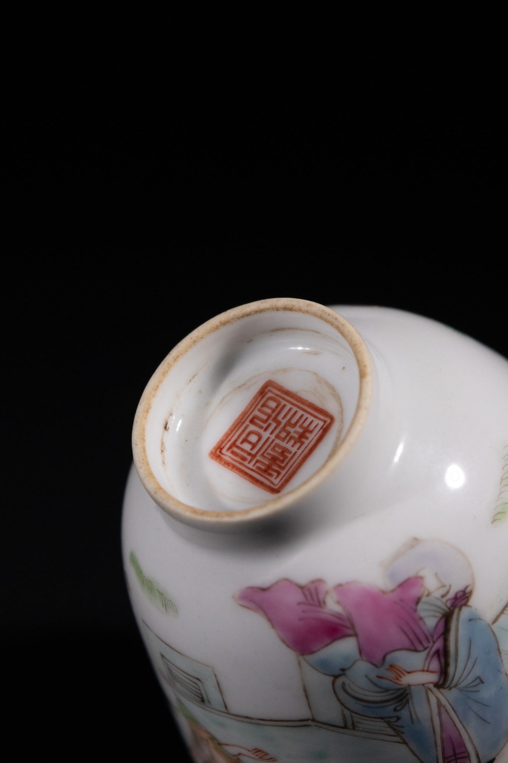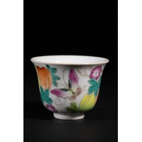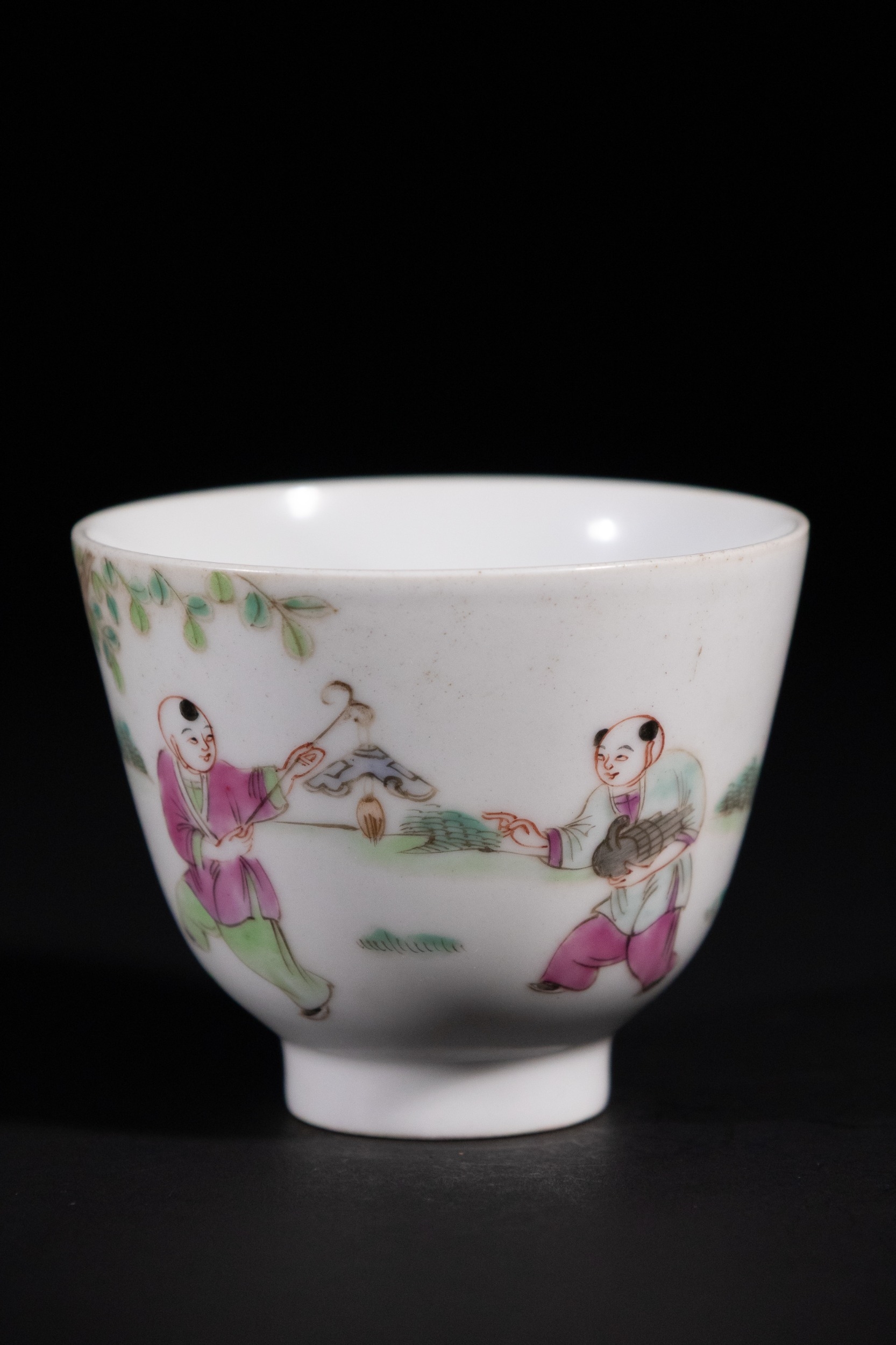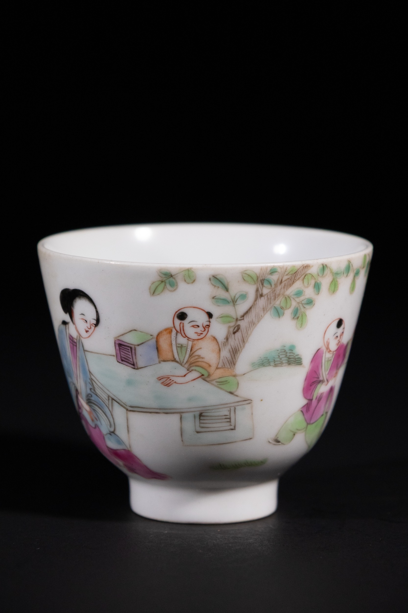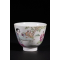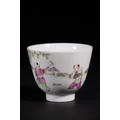 A Chinese Famille Rose Porcelain 'Figure Story' Cup, Tongzhi Mark - A Chinese Famille Rose porcelain cup, decorated with a continuous narrative scene of multiple figures in an outdoor setting with trees and landscape elements. The vibrant polychrome enamel palette predominantly features shades of pink, green, blue, and orange. The recessed base bears a square red seal mark, '同治年製' (Tongzhi Nian Zhi), indicating it was made during the Tongzhi reign (1861-1875).