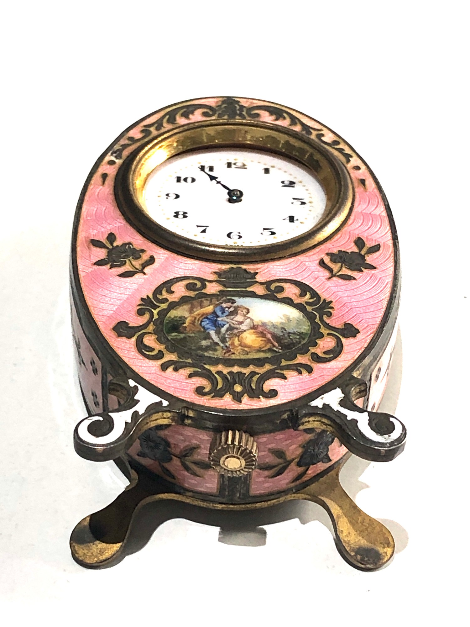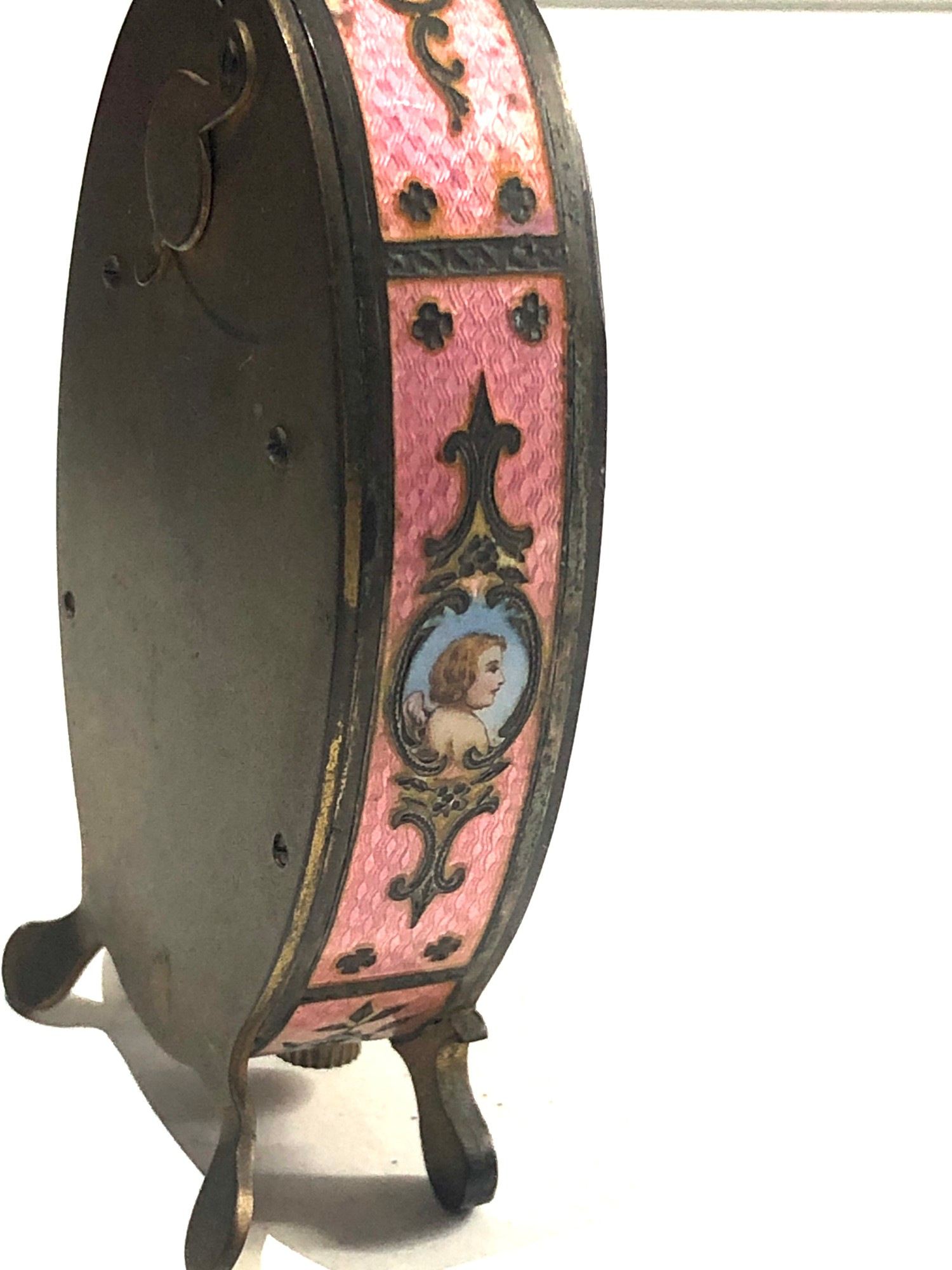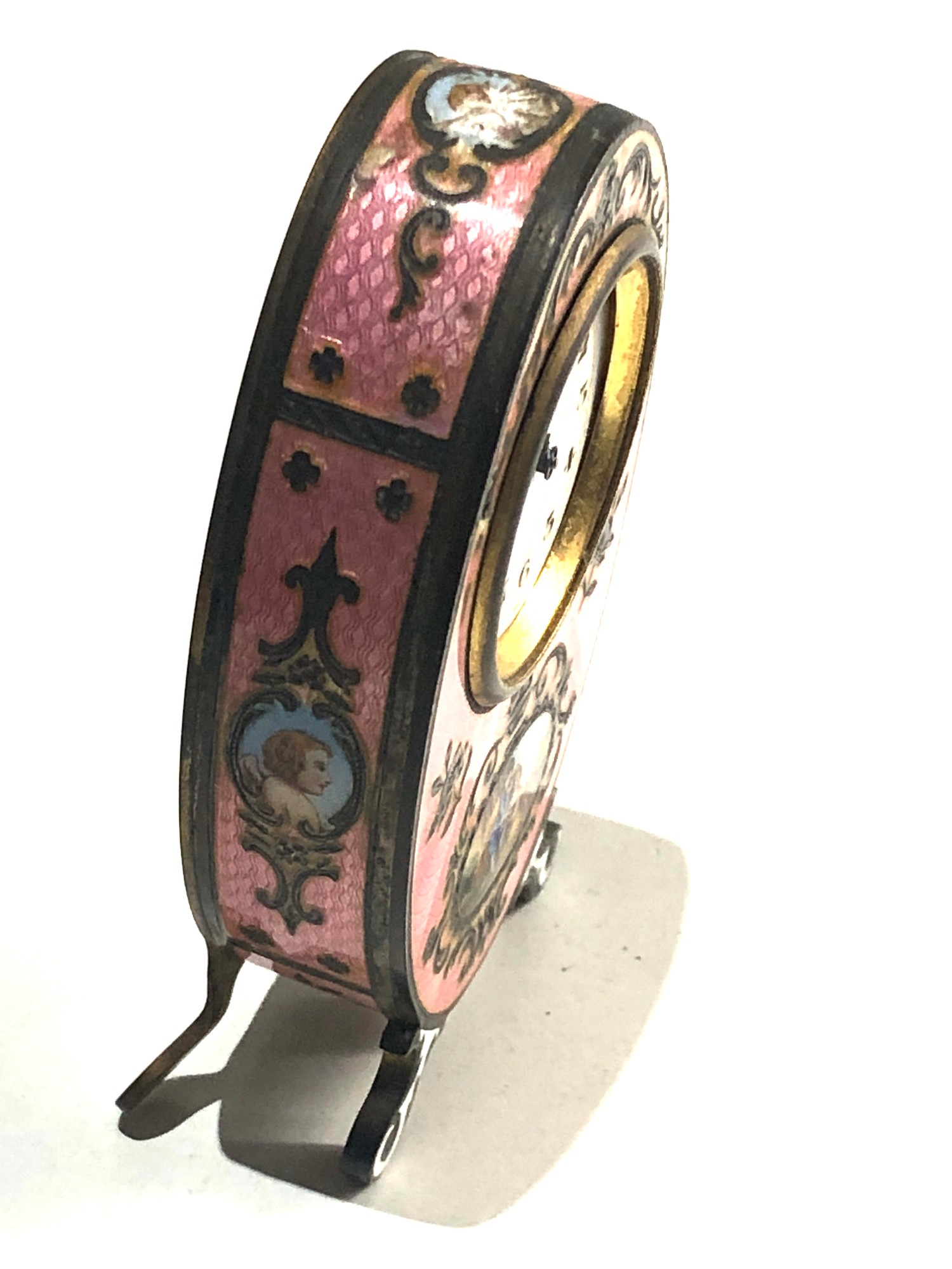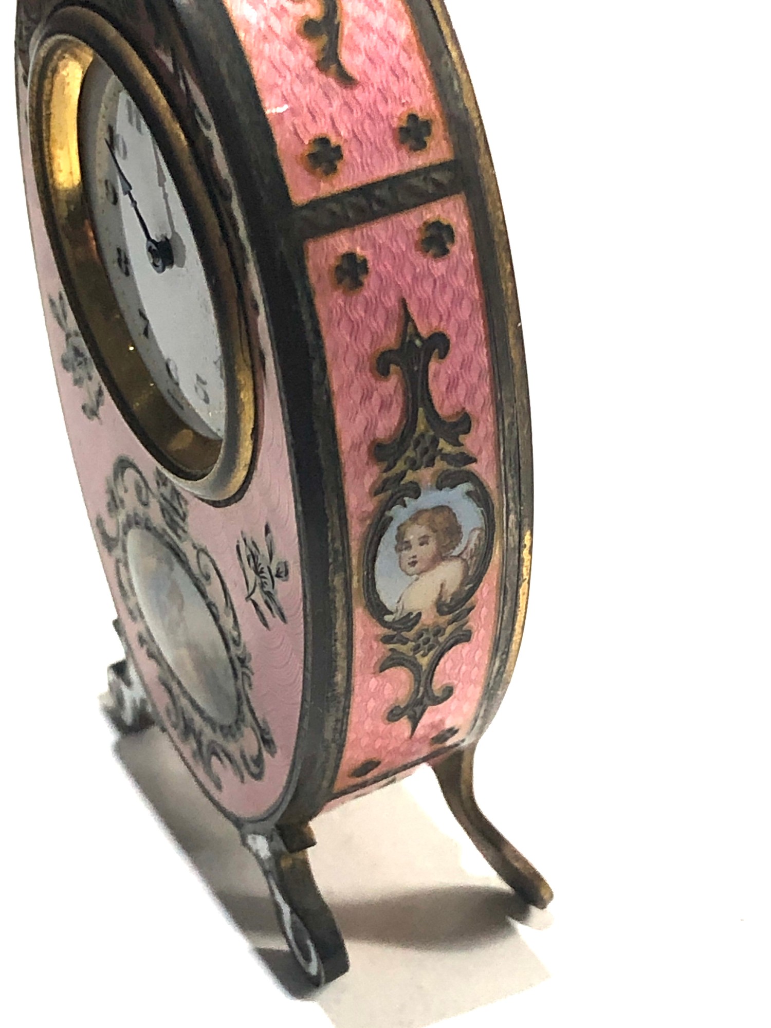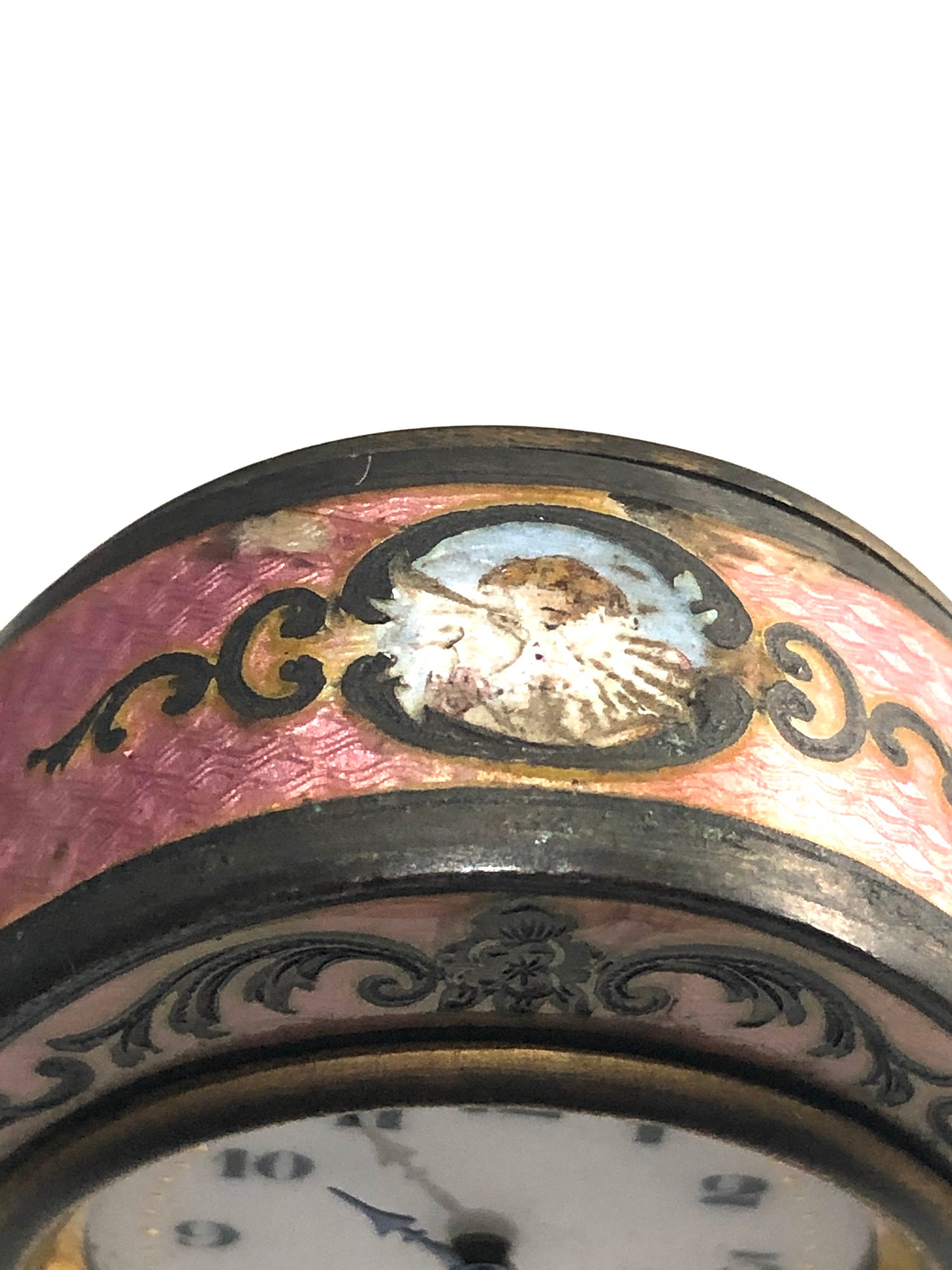 19th century pink guilloche enamel boudoir desk clock with cherub panels and Watteauesque panel of lovers to front of case the clock is hand wound some chipping of enamel requires a watch crystal and winding pinion is broken measures approx 7.7cm tall 4.5cm wide missing hand non working order