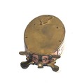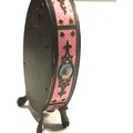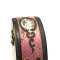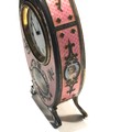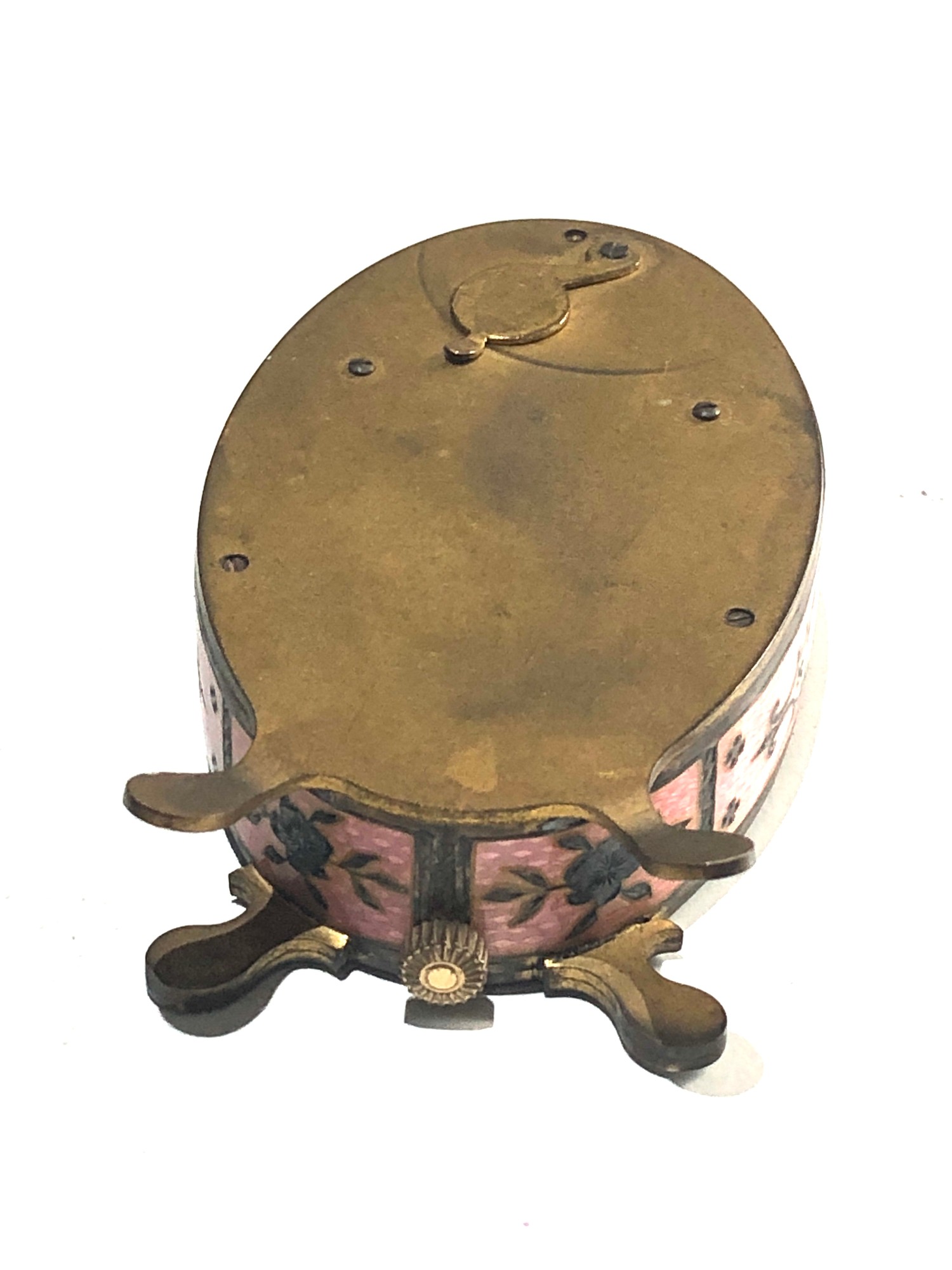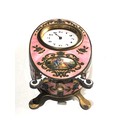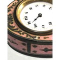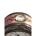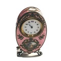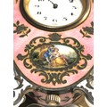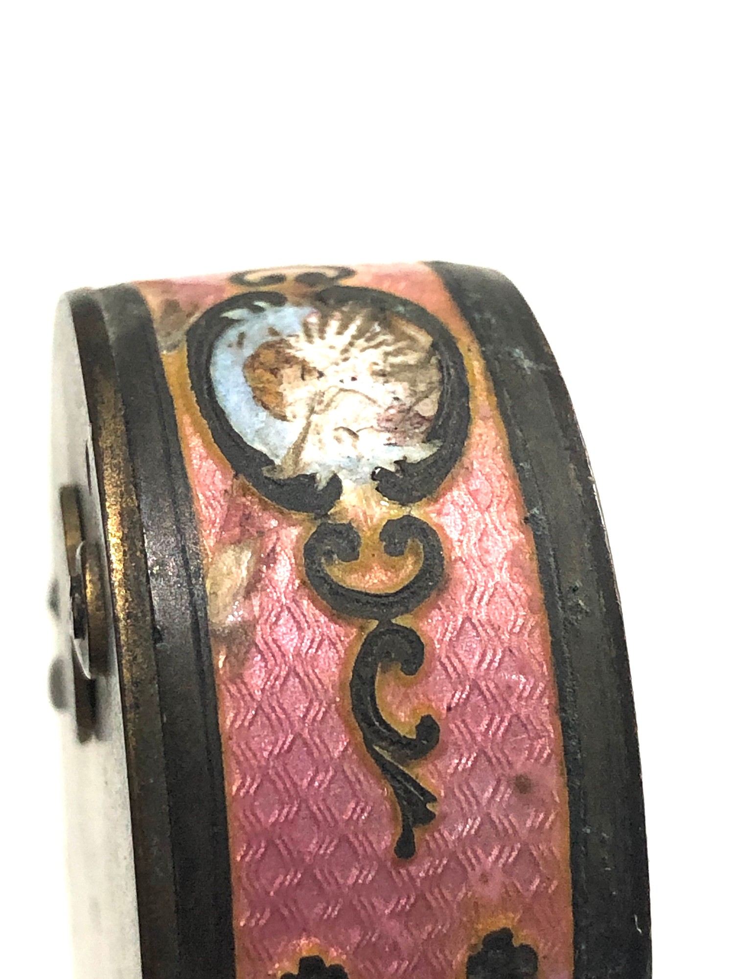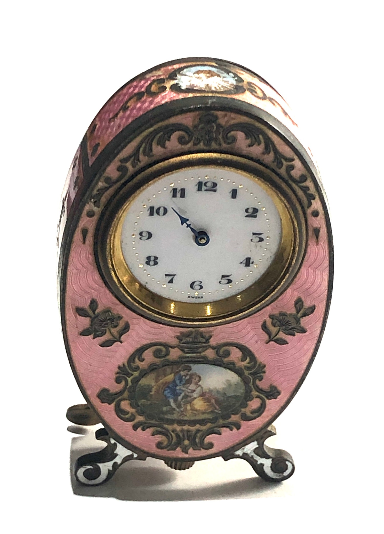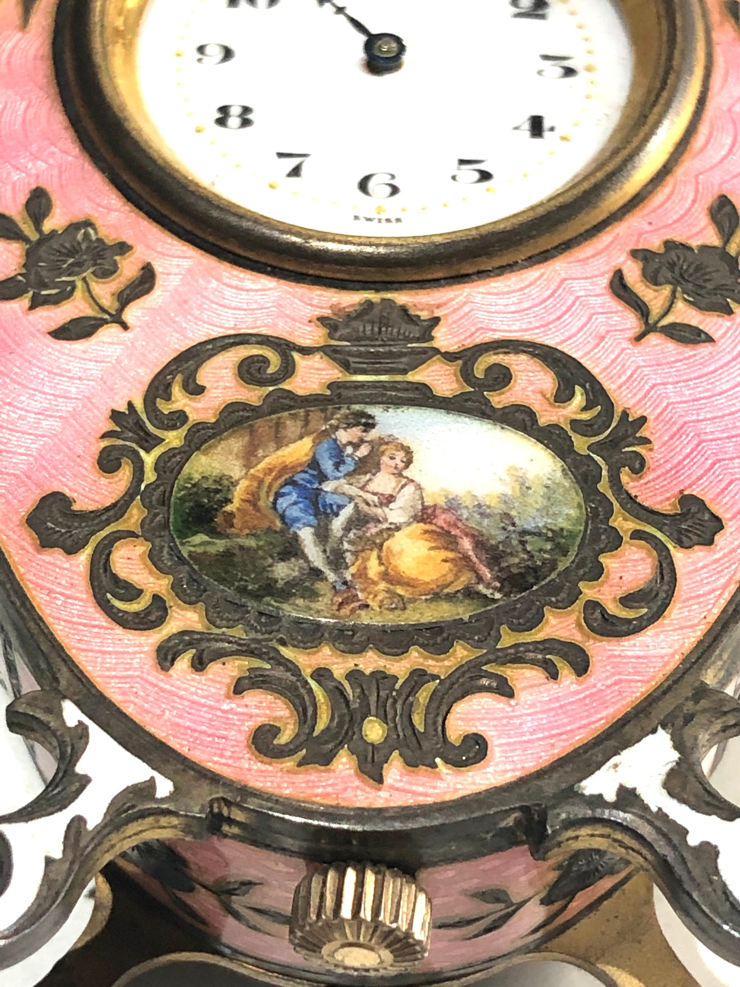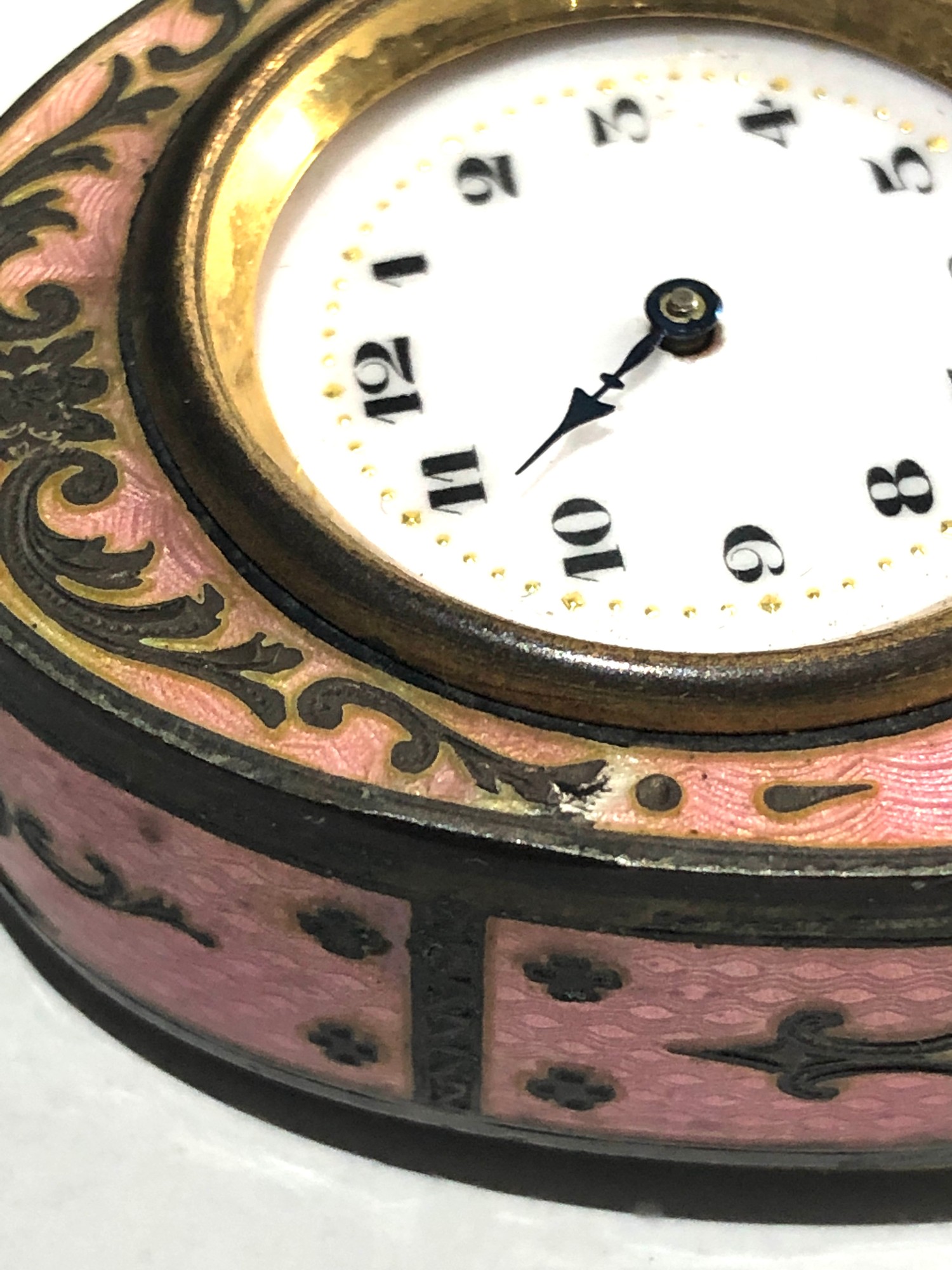 19th century pink guilloche enamel boudoir desk clock with cherub panels and Watteauesque panel of lovers to front of case the clock is hand wound some chipping of enamel requires a watch crystal and winding pinion is broken measures approx 7.7cm tall 4.5cm wide missing hand non working order