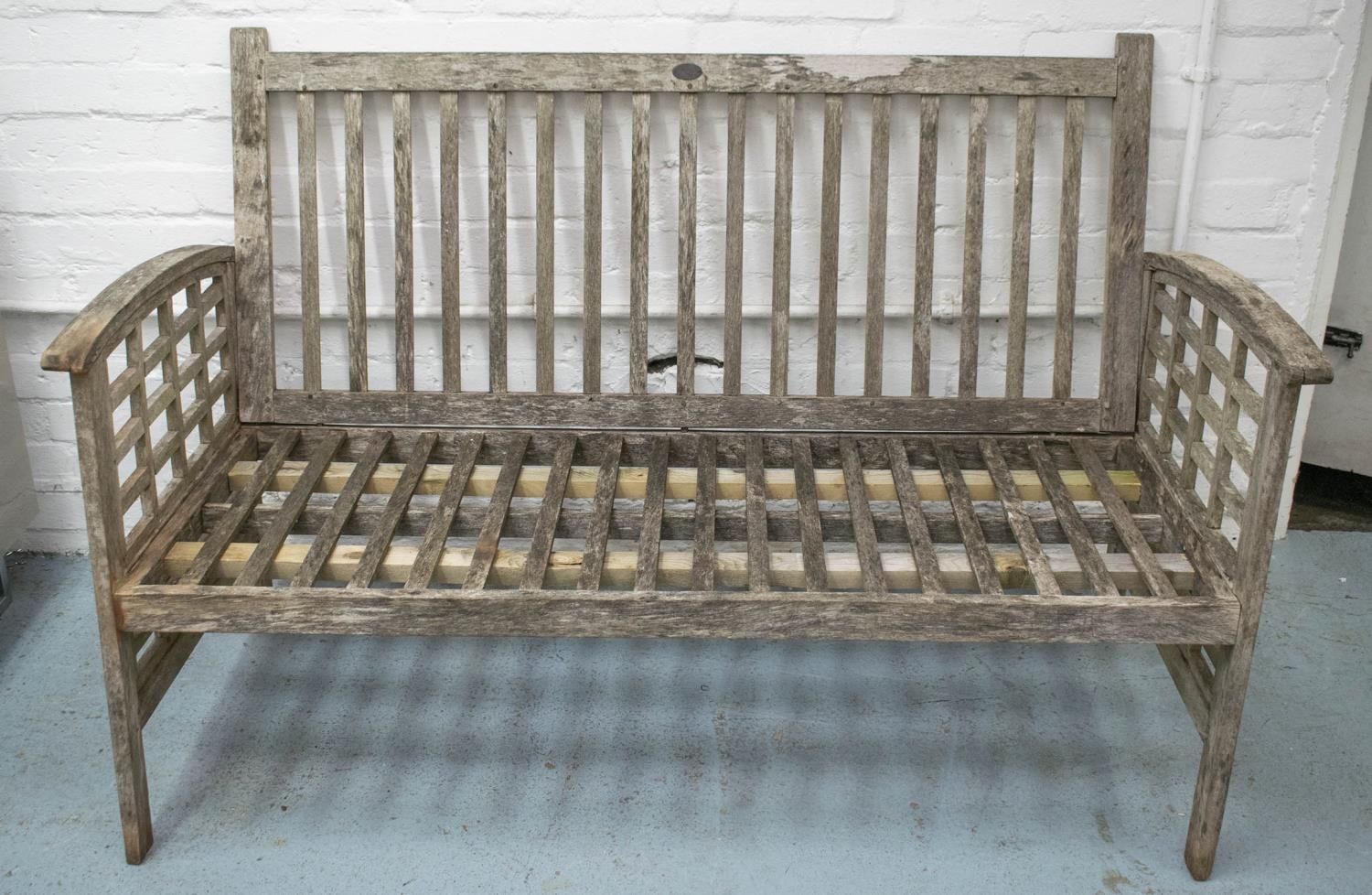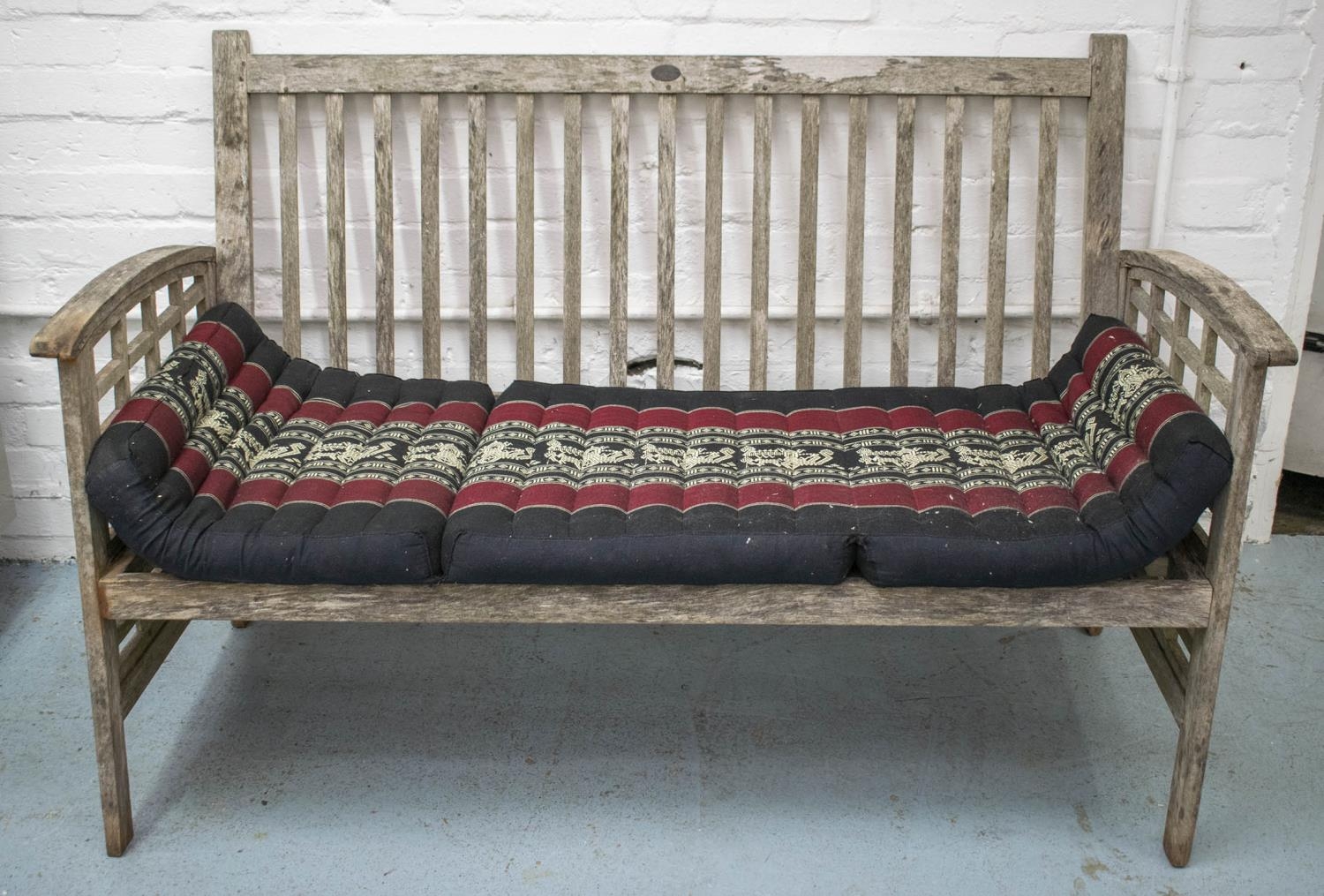 FIRMAN GARDEN BENCH, weathered teak with black and red squab cushion, 140cm W.