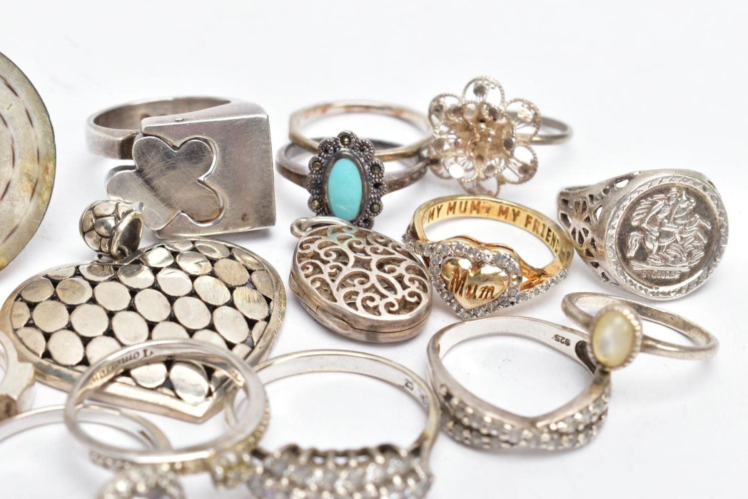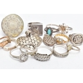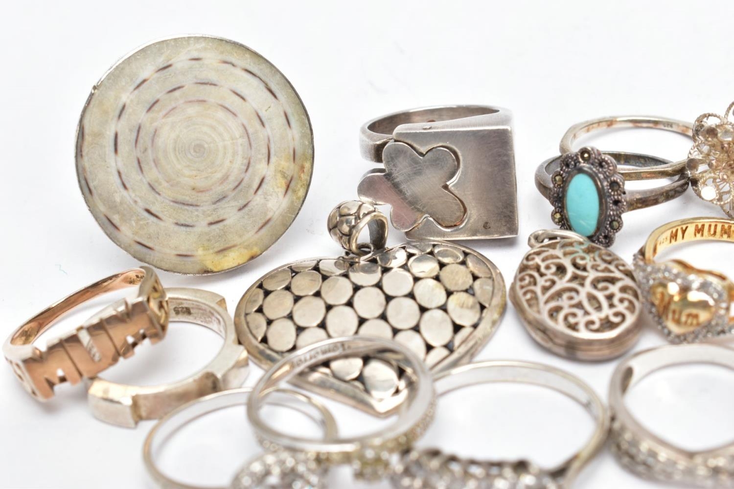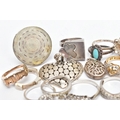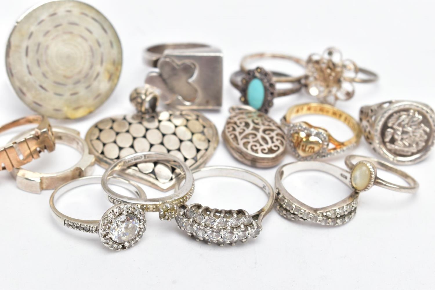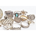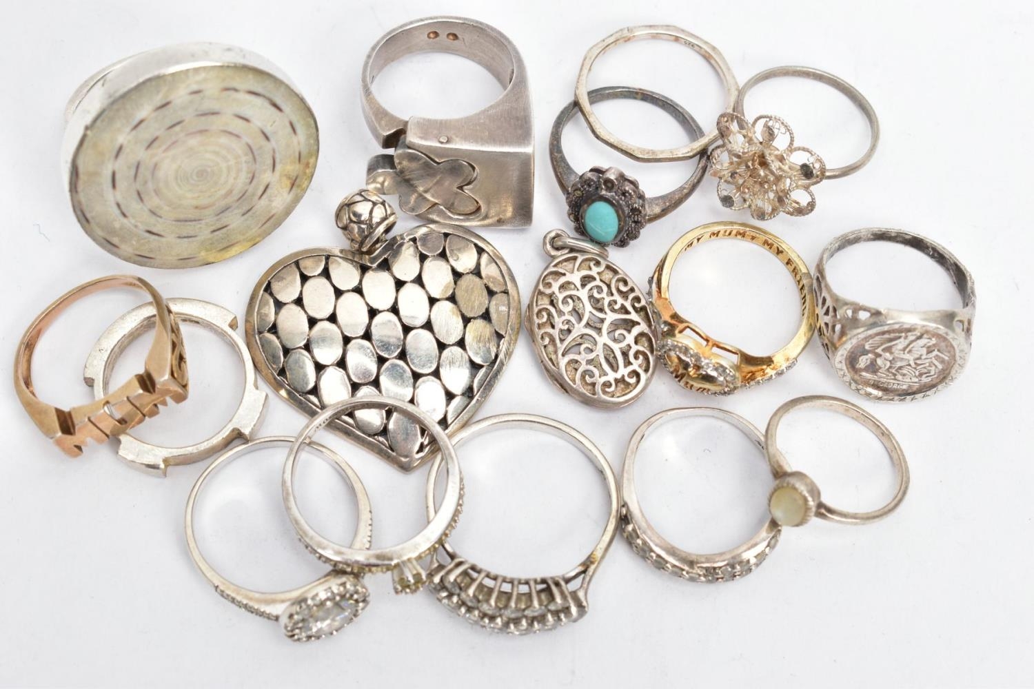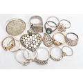 AN ASSORTMENT OF WHITE AND YELLOW METAL JEWELLERY, to include twelve white metal rings, two yellow metal rings and two pendants,