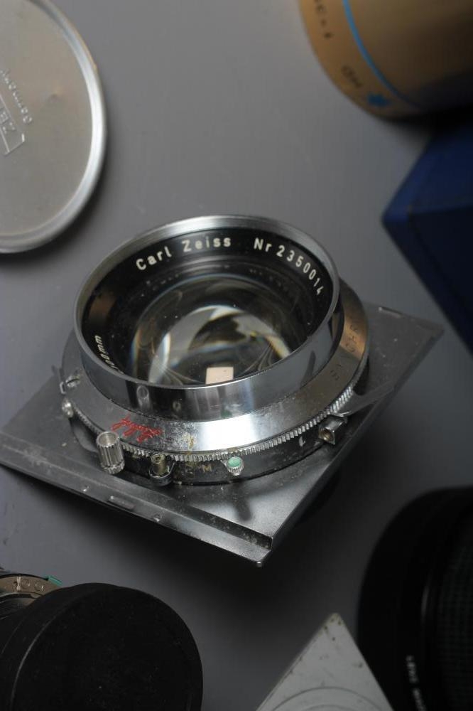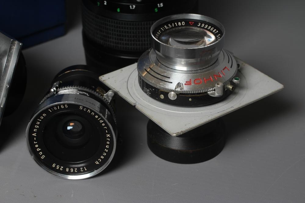 FIVE CAMERA & OTHER LENSES, comprising an Isco-Optic Ultra-Star HD f=35mm - 1.38in. 1c, a Carl Zeiss Planar 1:2,8 f=100mm, a Linhof Super-Angulon 1:8/65, a Linhof Tele-Xenar 1:5.5/180, and a Zenza Bronica 1:3.5 f=150mm lens, together with a Linhof hood (6) (Est. plus 24% premium inc. VAT)
