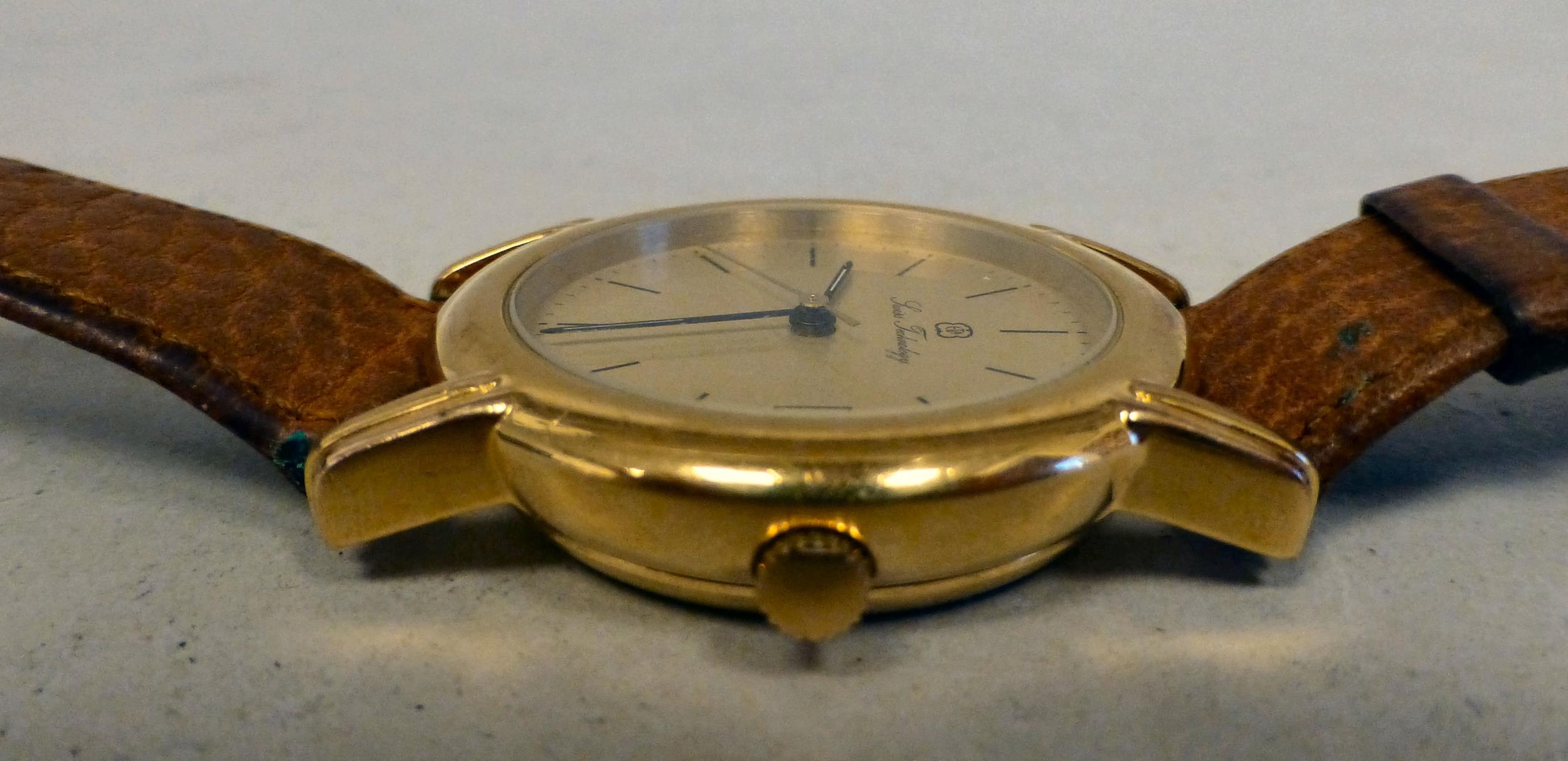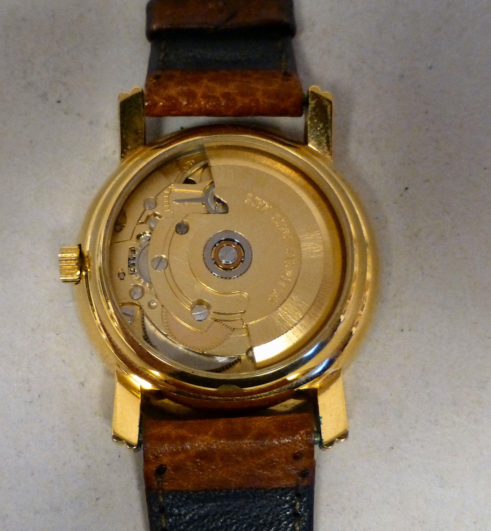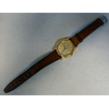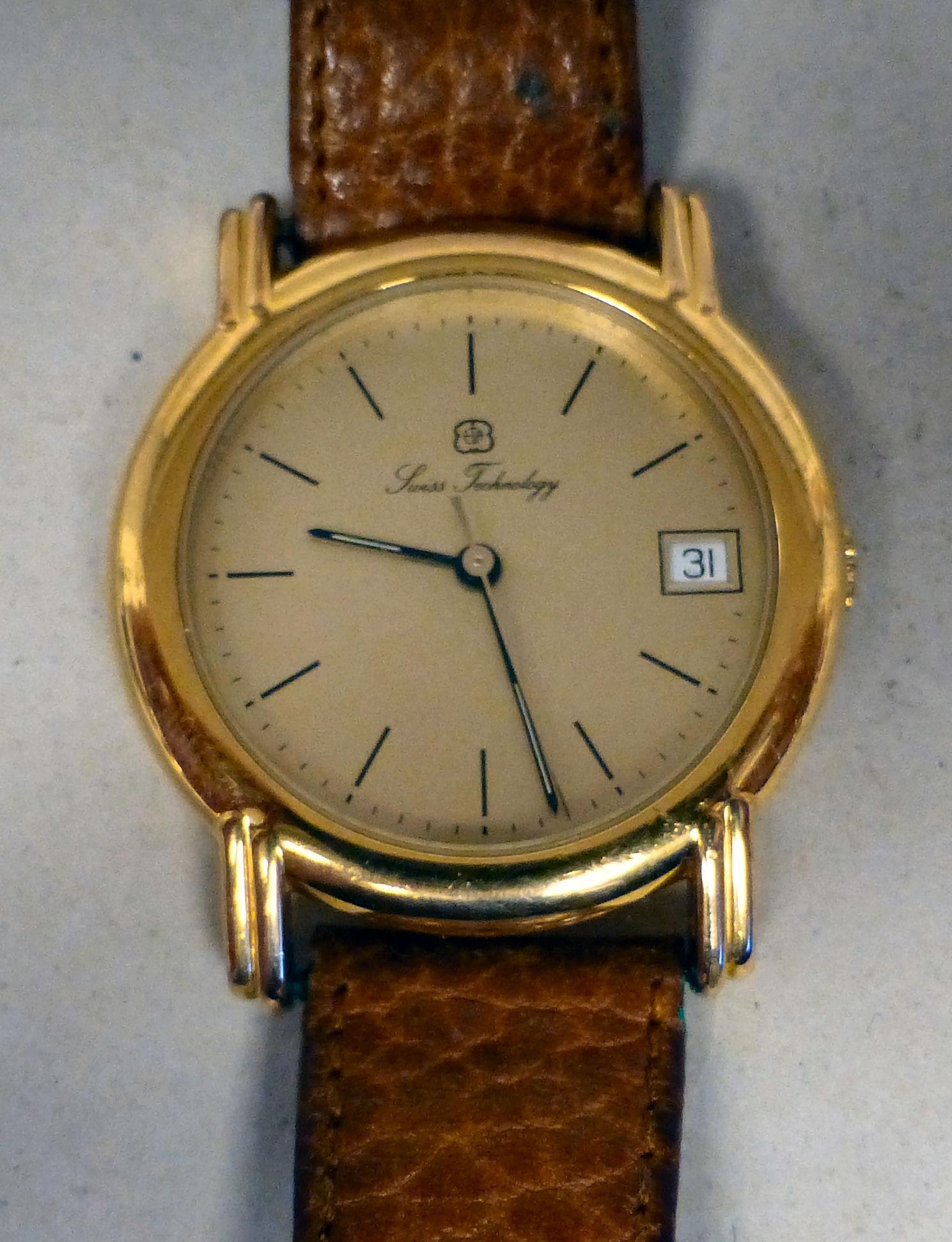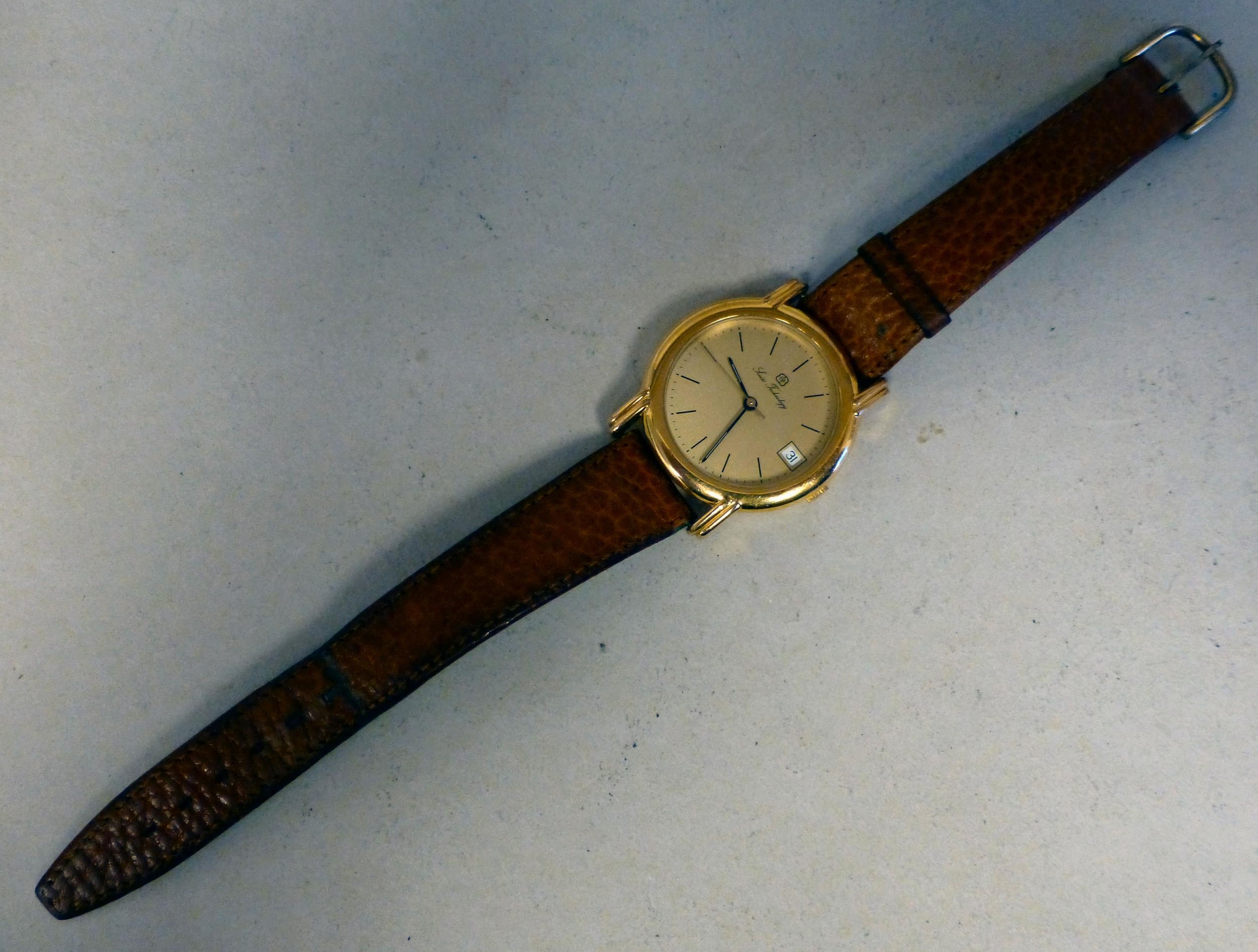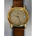 An ETA Swiss Technology, gold plated automatic wristwatch, faced by a baton dial and date aperture