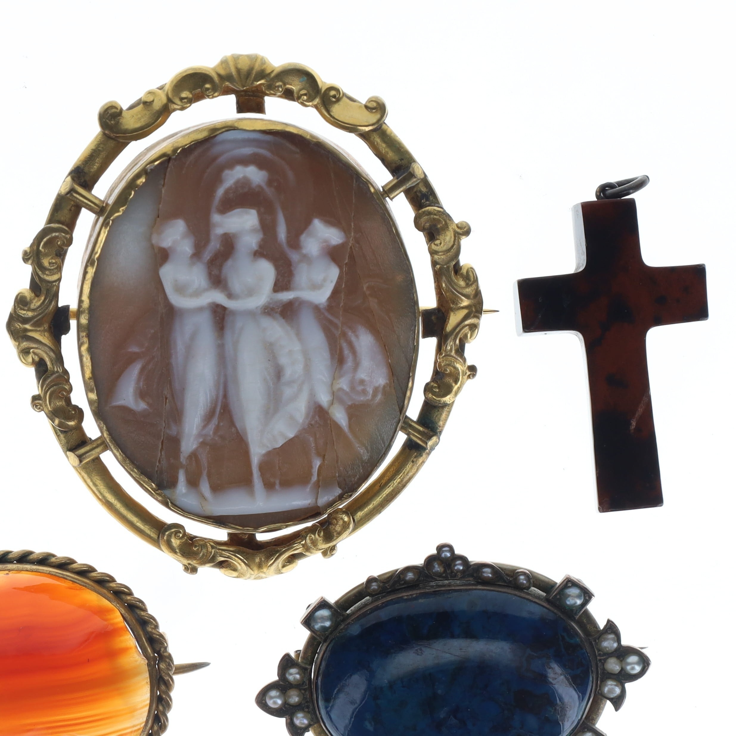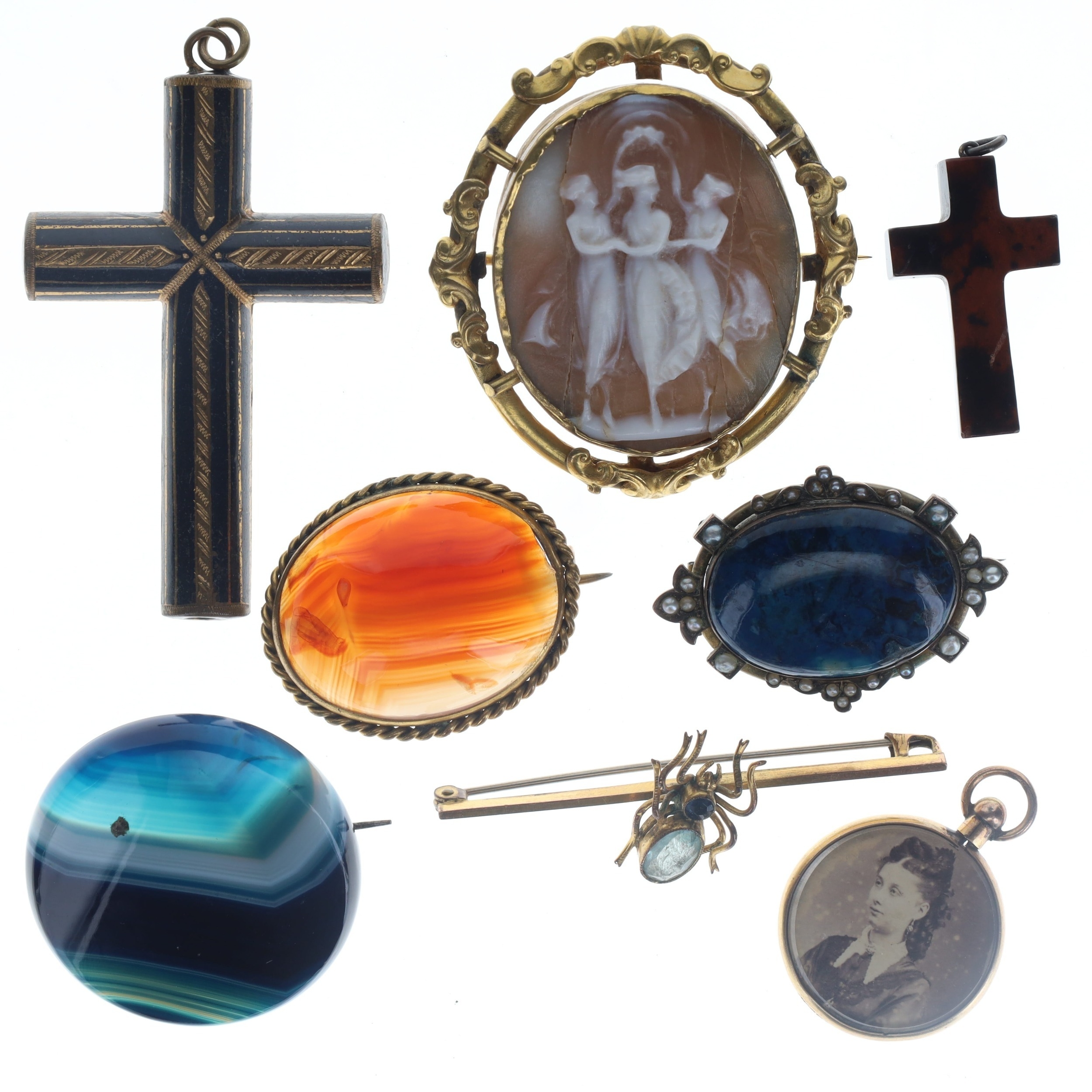 Antique Rolled Gold Jewellery Collection incl. Victorian, Mourning, Three Graces, Split Pearl, Agate. All items are in good condition with some plate wear, all stones are intact. Weighs in total 83g