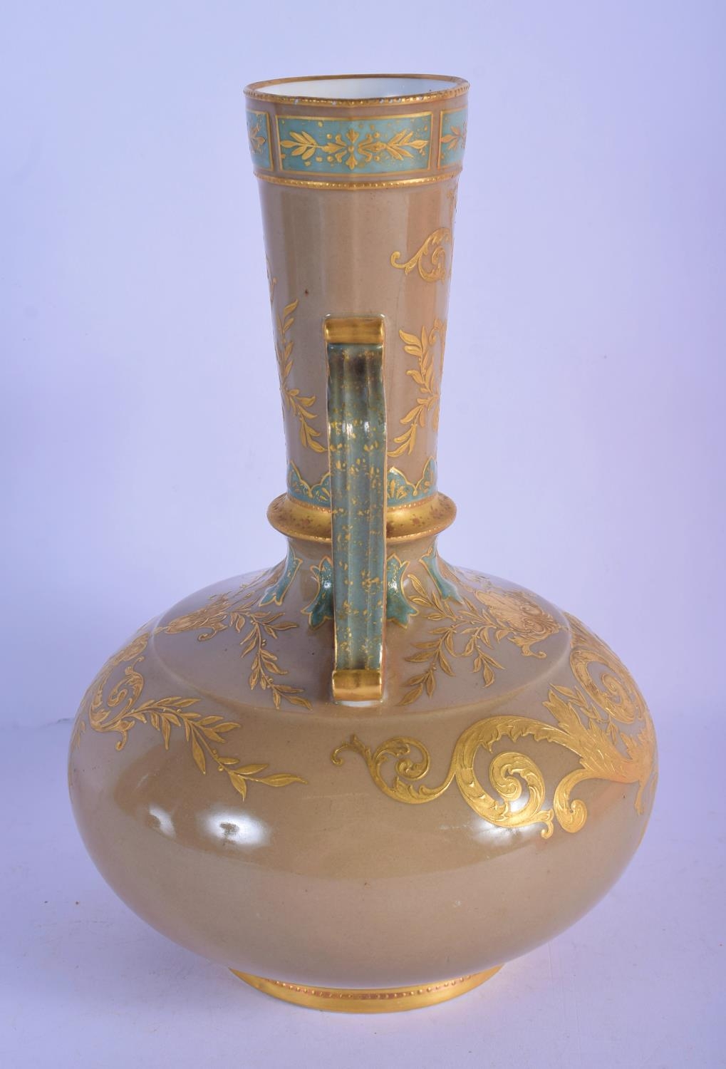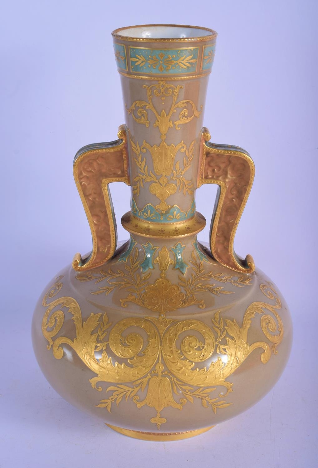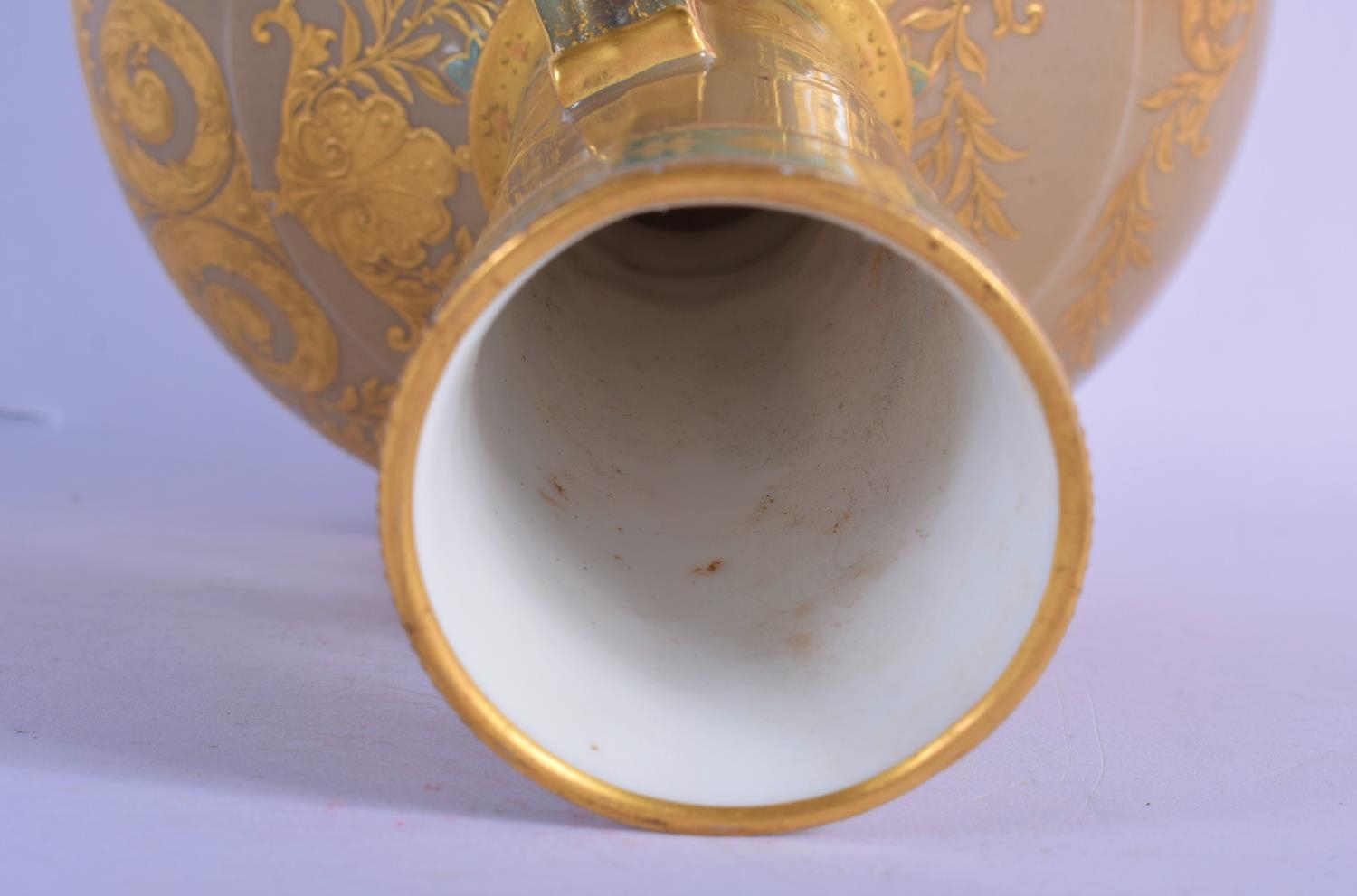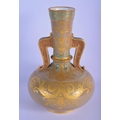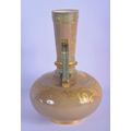 A 19TH CENTURY EUROPEAN TWIN HANDLED PORCELAIN VASE enamelled in relief with gilt flowers. 26 cm x 12 cm.