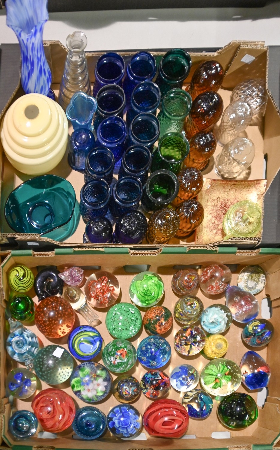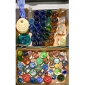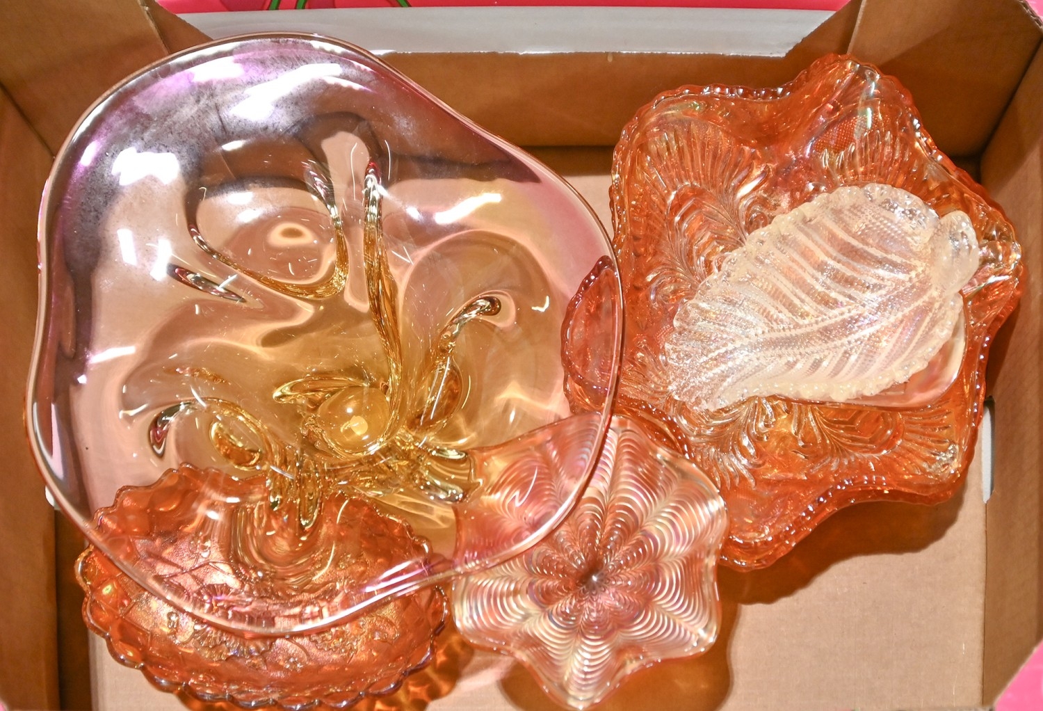 Miscellaneous decorative and coloured glassware to include Carnival glass, Bohemian free form bowl, paperweights etc