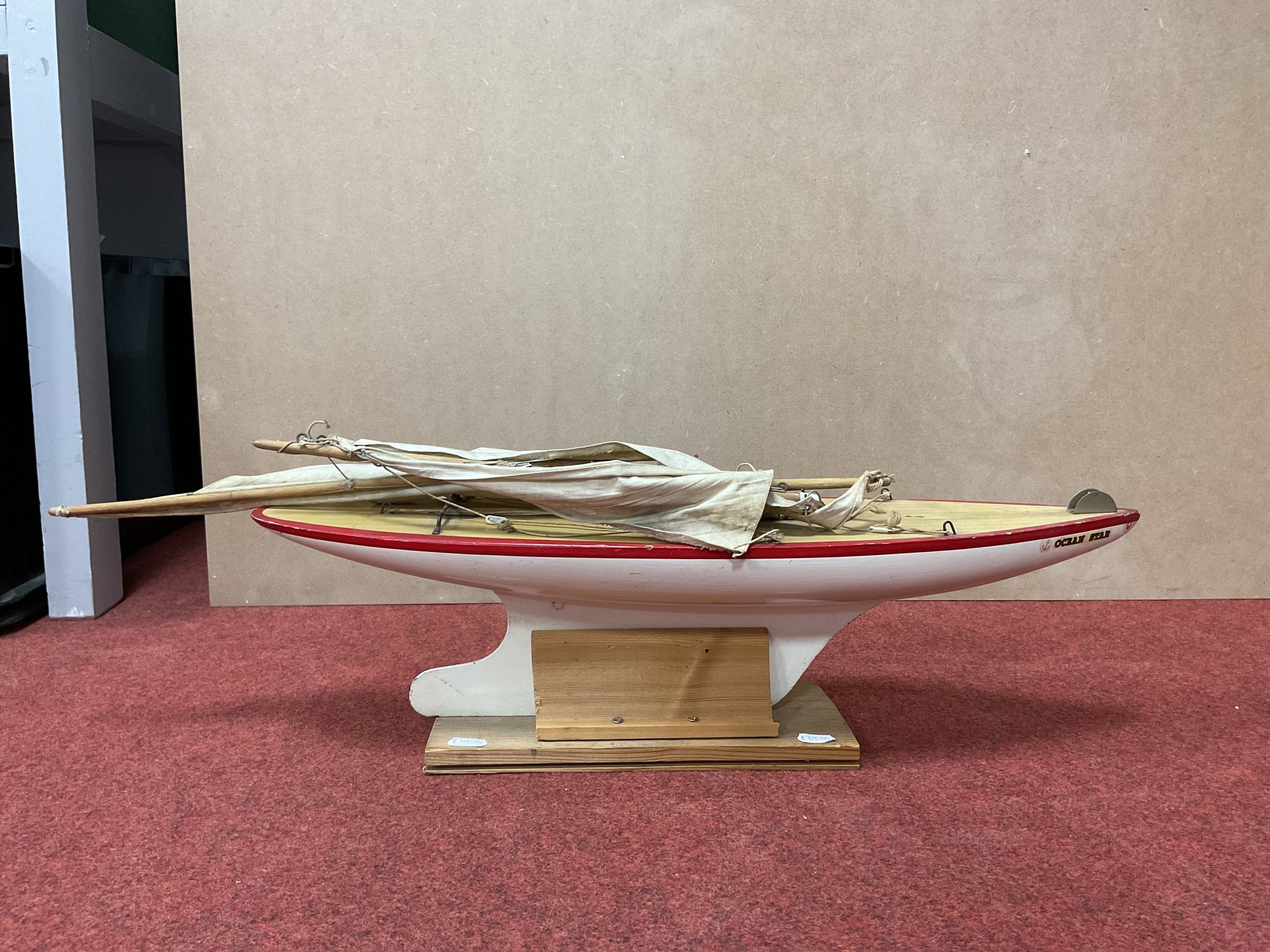 A Pond Yacht by Star Yacht 'Birkenhead', 'Ocean Star', cloth sails, measuring approx 61cm length, playworn, some damage noted. With stand.