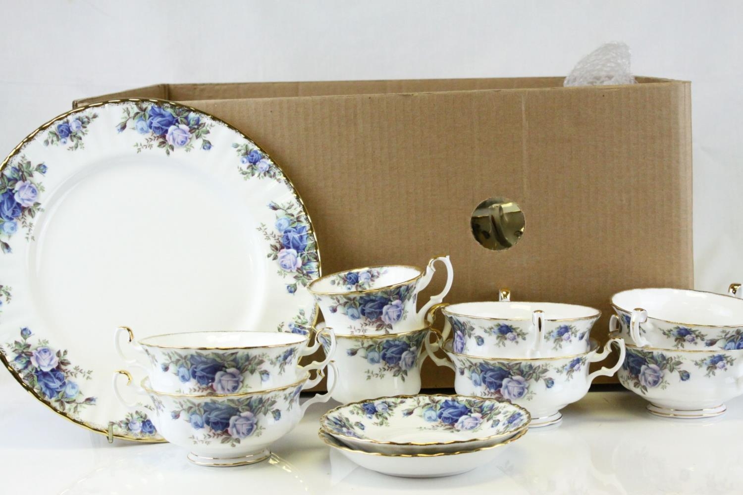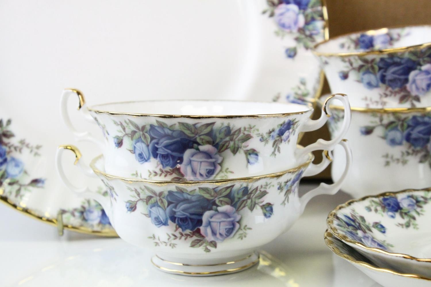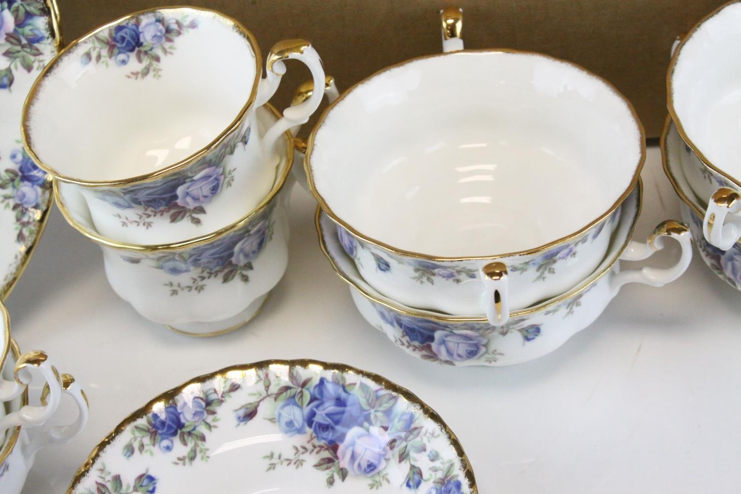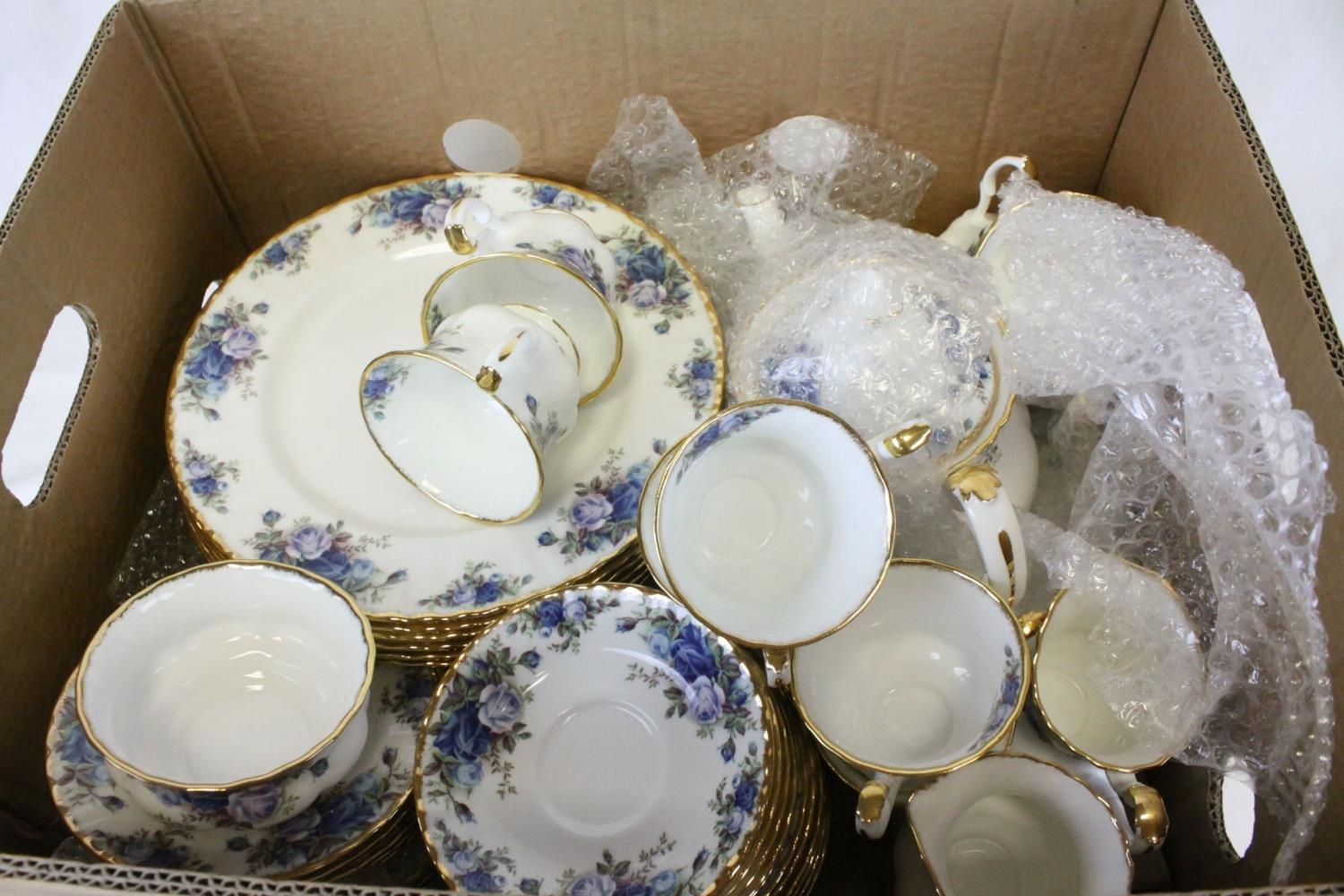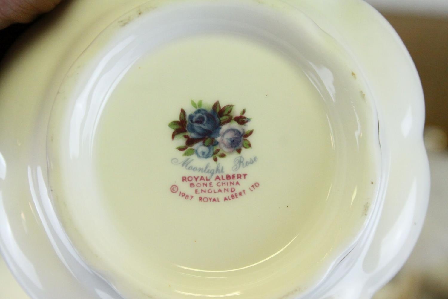Royal Albert ' Moonlight Rose ' Service including Teapot, 2 milk jugs, oval serving plate, 8 dinner plates, 7 breakfast plates, 9 side plates, 6 tea plates, sugar bowl, 6 fruit bowls, 10 saucers, 10 tea cups and 6 soup bowls