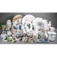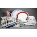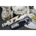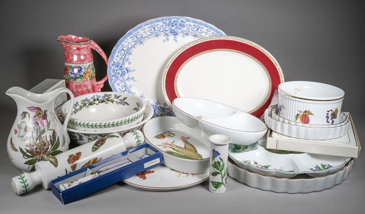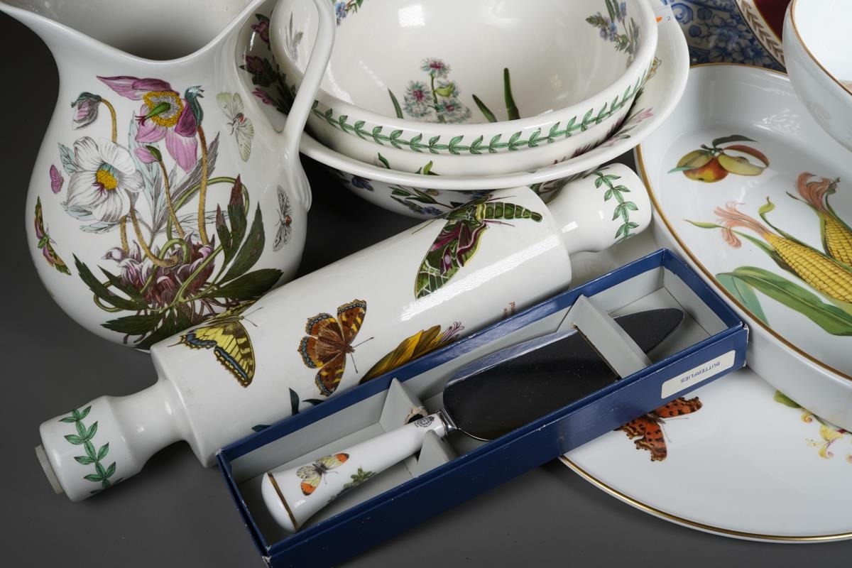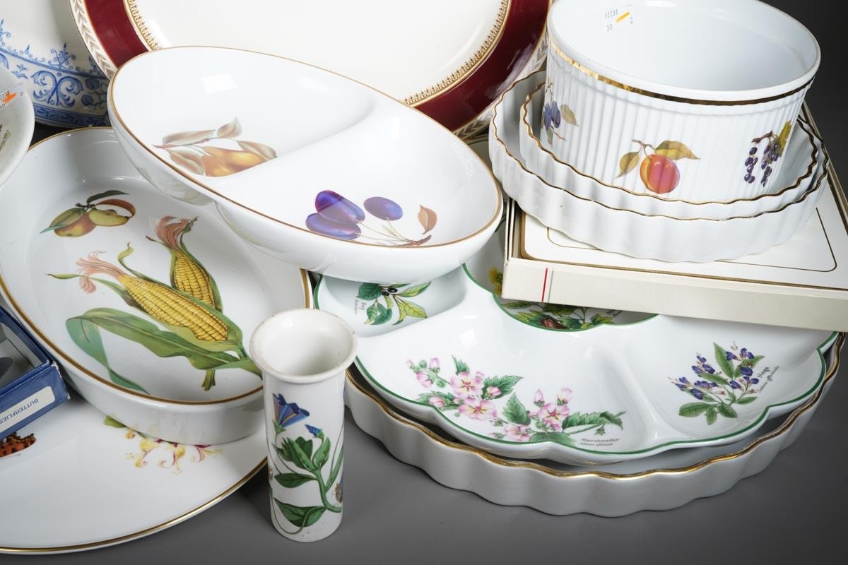 Two boxes of Royal Worcester Evesham pattern oven to table ware, a Royal Worcester Butterflies cake plate and slice, a Royal Worcester Herb pattern crudities dish, some items boxed, a small quantity of Portmeirion botanic Garden items, damaged Maling jug, etc (2 boxes)