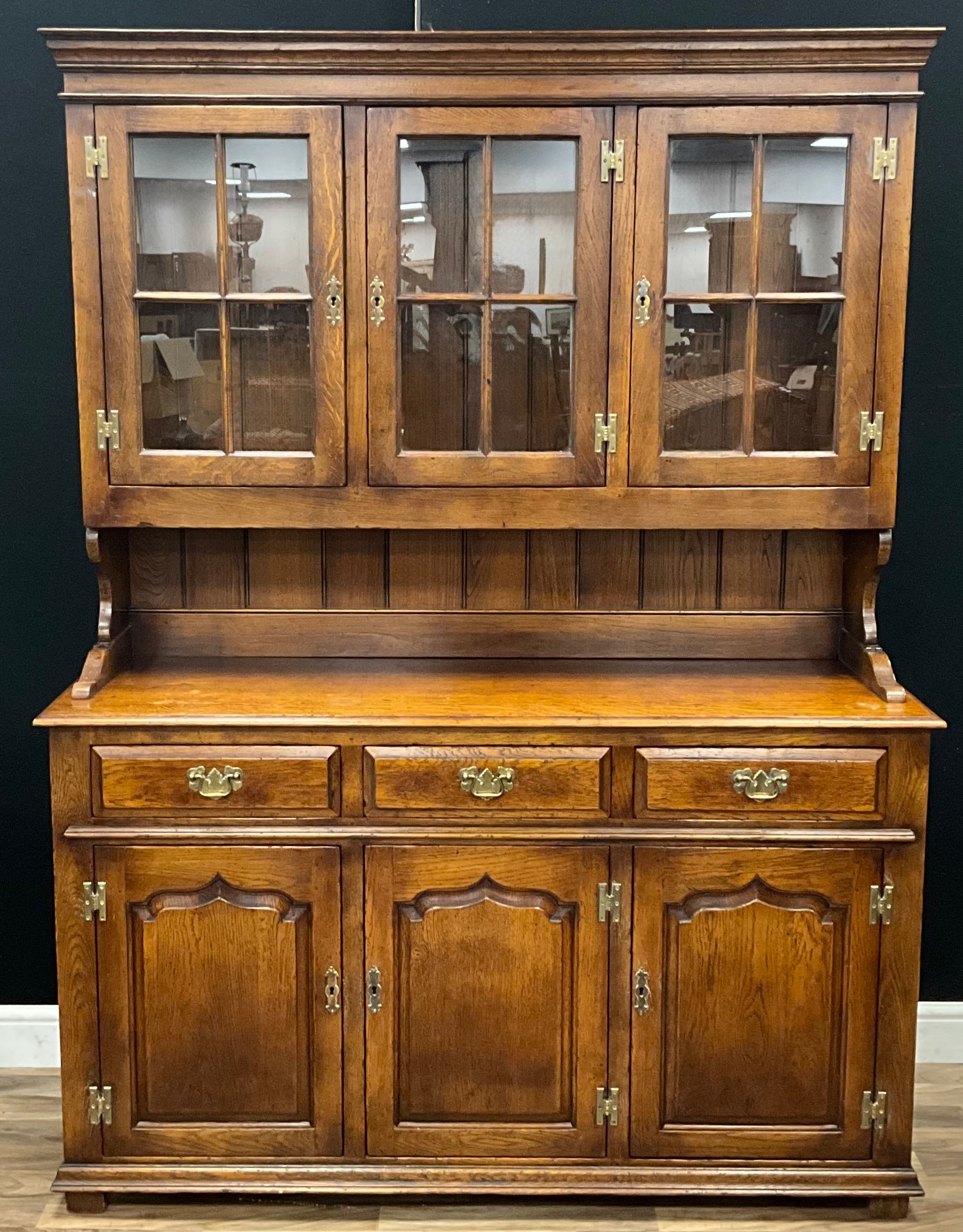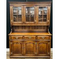 A late 20th century oak dresser in the manner of Titchmarsh and Goodwin, moulded cornice above three glazed cupboards enclosing fixed shelf, three short drawers to base above three cupboard doors with fixed shelf, 198cm high, 141cm wide, 46.5cm depth
