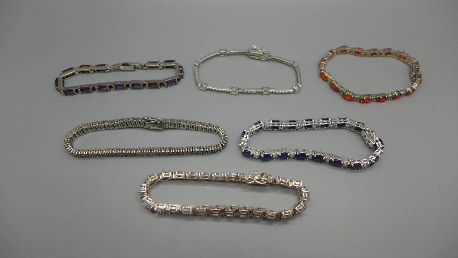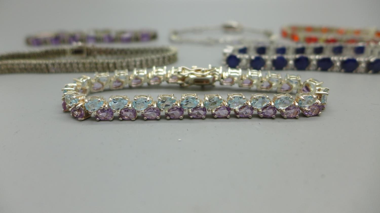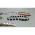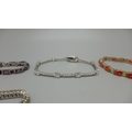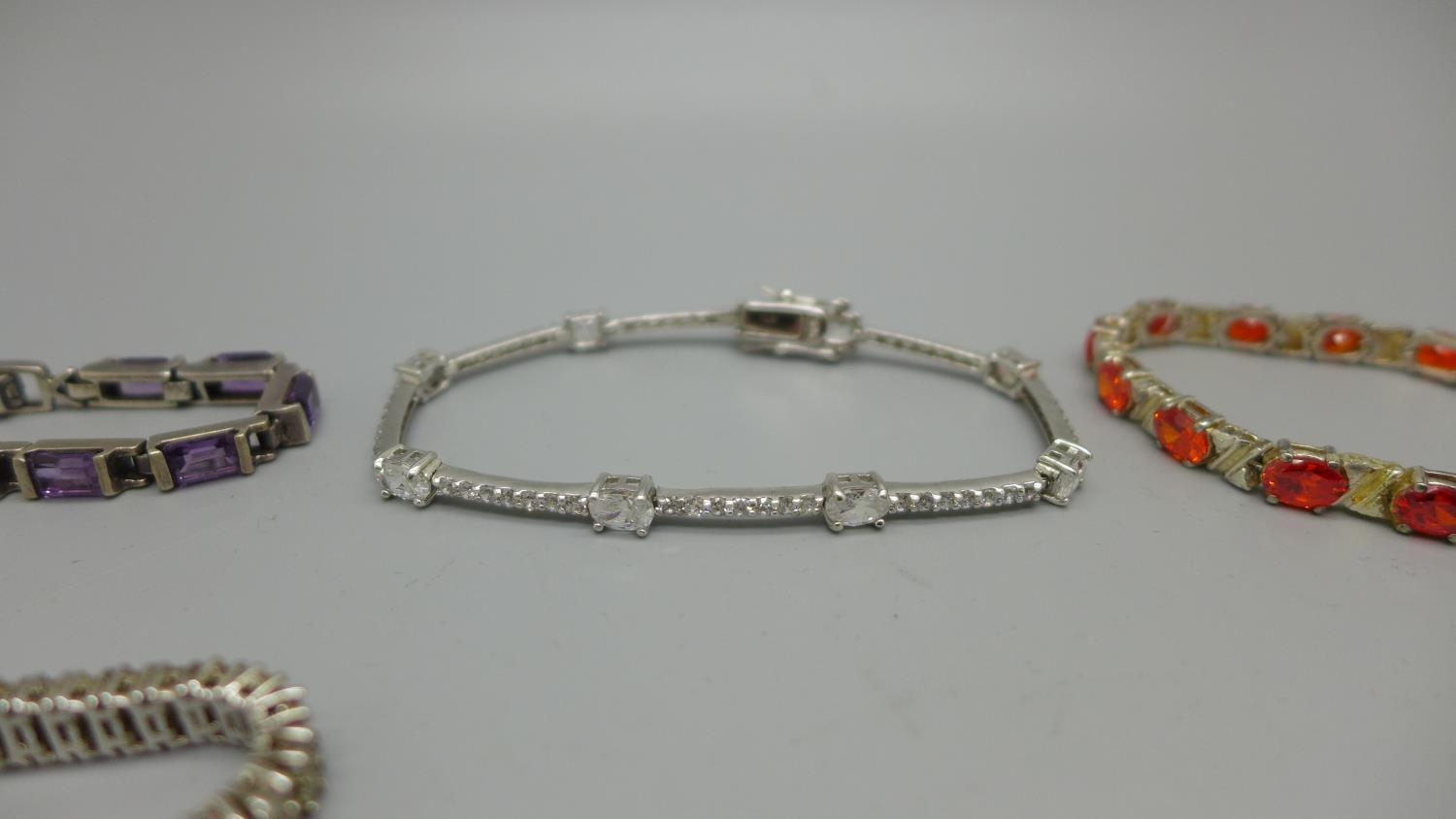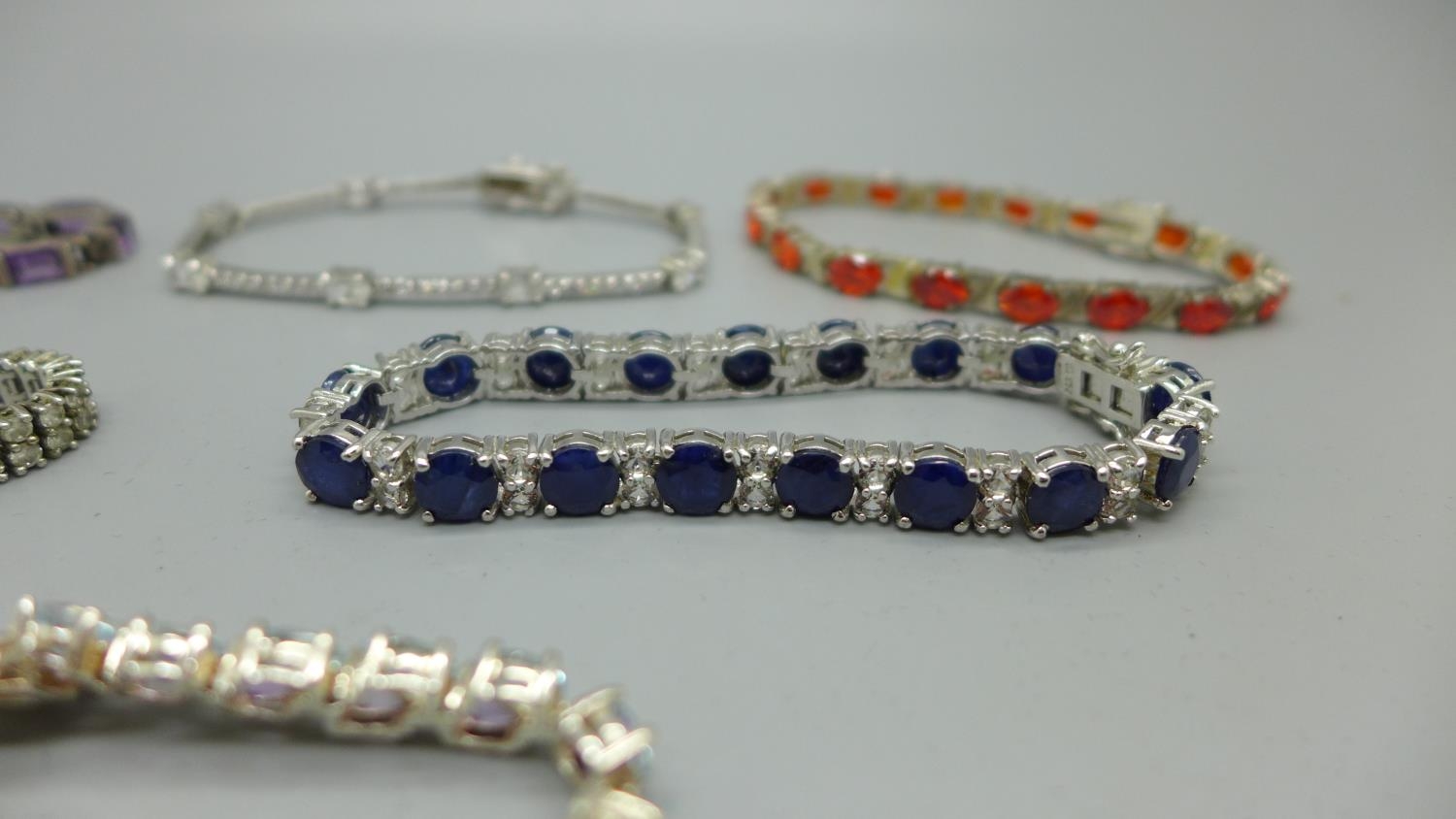 Five silver bracelets set with gemstones