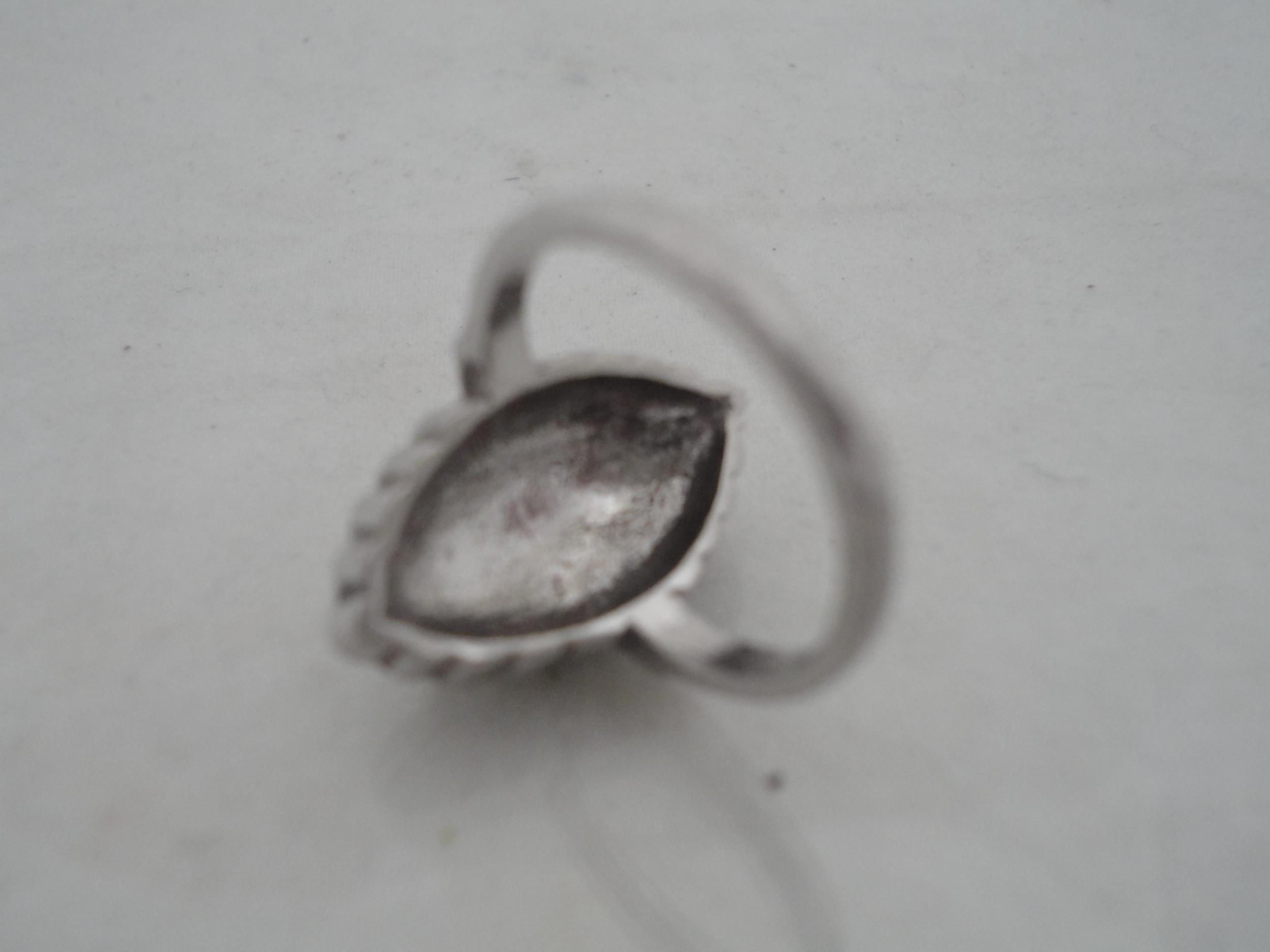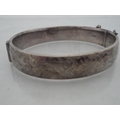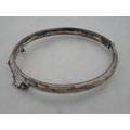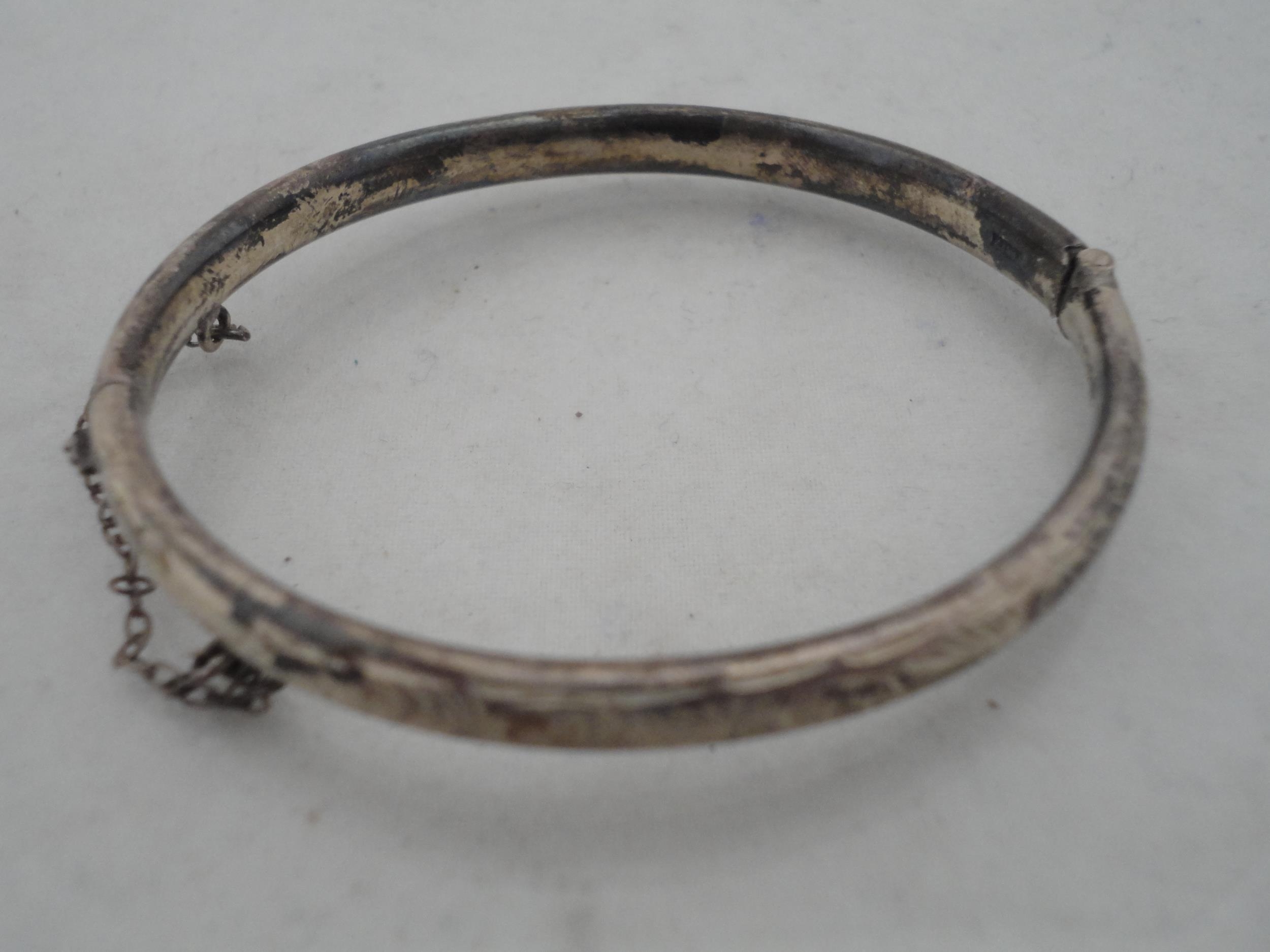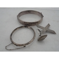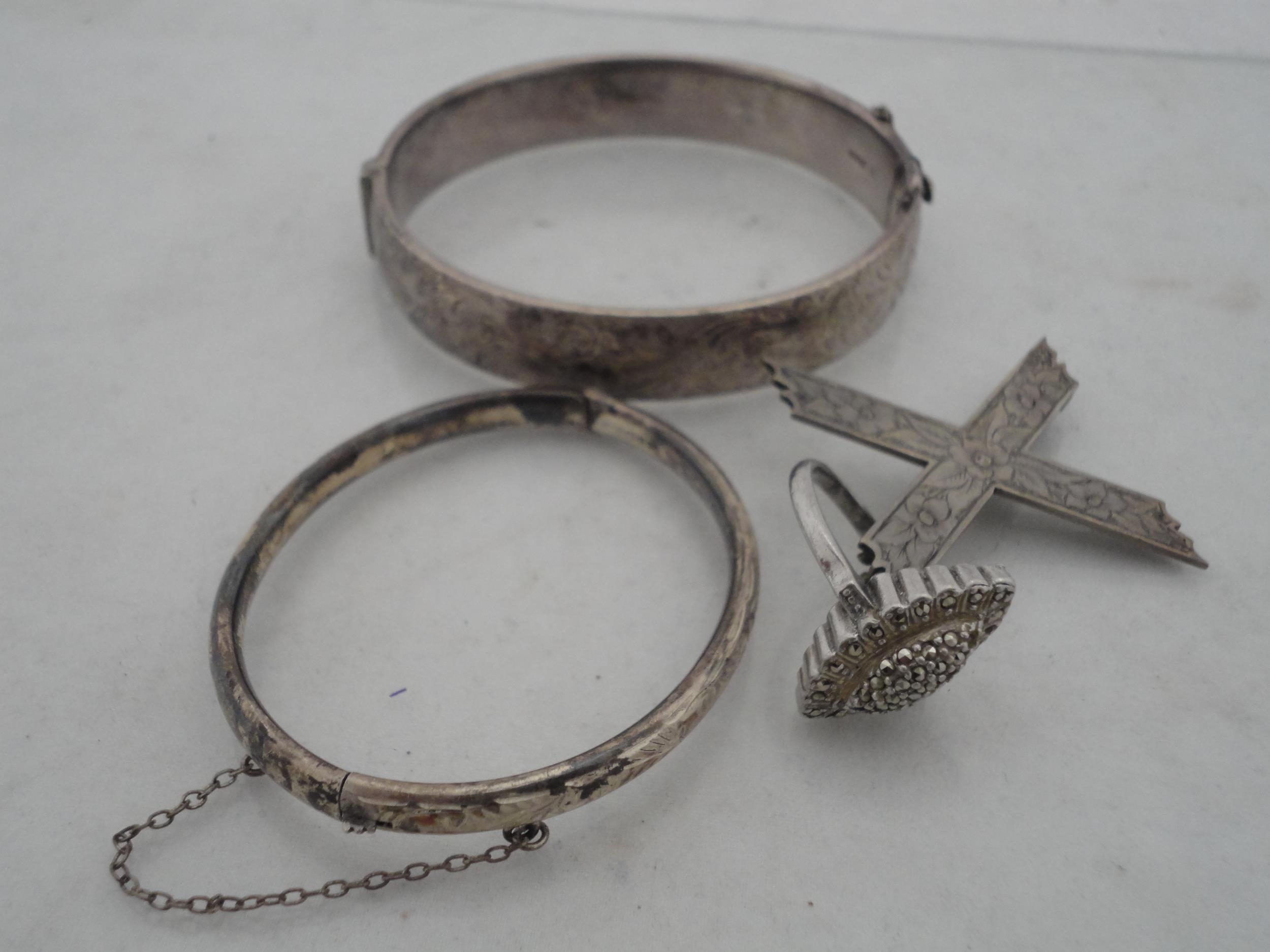 Silver bangle and a child's silver bangle, 30g gross, also a marquis-shaped cocktail ring on silver shank and a white metal cross brooch. (4)
