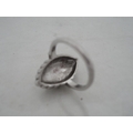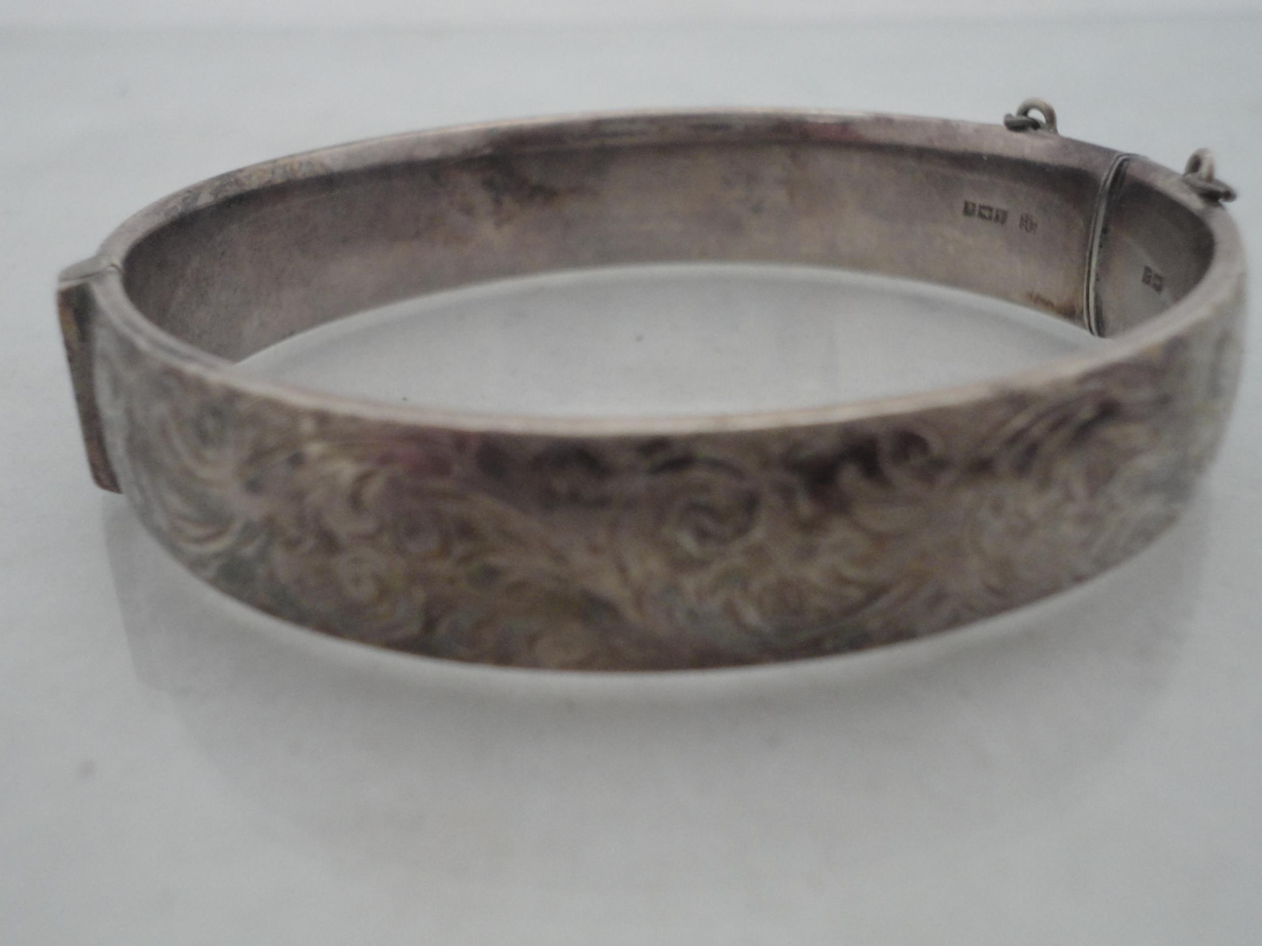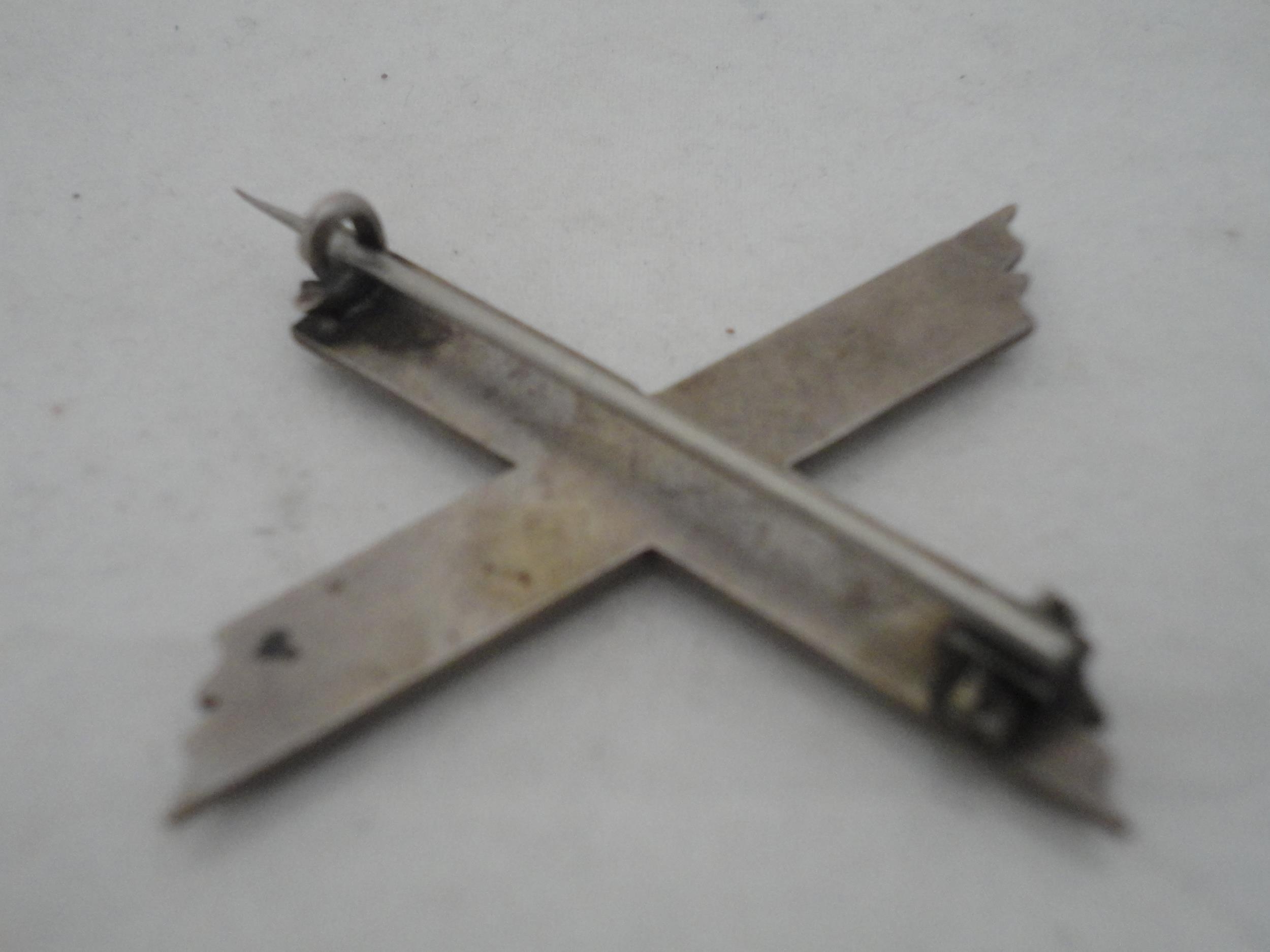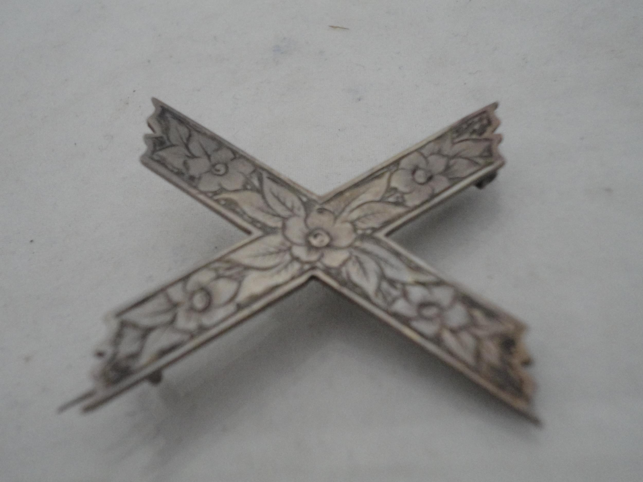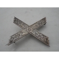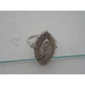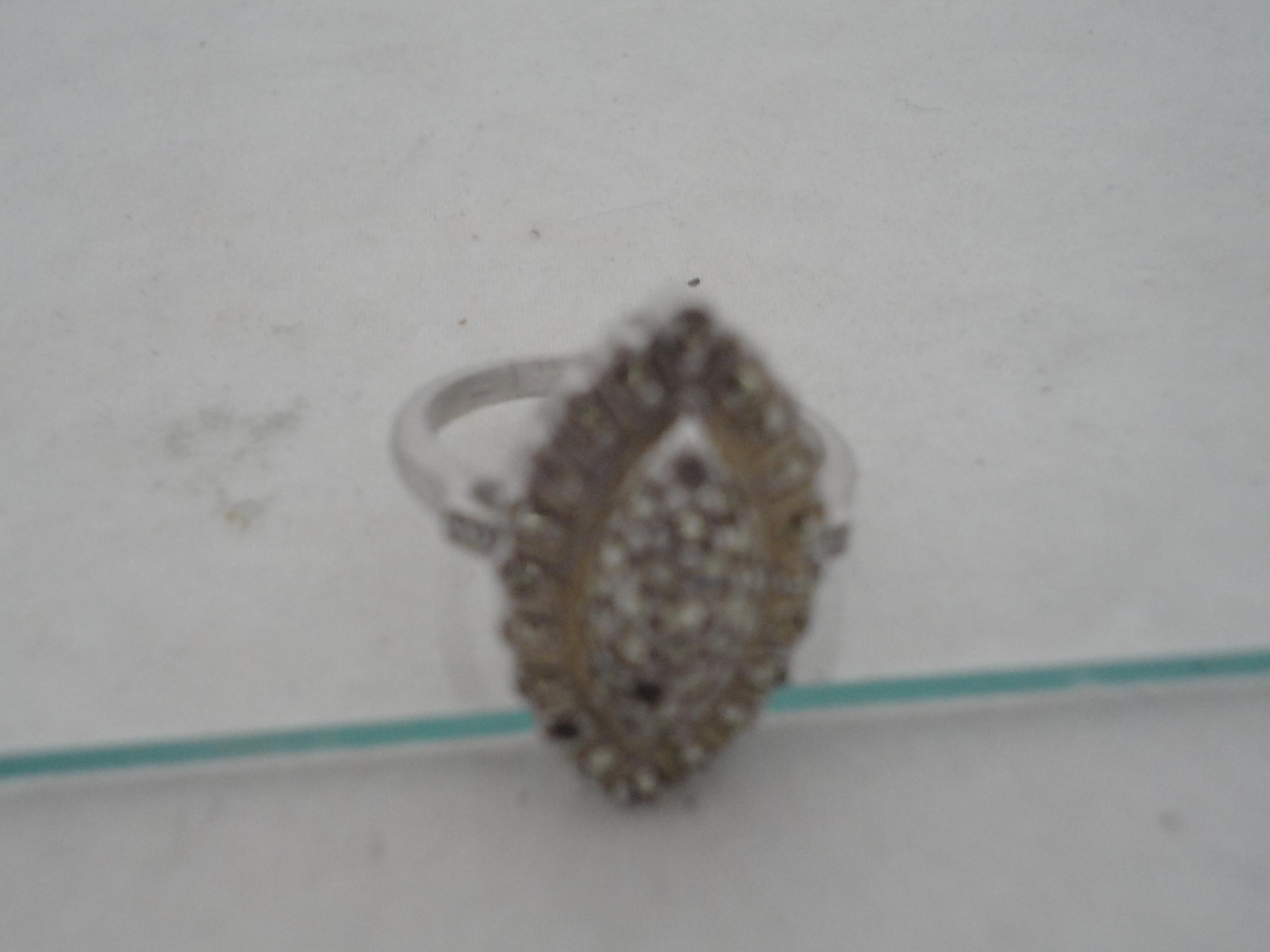 Silver bangle and a child's silver bangle, 30g gross, also a marquis-shaped cocktail ring on silver shank and a white metal cross brooch. (4)