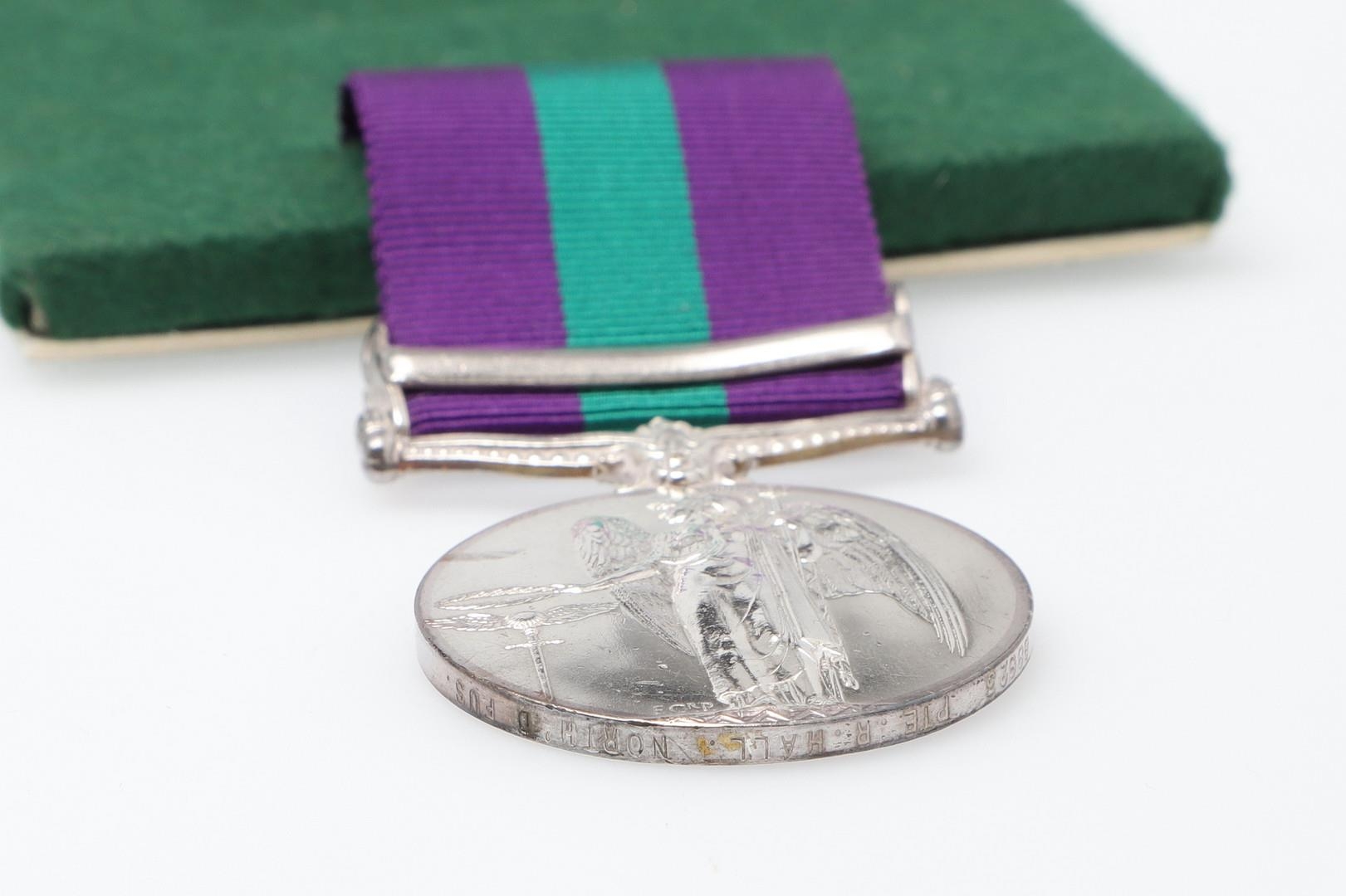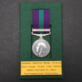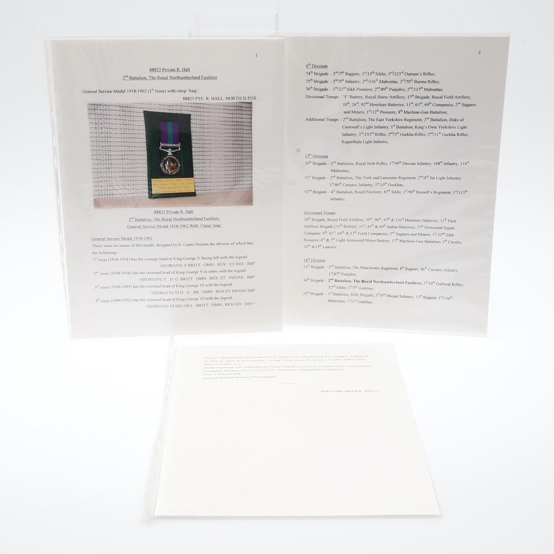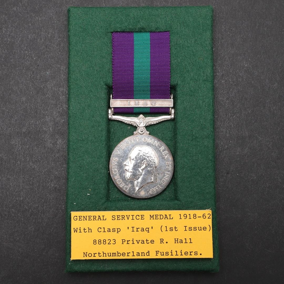 A GENERAL SERVICE MEDAL 1918-1962 WITH IRAQ CLASP TO THE NORTHUMBERLAND FUSILIERS. A George V General Service Medal with Iraq clasp named to 88823 Pte R. Hall North'D Fus. Private Hall also served during the First World War and will have been entitled to a pair, also being recorded with number 4257190, he is recorded with the Second Battalion, this clasp is confirmed to his Medal Index card. Mounted for display with copied research.