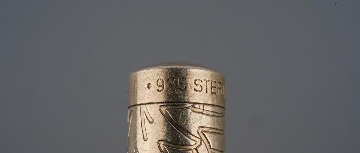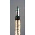A Tifffany & Co fountain pen. The pen with abstract foliate detail and fountain pen nib (nip signed Tiffany & Co 750), stamped Tiffany & Co. 925 Sterling Germany, approx length 11mm, approx gross weight 25.01 grams.