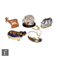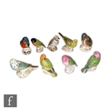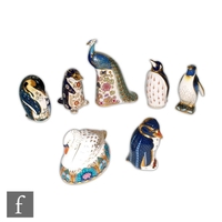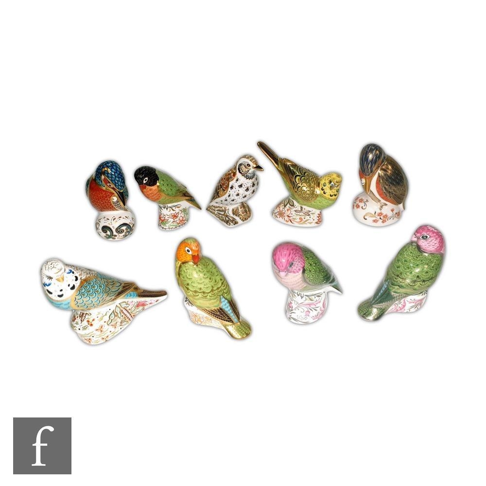 Eight Royal Crown Derby bird paperweights to include Kedleston Kingfisher, Green Budgerigar, Red Faced Love Bird, Sky Blue Budgerigar, Black Faced Love Bird, Song Thrush, Platinum Wedding Love Birds numbered 162 of 500, all with printed marks, all with gold stoppers, eight boxes. (8)