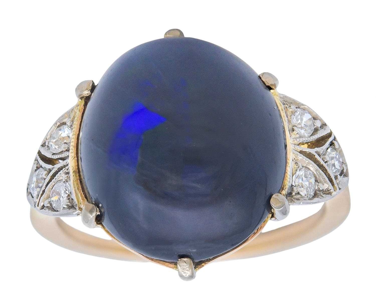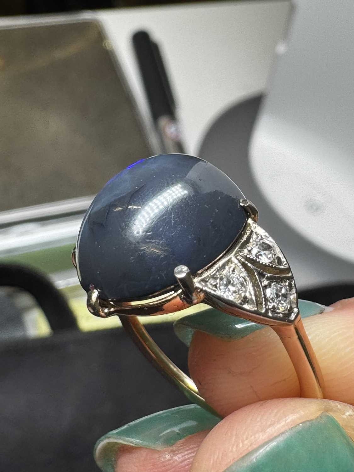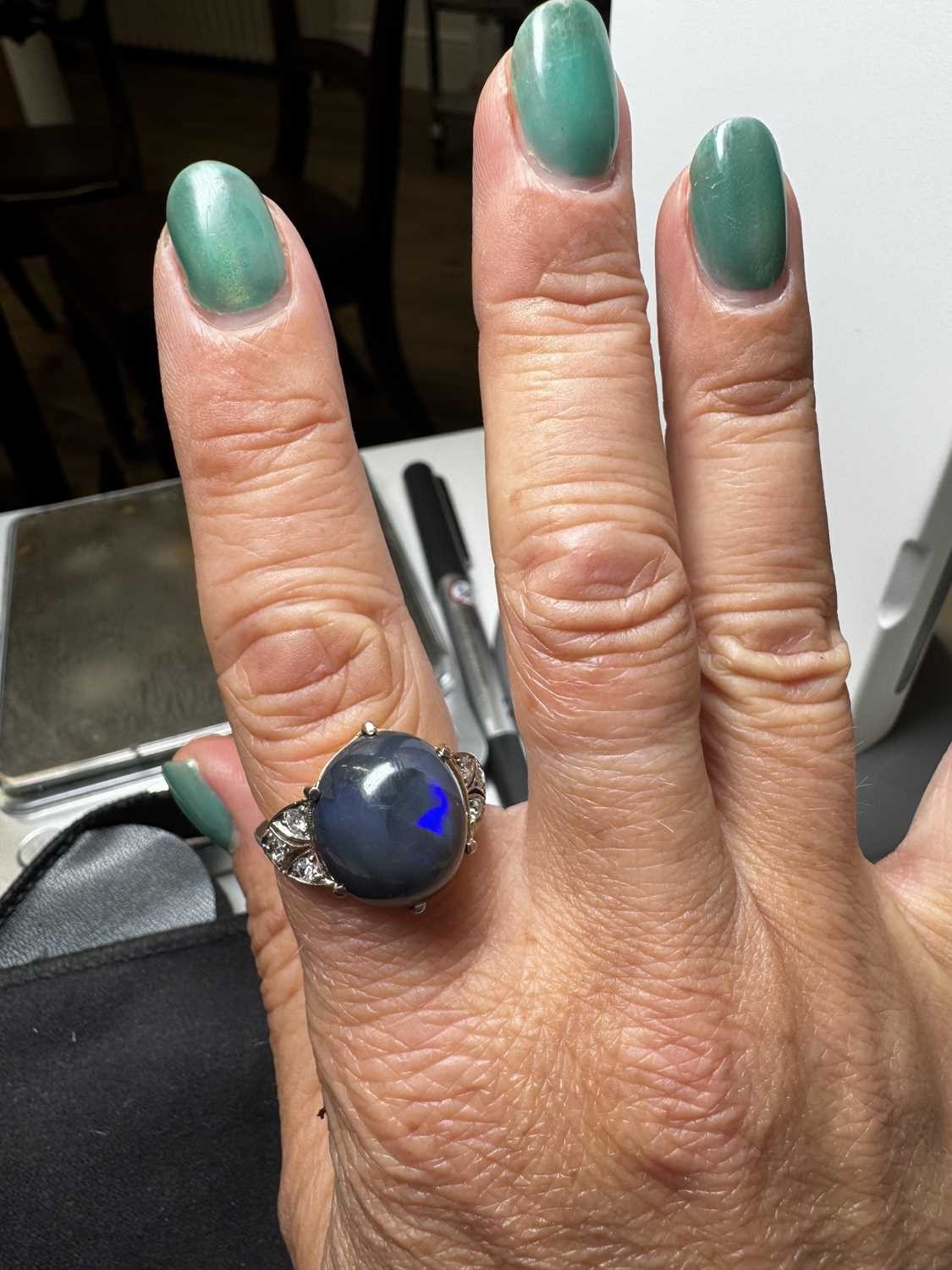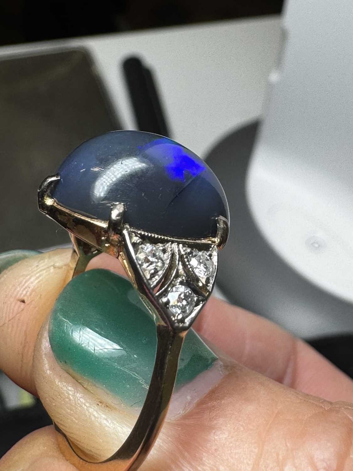 A good Art Deco black opal and diamond set gold and platinum dress ring. The large cabochon opal with blue, green and violet flashes, measuring 15.2 x 13.5 x 8.7mm, the shoulders each millegrain set with three small old brilliant cut diamonds, size R, 5.9g. No visible cracks, scratches on opal, two diamonds have small chips, visible under 10x magnification only, very good used condition.