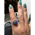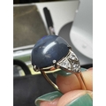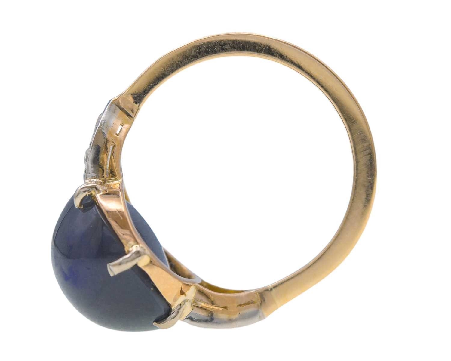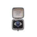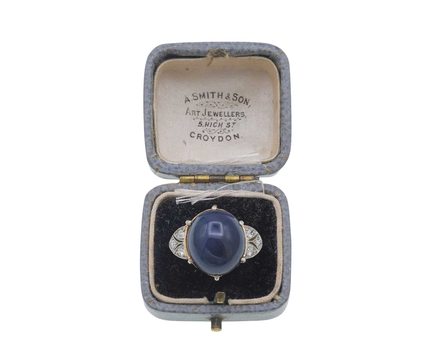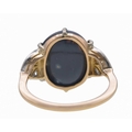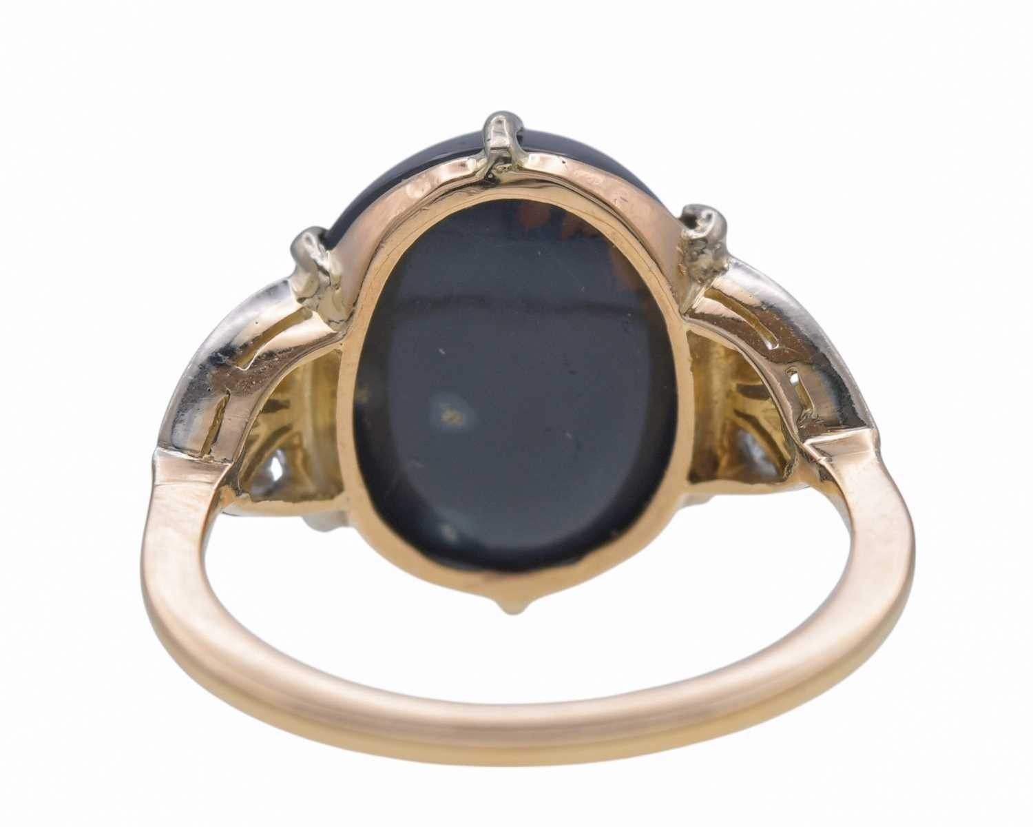 A good Art Deco black opal and diamond set gold and platinum dress ring. The large cabochon opal with blue, green and violet flashes, measuring 15.2 x 13.5 x 8.7mm, the shoulders each millegrain set with three small old brilliant cut diamonds, size R, 5.9g. No visible cracks, scratches on opal, two diamonds have small chips, visible under 10x magnification only, very good used condition.