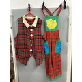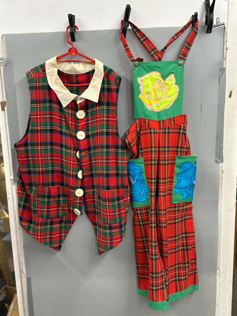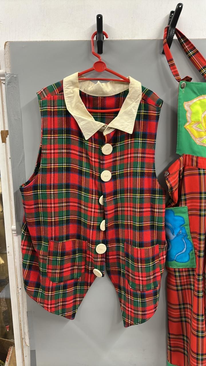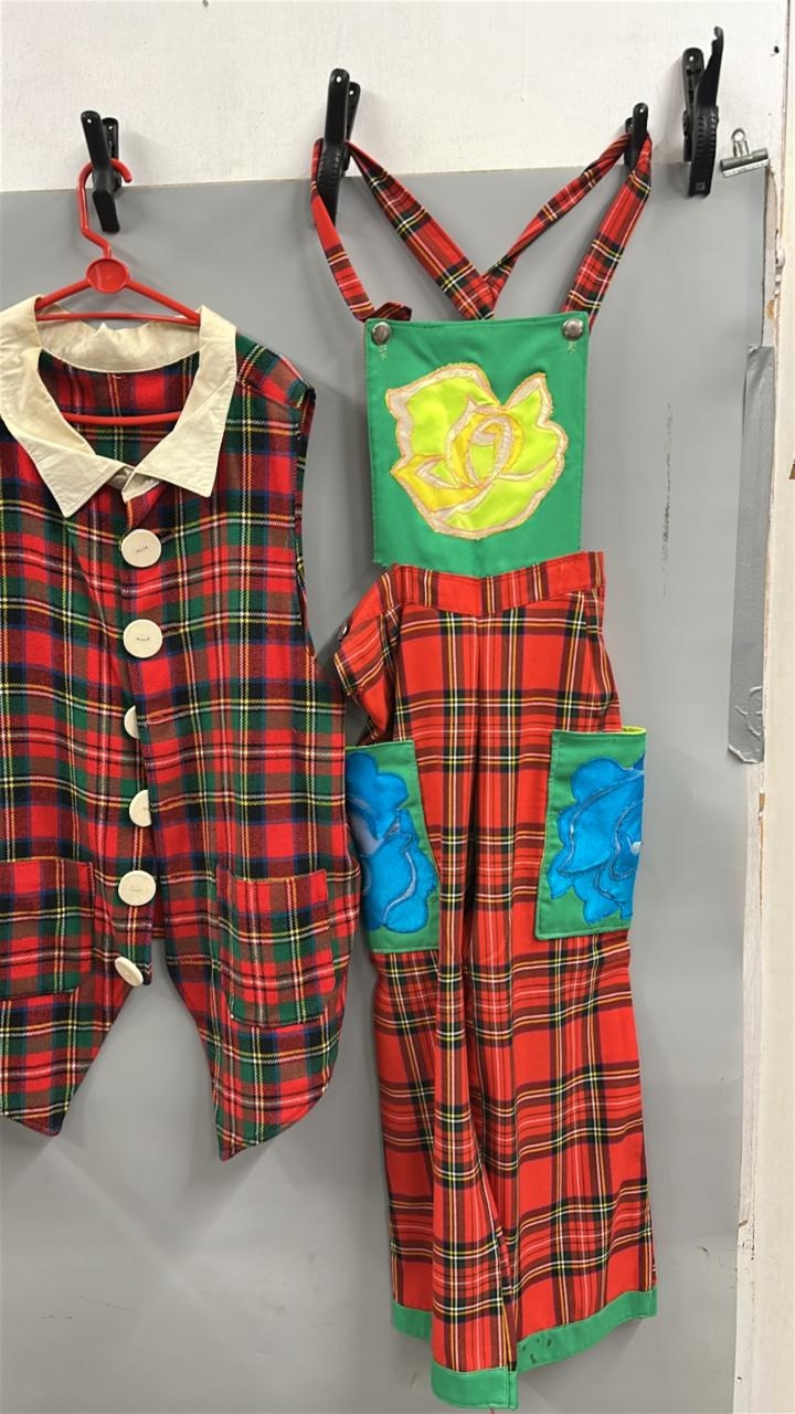 Stage worn clown costume including waistcoat with oversized buttons and dungarees / Rail 4
