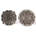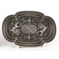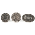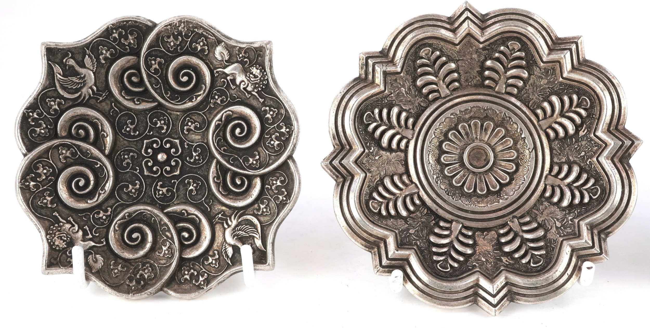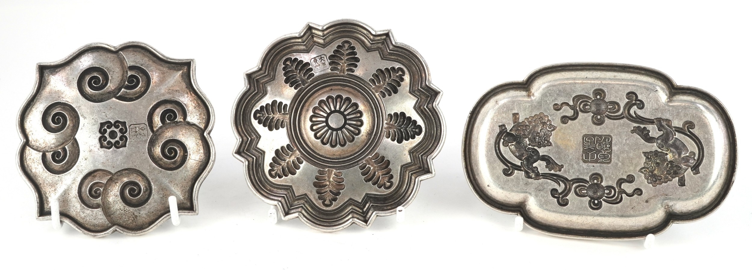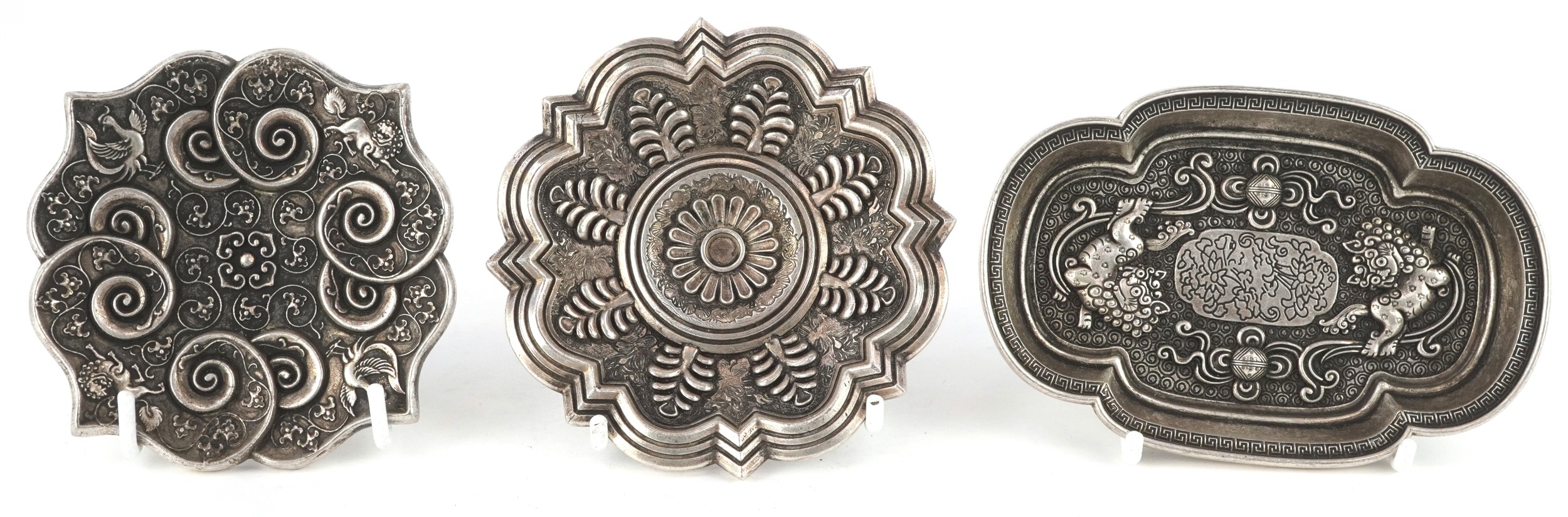 Three Chinese white metal dishes, each cast with floral decoration and animalia, the largest 12cm wide.