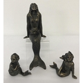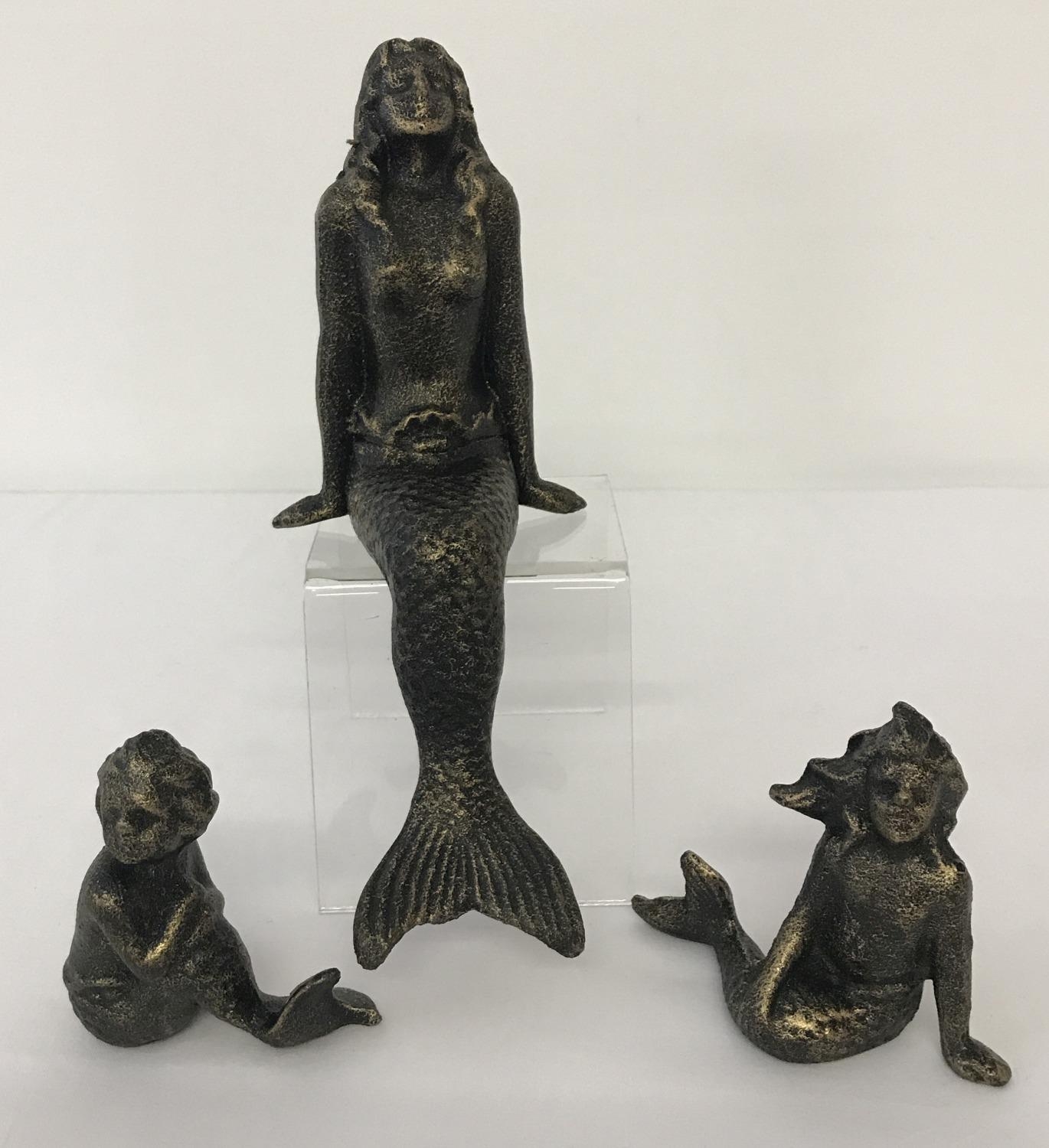 A set of 3 bronzed cast metal mermaid figurines.Largest approx. 21cm tall.