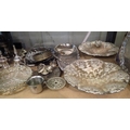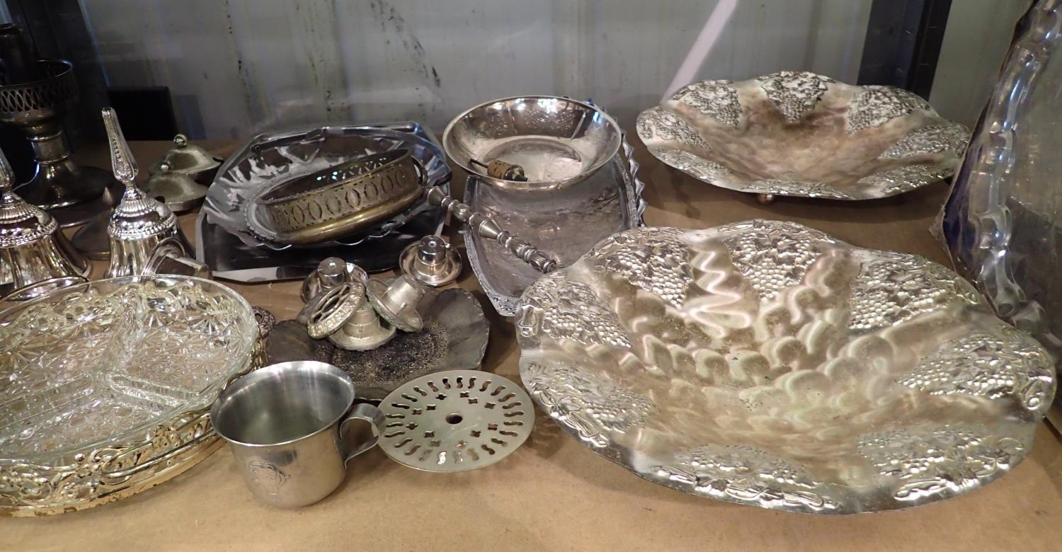 Shelf of mixed plated items to include footed fruit bowl D: 25 cm. Not available for in-house P&P, contact Paul O'Hea at Mailboxes on 01925 659133