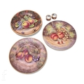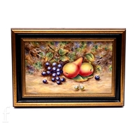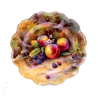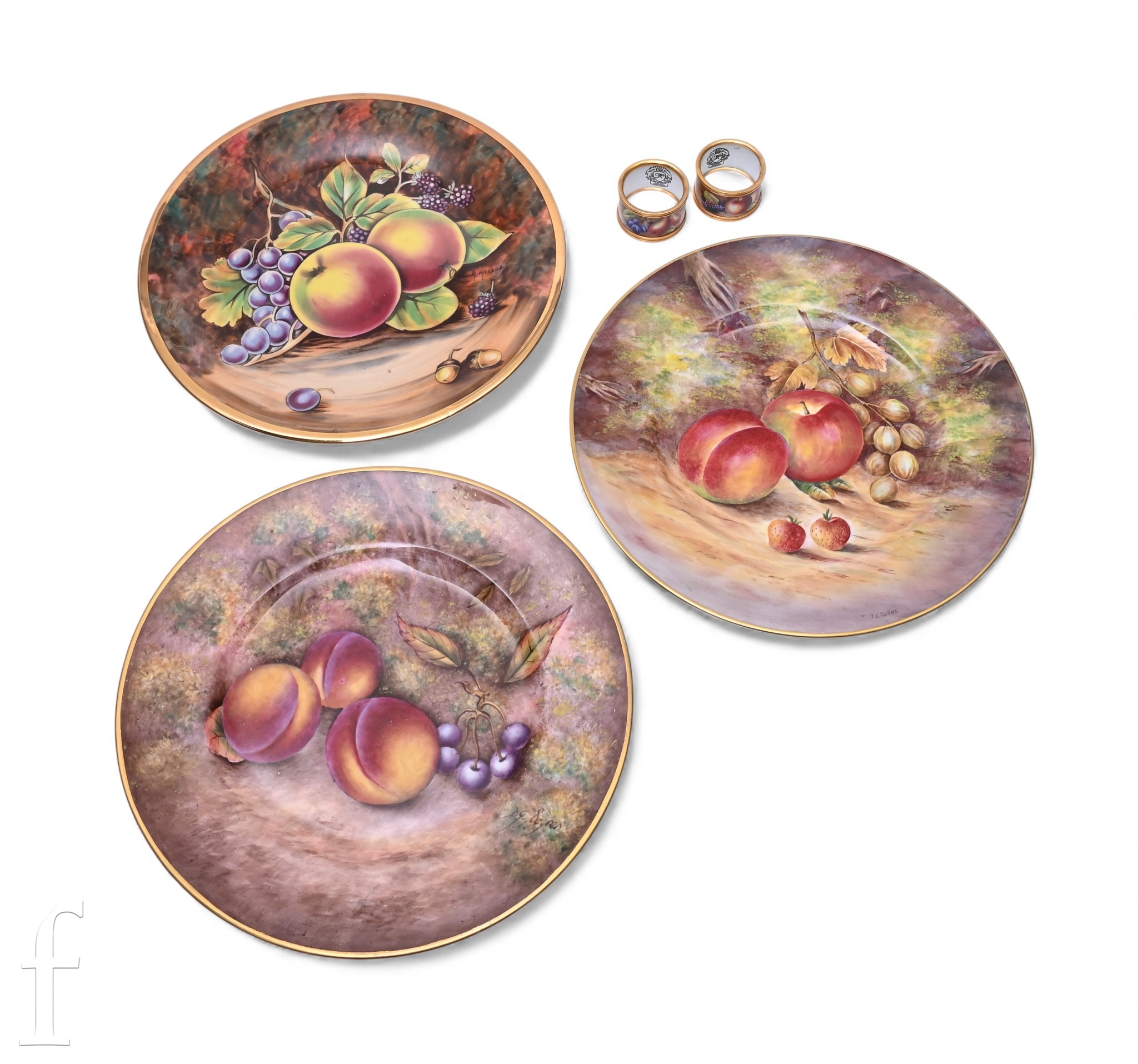 David J. Scyner (Ex Royal Worcester artist), an Orb China fruit painted cabinet plate, decorated with peaches and cherries over mossy covered ground, signed, diameter 27cm, a Henwick Studio fruit painted plate by J Collins, signed, diameter 27cm, a Baroness China fruit decorated plate, signed A Mellor, and two enamelled fruit decorated napkin rings, both signed Steve Smith. (5)