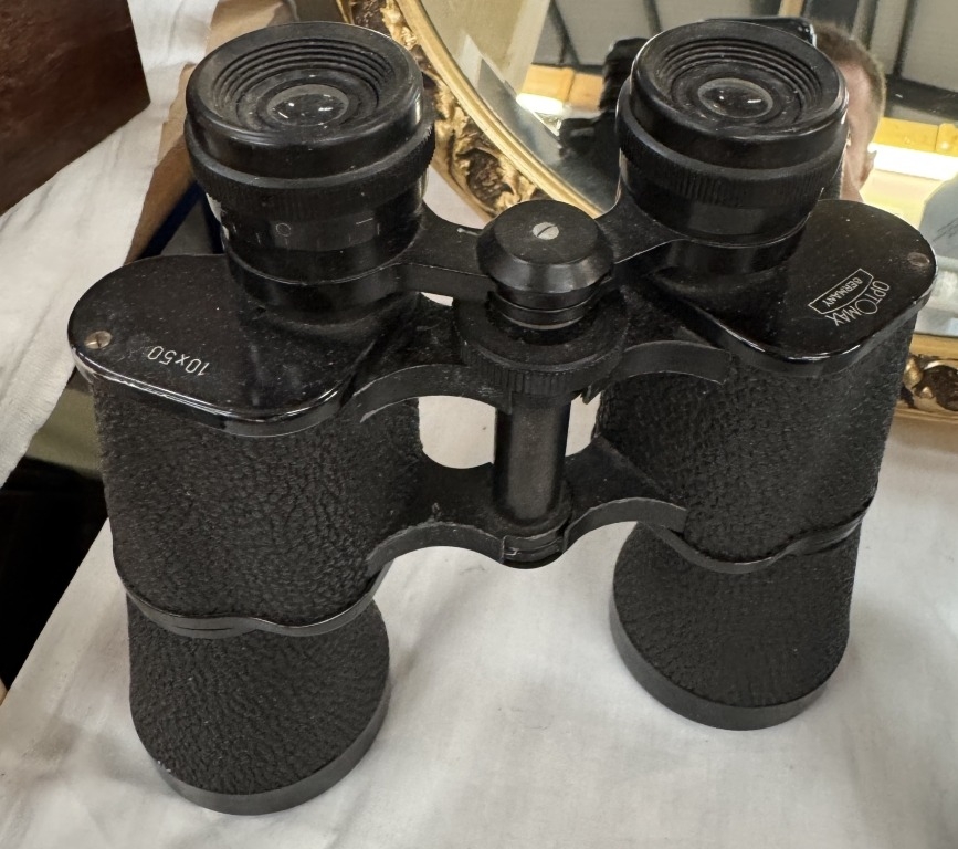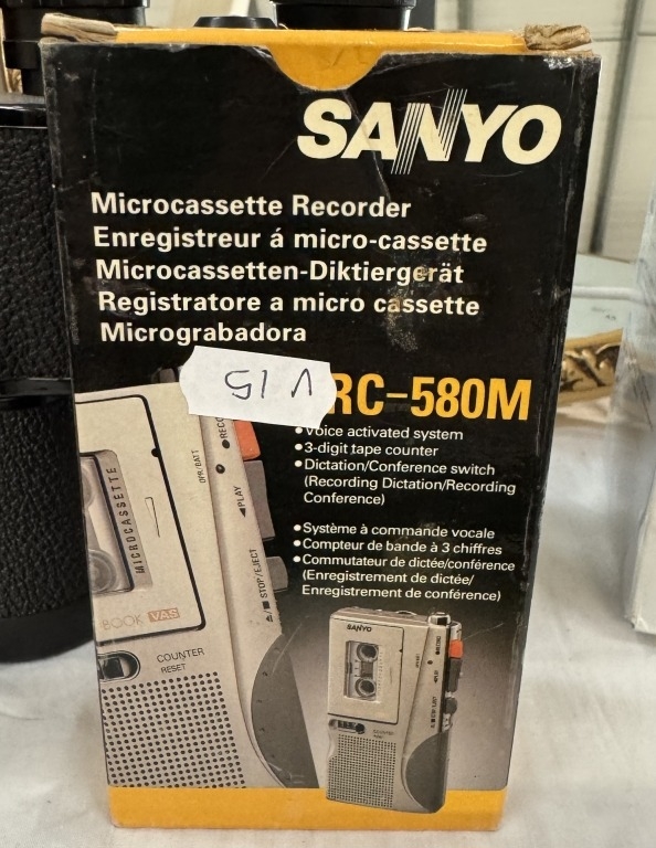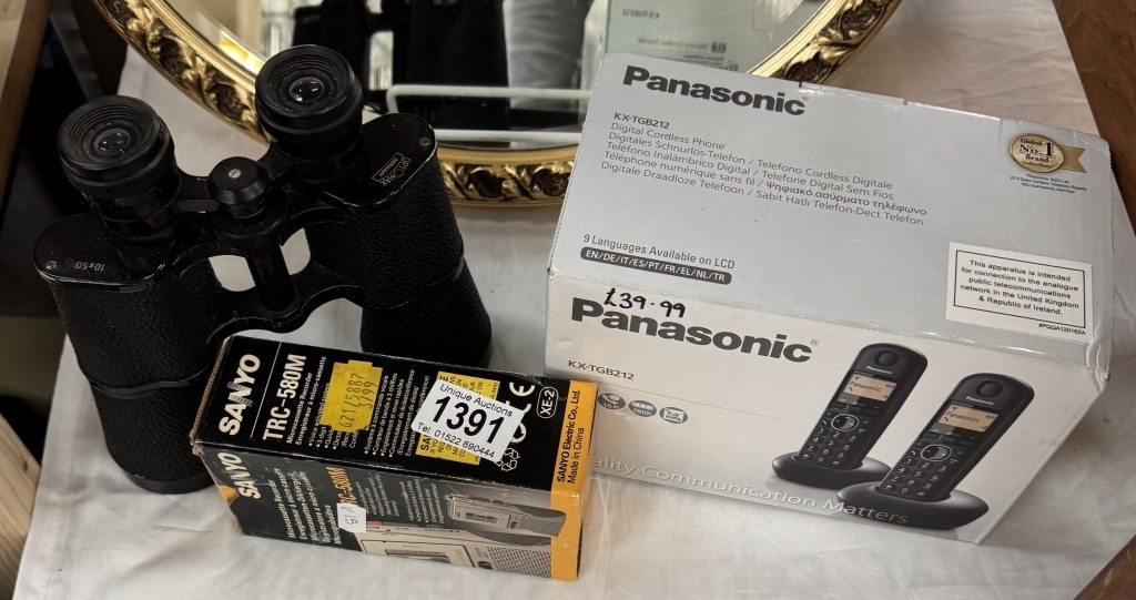 An Optimax Germany 10 x 50 binoculars & Sanyo TRC-580M micro cassette recorder etc
