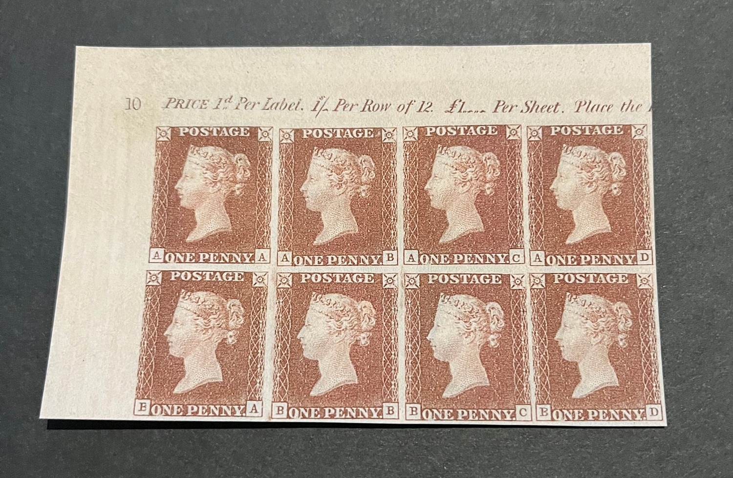 UK GB QV corner block of 8 imperforate penny red stars FORGERY / REPLICA / COPIES a/f