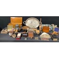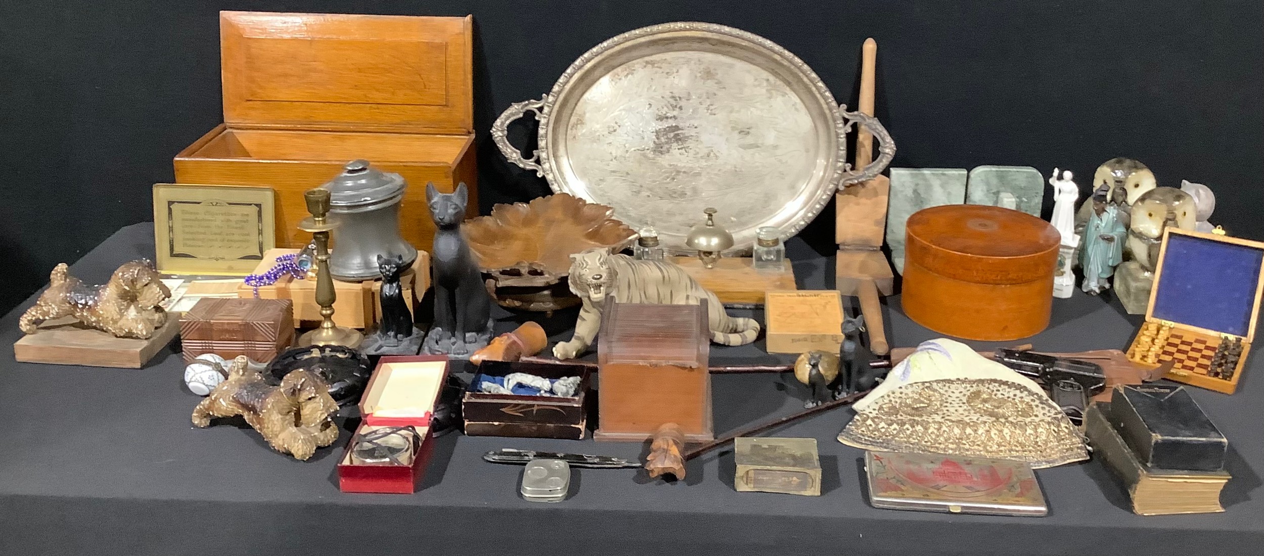 Boxes and Objects - a pair of moss agate bookends; an early 20th century counter bell inkstand; a Black Forest carved musical leaf shaped dish; a pewter tobacco jar and cover; plated flatware; Black Forest carved pipes; etc, qty