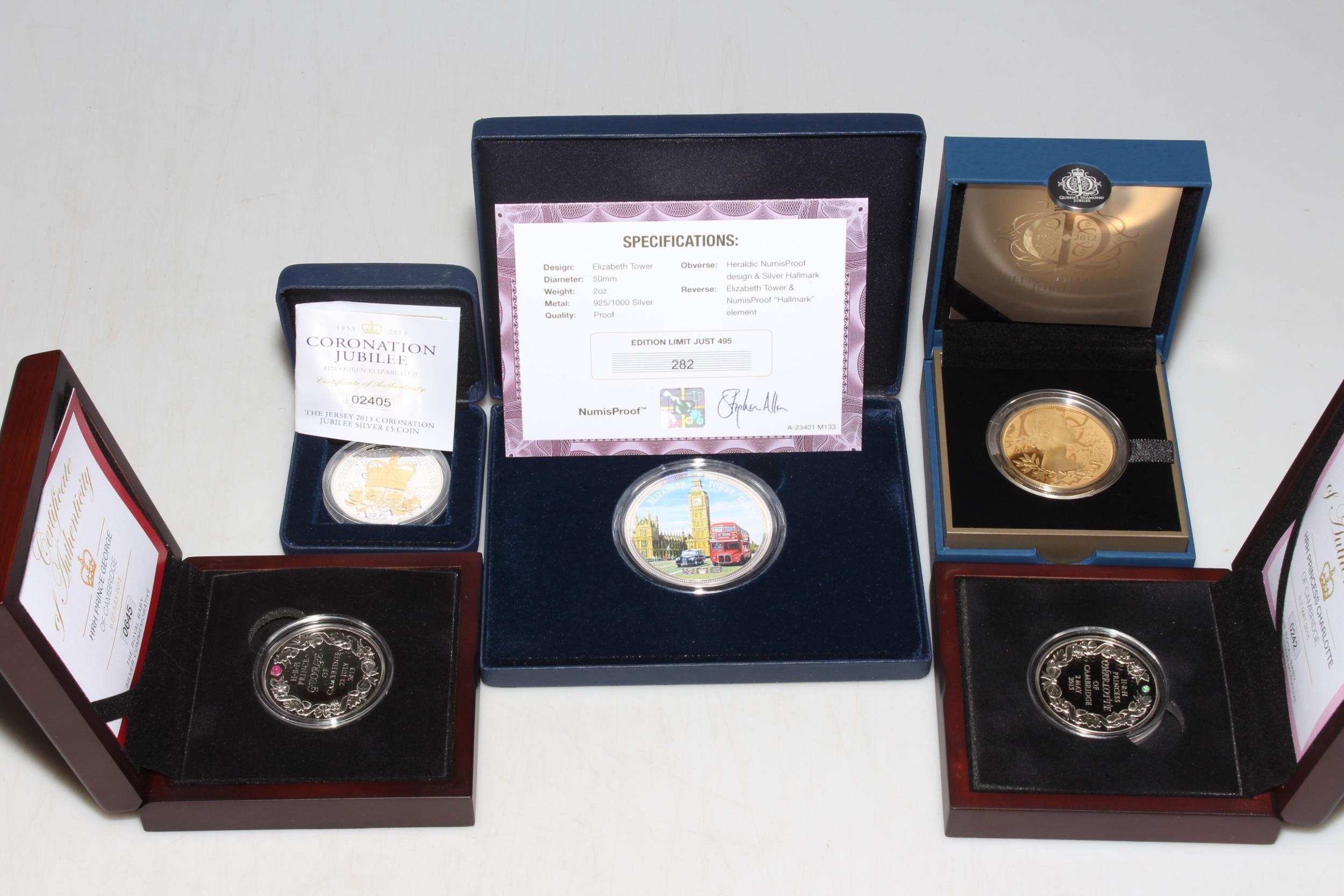 Collection of silver proof coins with COAs inc 2012 Elizabeth Tower 2oz 'Numisproof', HRH Prince George of Cambridge silver commemorative with ruby stone and HRH Princess Charlotte with emerald stone, Coronation Jubilee Jersey 2013 £5 and 2012 The Queen's Diamond Jubilee £5 Gold Plated silver proof (5).