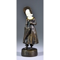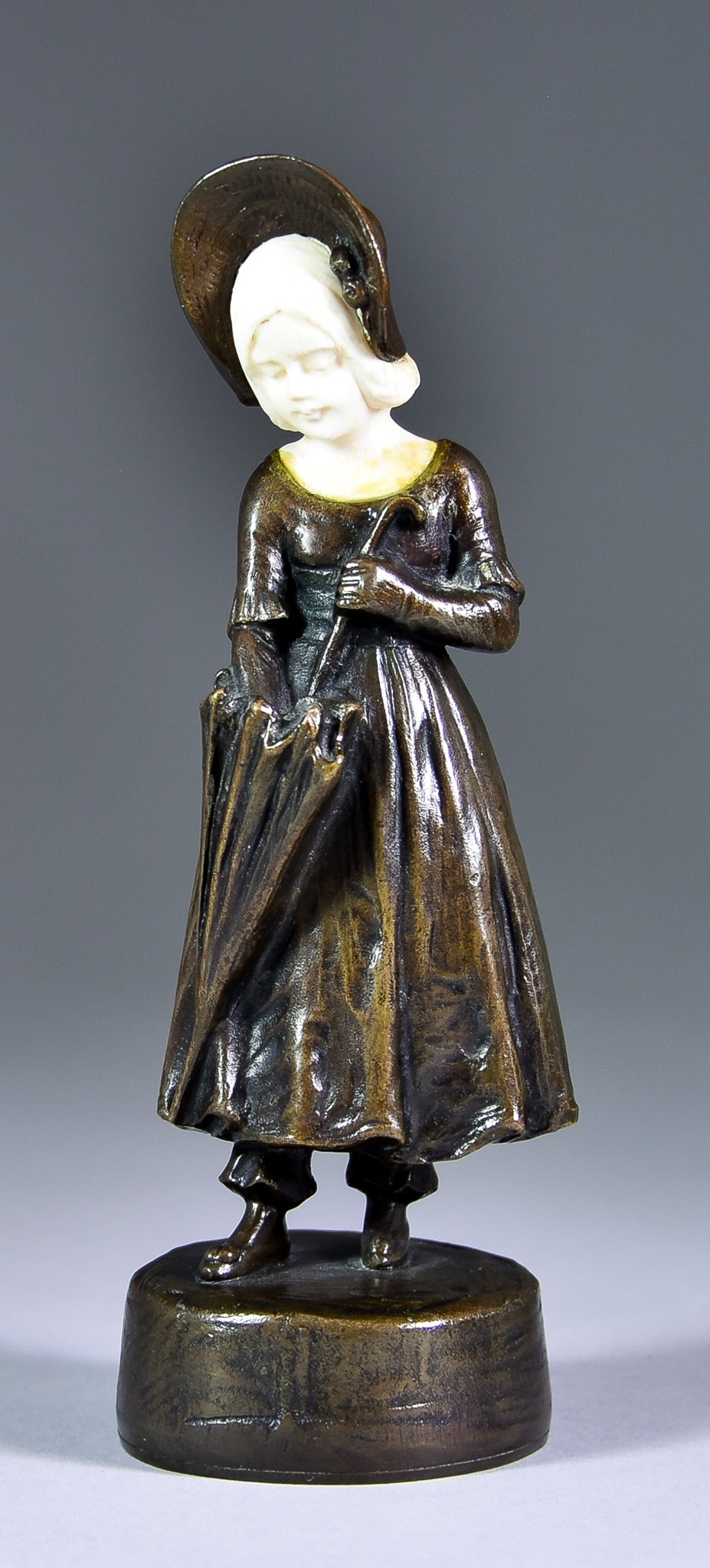 Peter Tereszcuk (1875-1963) - Bronze and ivory figure - Young girl wearing wide brimmed bonnet and with umbrella on circular base, 6.5ins high, signed to base