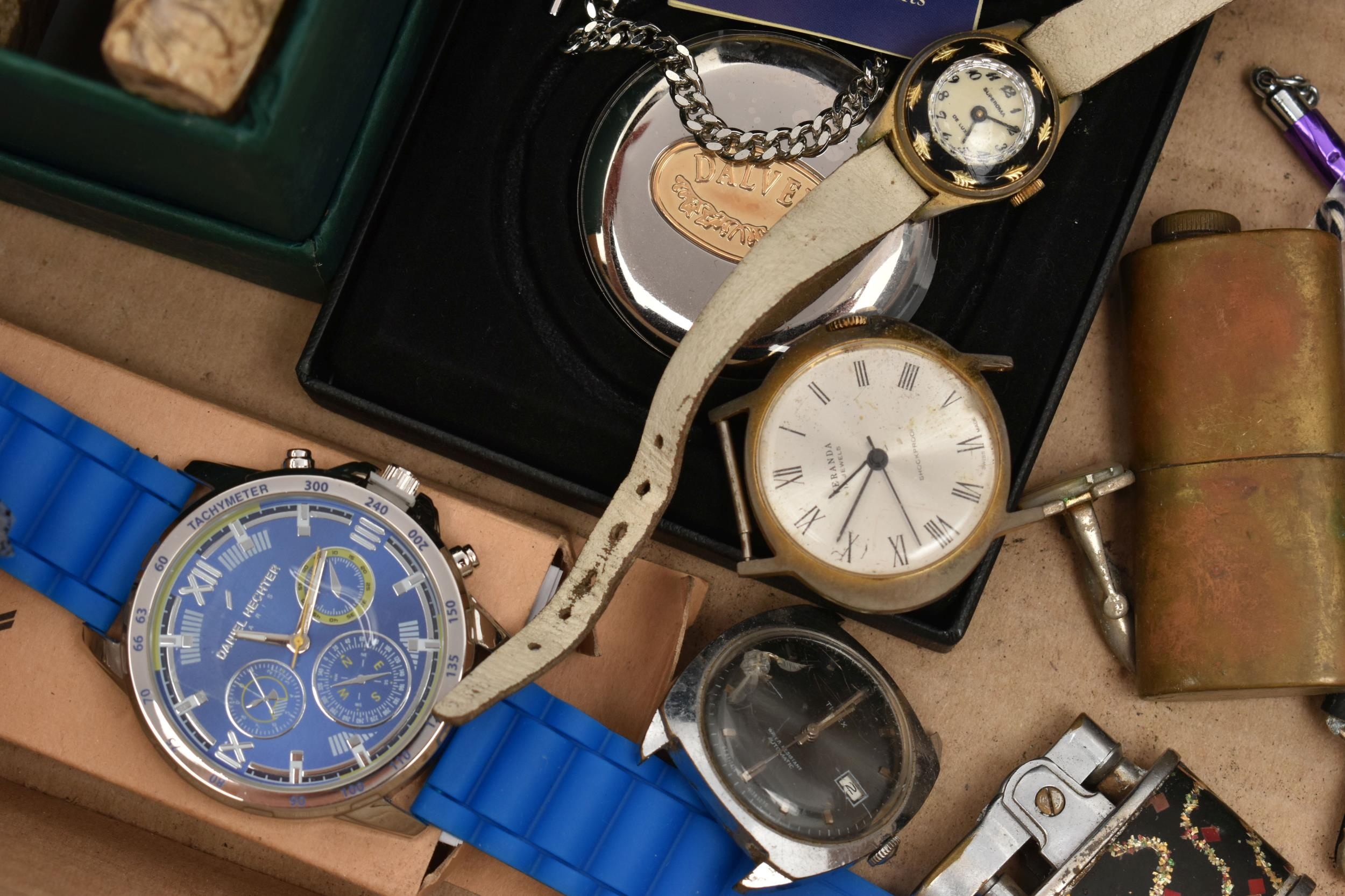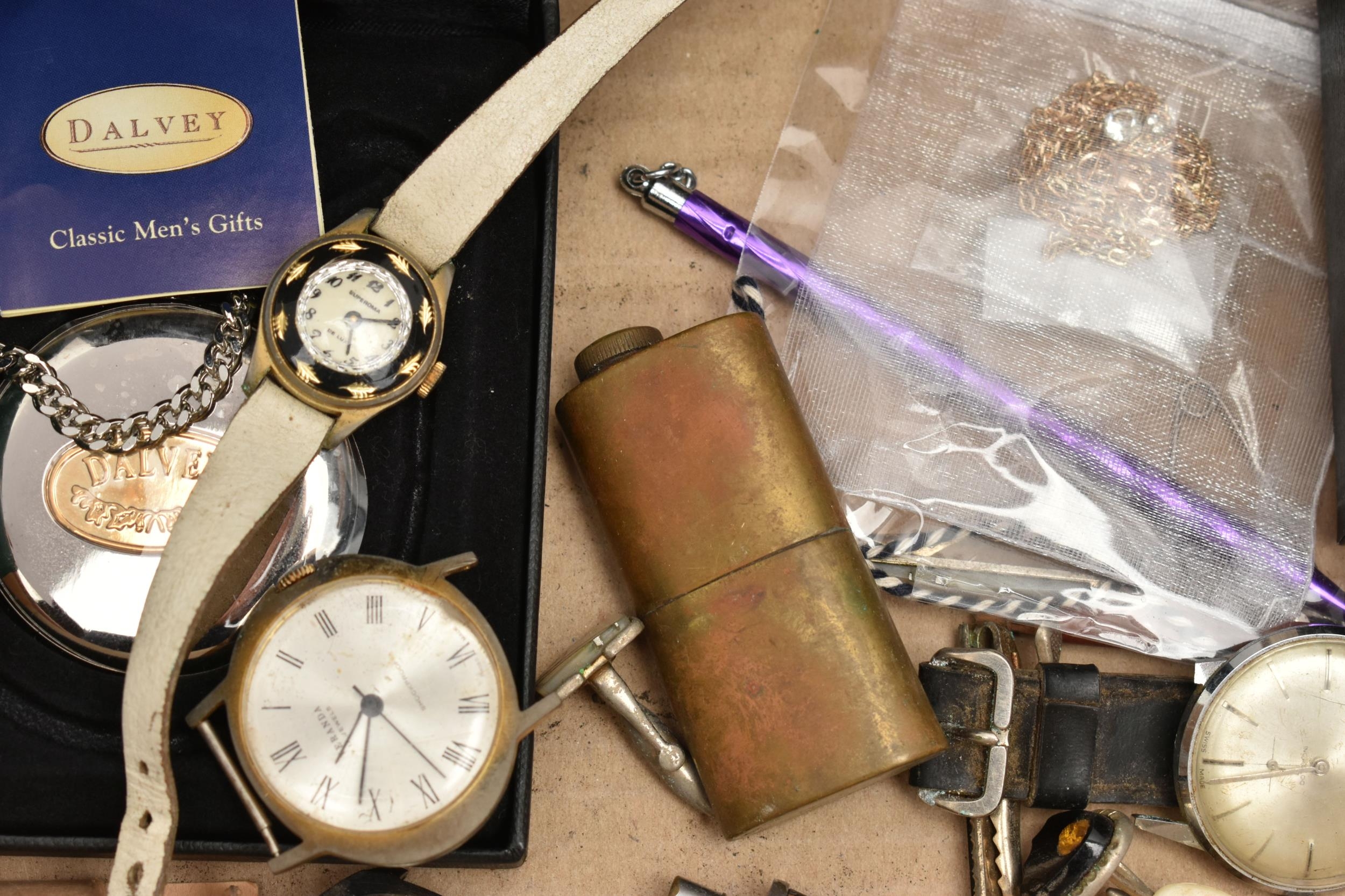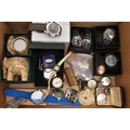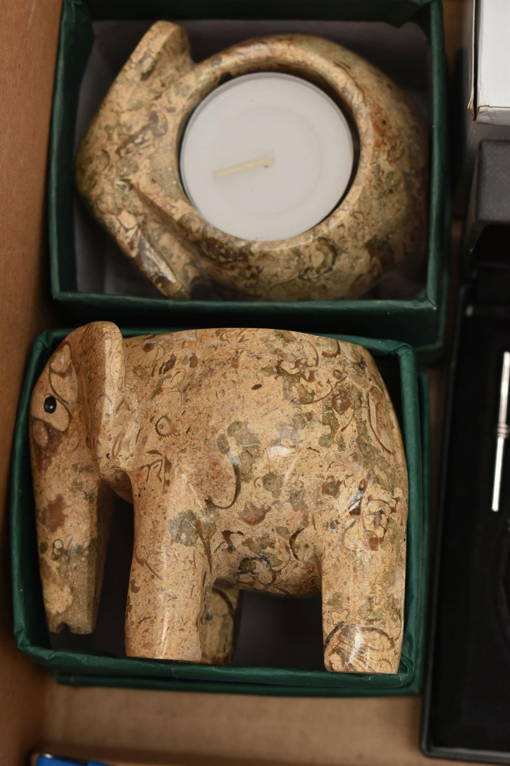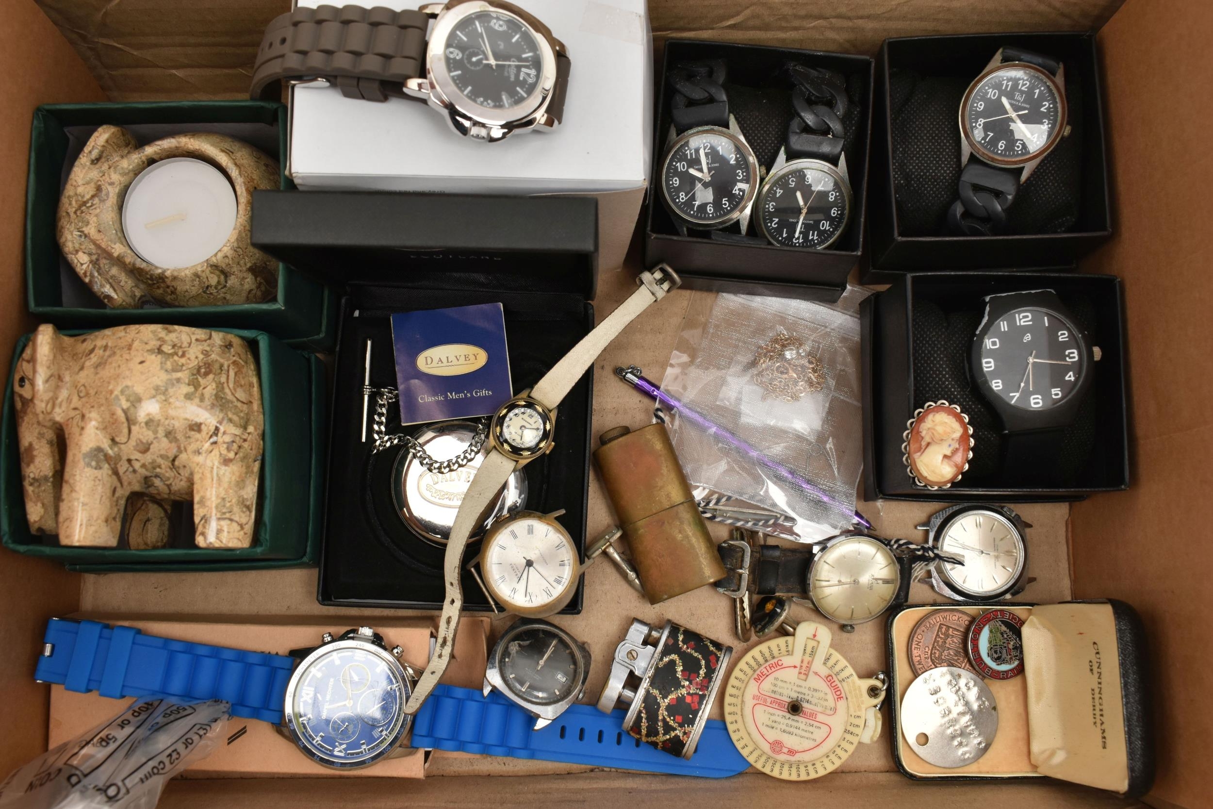 A BOX OF ASSORTED ITEMS, to include a pair of boxed carved stone elephant tea light holders, a selection of fashion wristwatches some with boxes, others with names to include 'Josmar, Timex, Veranda', a large 'Daniel Hechter' watch with blue rubber strap, tie clips, a boxed 'Dalvey' pocket watch etc