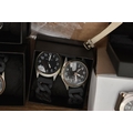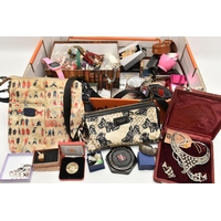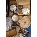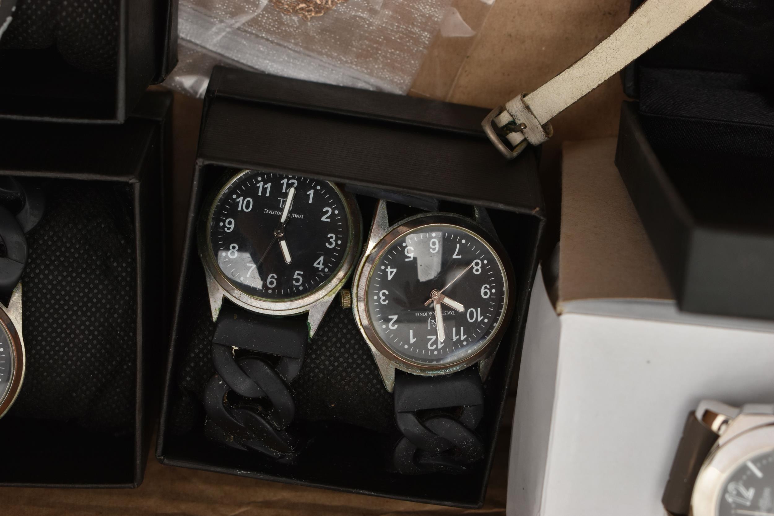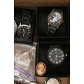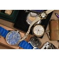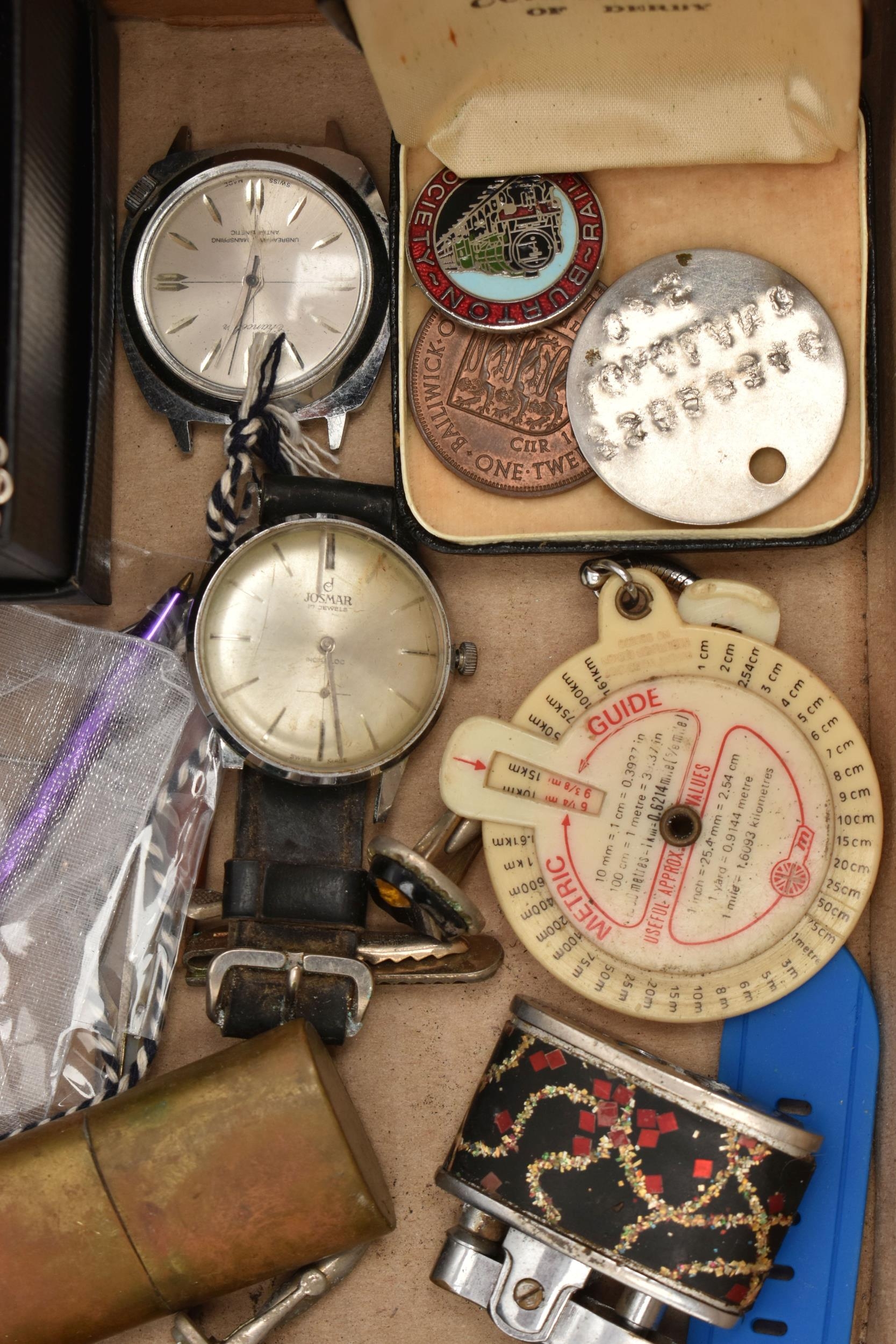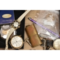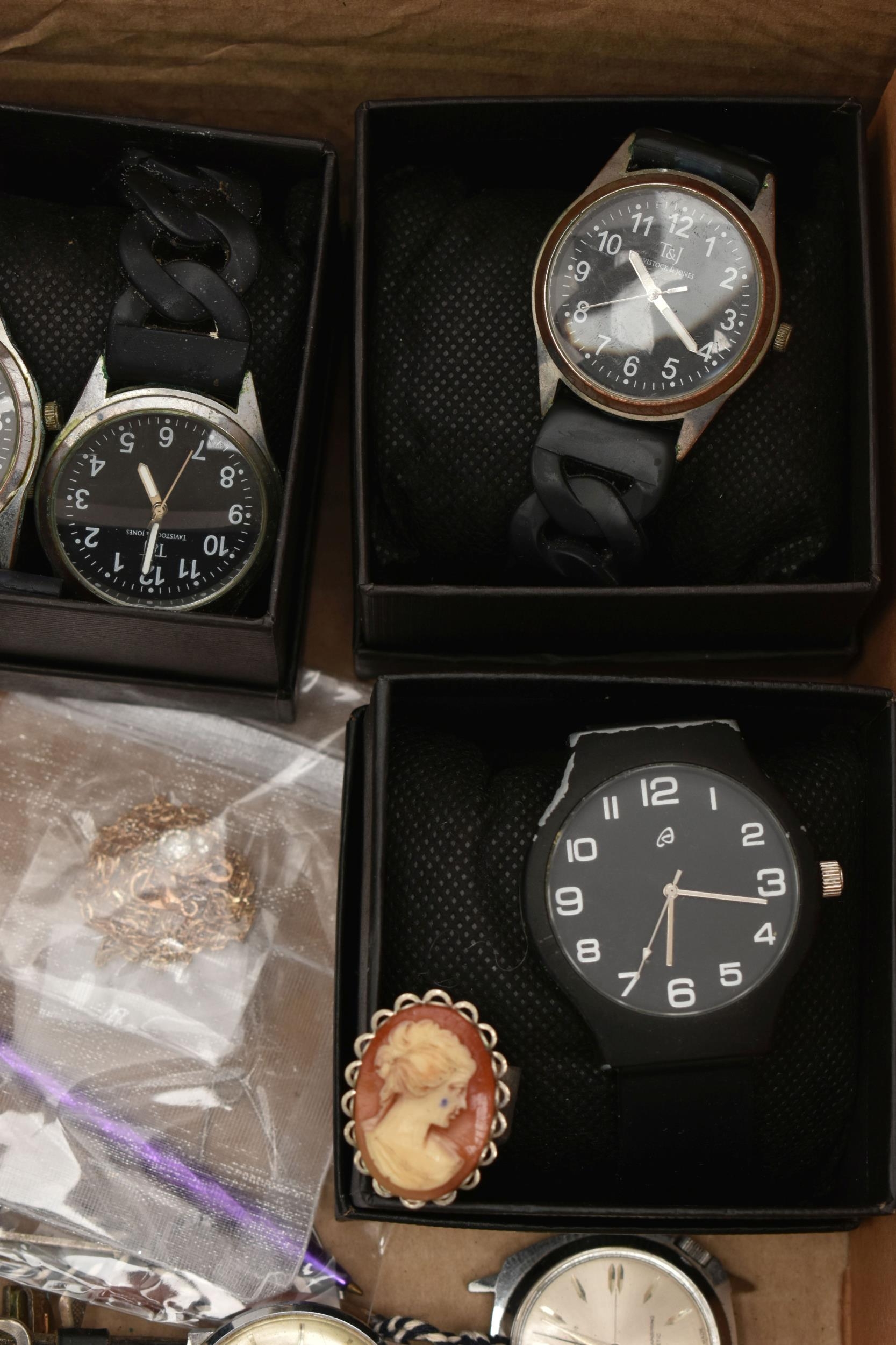 A BOX OF ASSORTED ITEMS, to include a pair of boxed carved stone elephant tea light holders, a selection of fashion wristwatches some with boxes, others with names to include 'Josmar, Timex, Veranda', a large 'Daniel Hechter' watch with blue rubber strap, tie clips, a boxed 'Dalvey' pocket watch etc