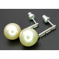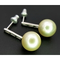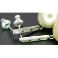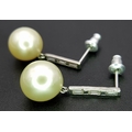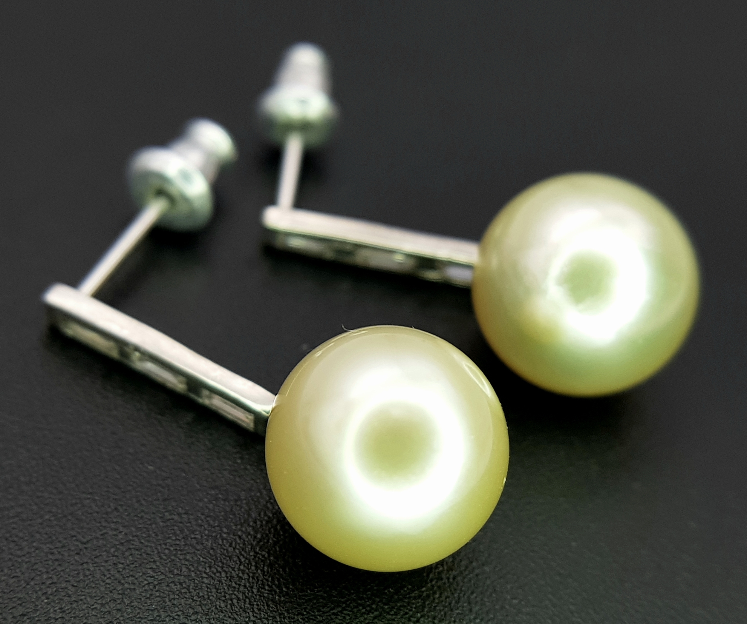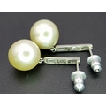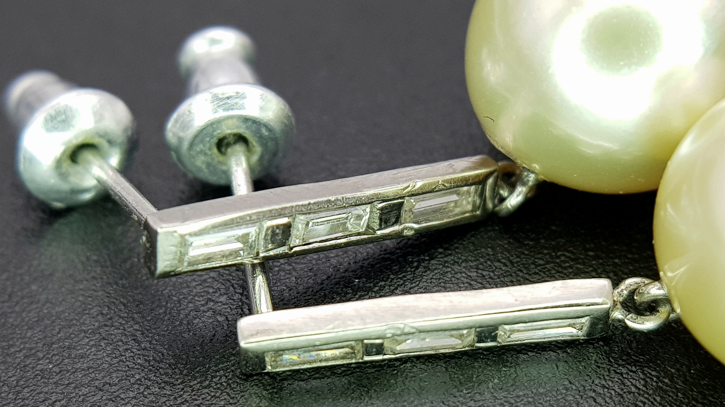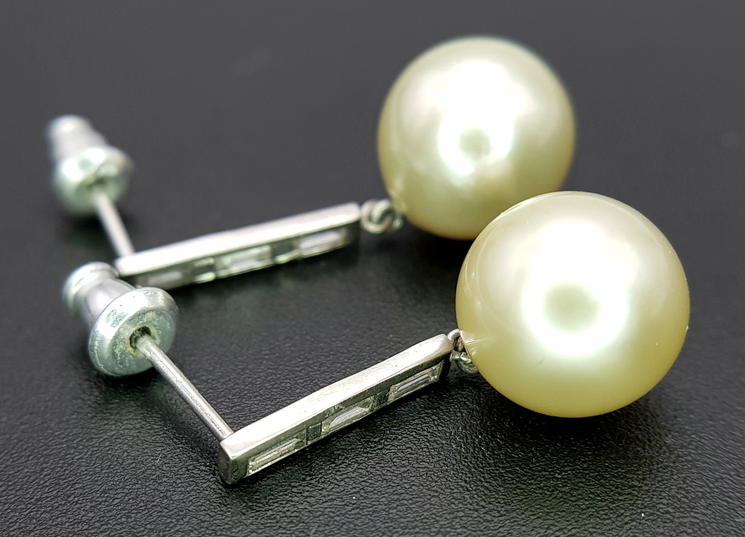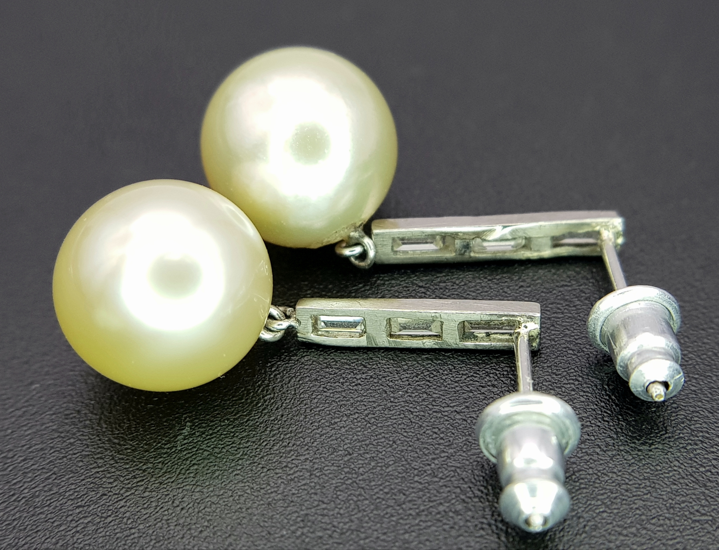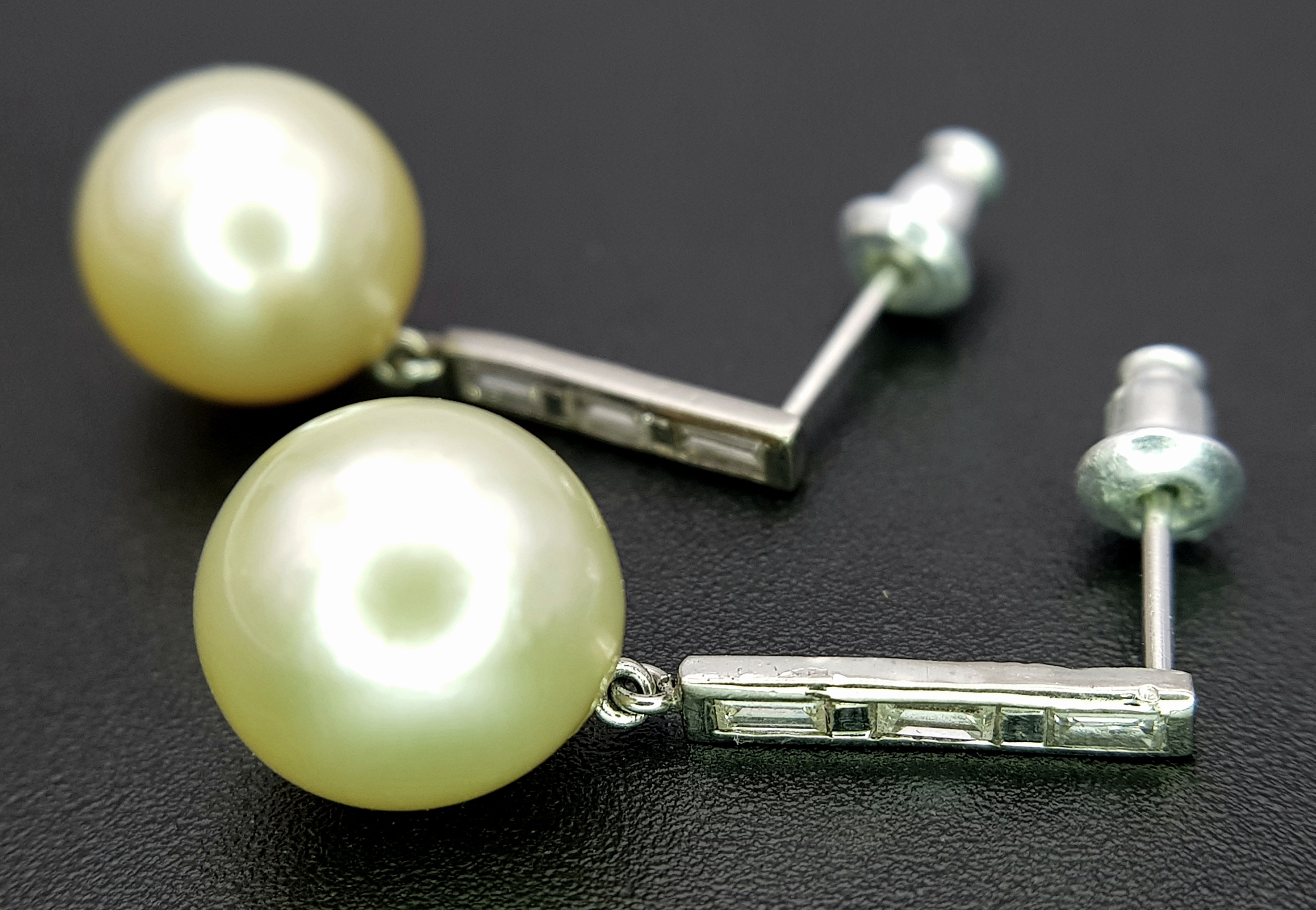 A Pair of 18K White Gold (tests as) Diamond and South Sea Pearl Drop Earrings. 11mm pearls. Baguette cut diamonds. 23mm drop. 4.2g total weight. Ref: 2.12.