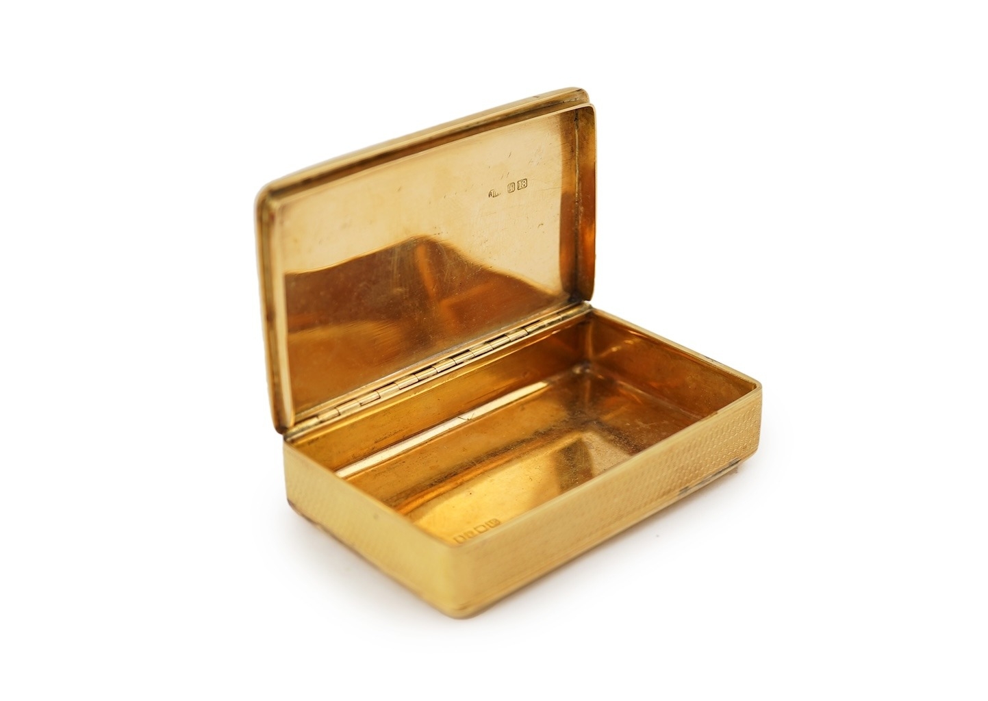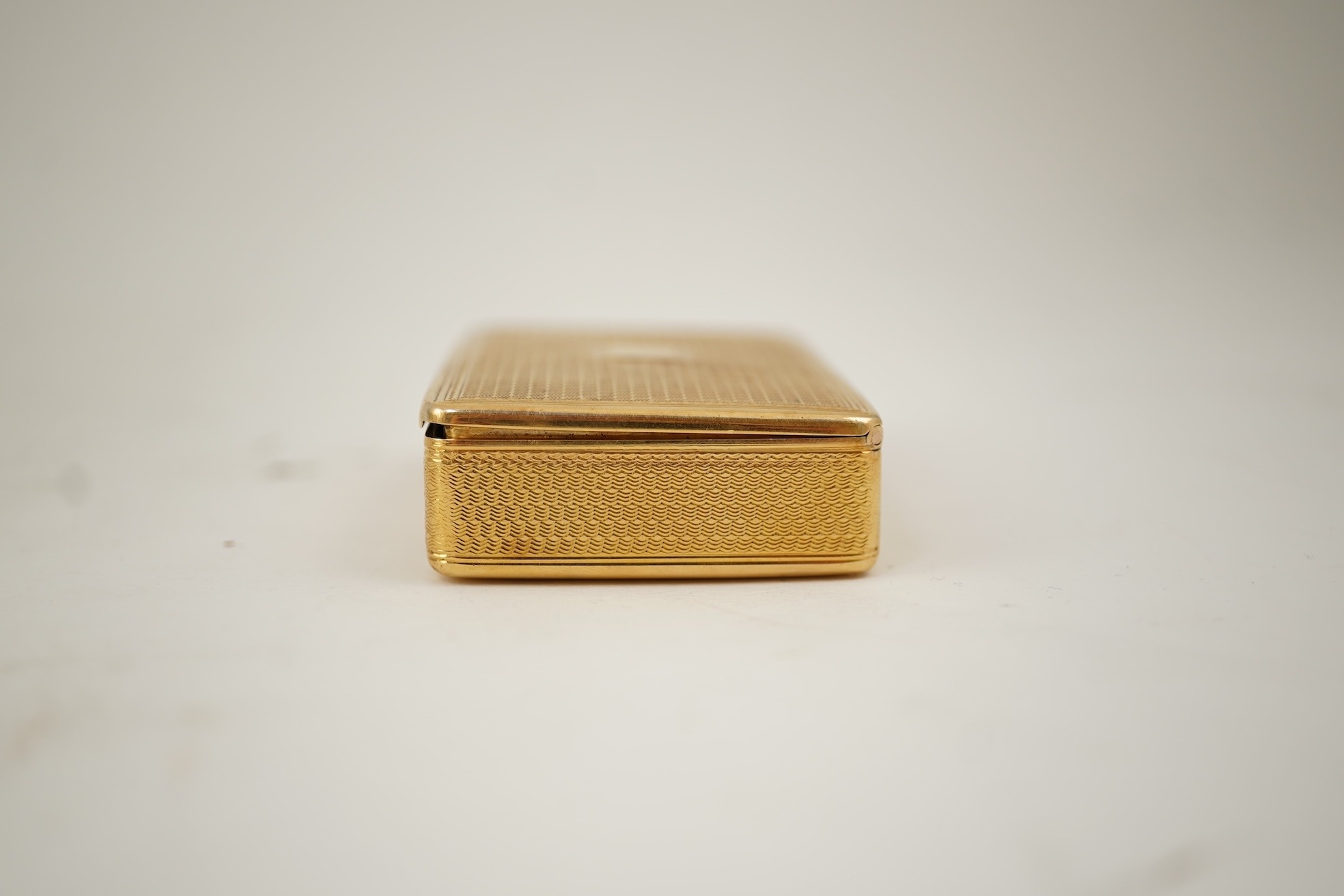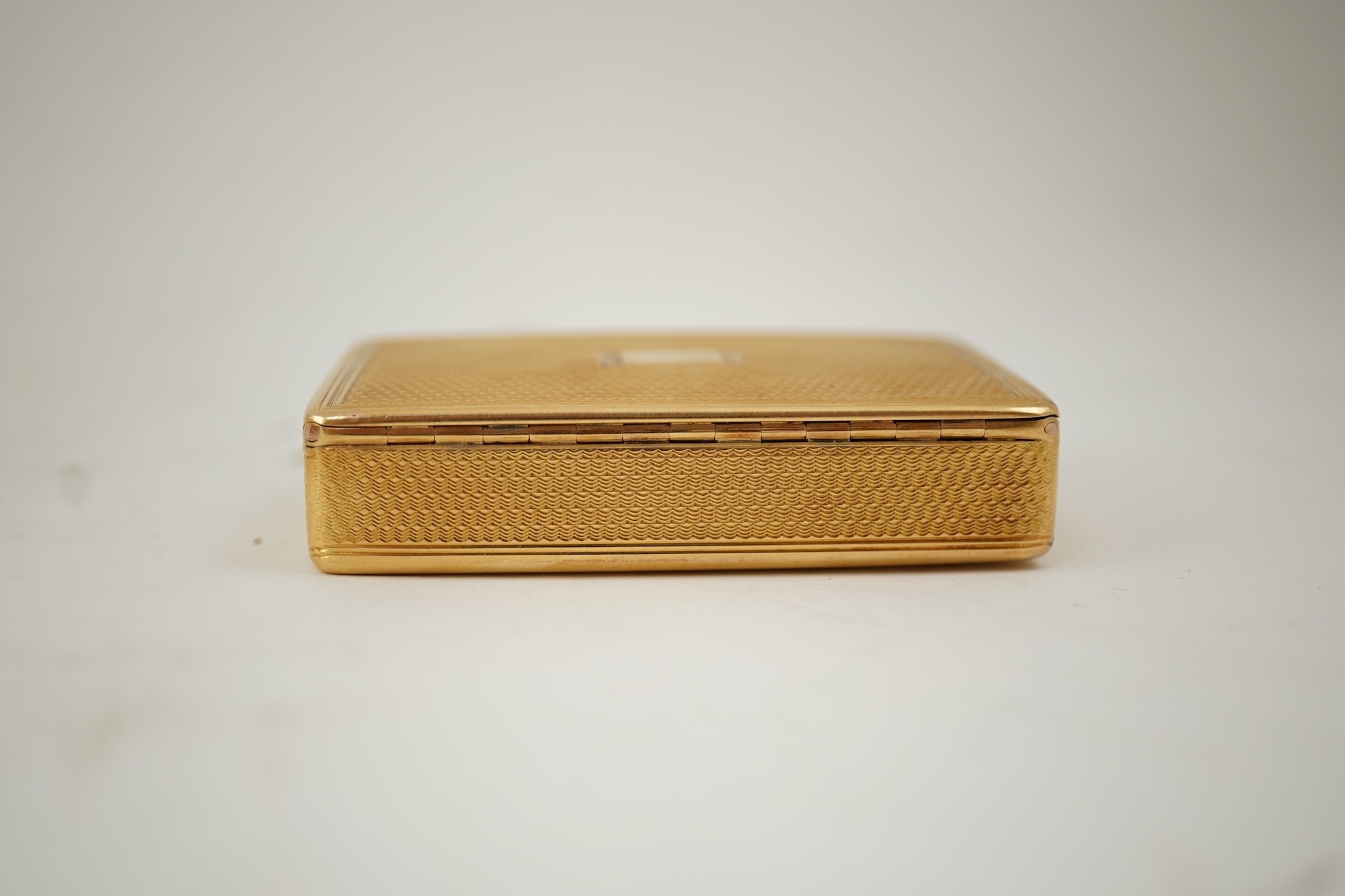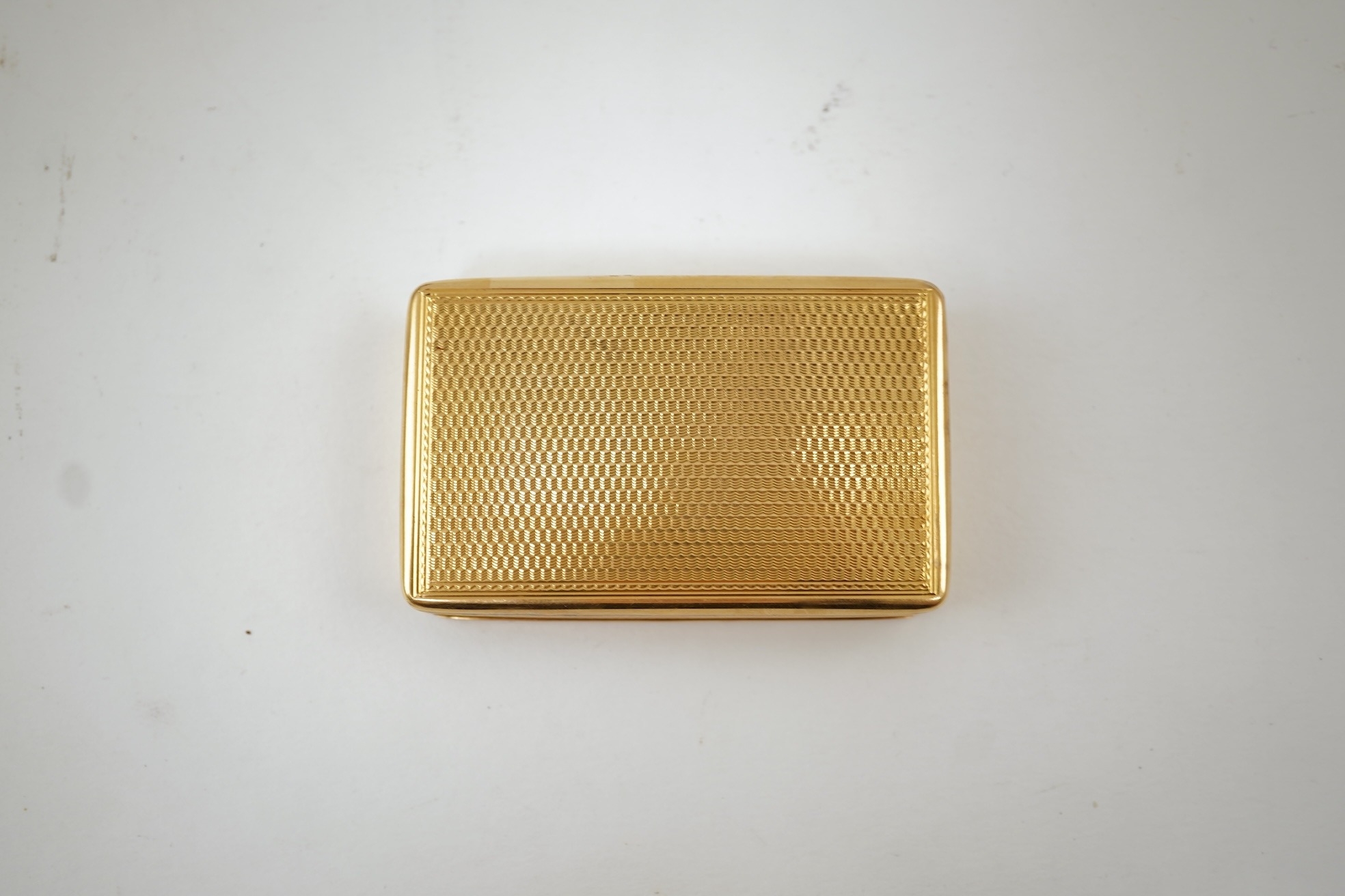 An Edwardian engine turned 18ct gold rectangular snuff box, by Joseph Walton, with central vacant cartouche, London, 1901, 71mm, 82 grams.