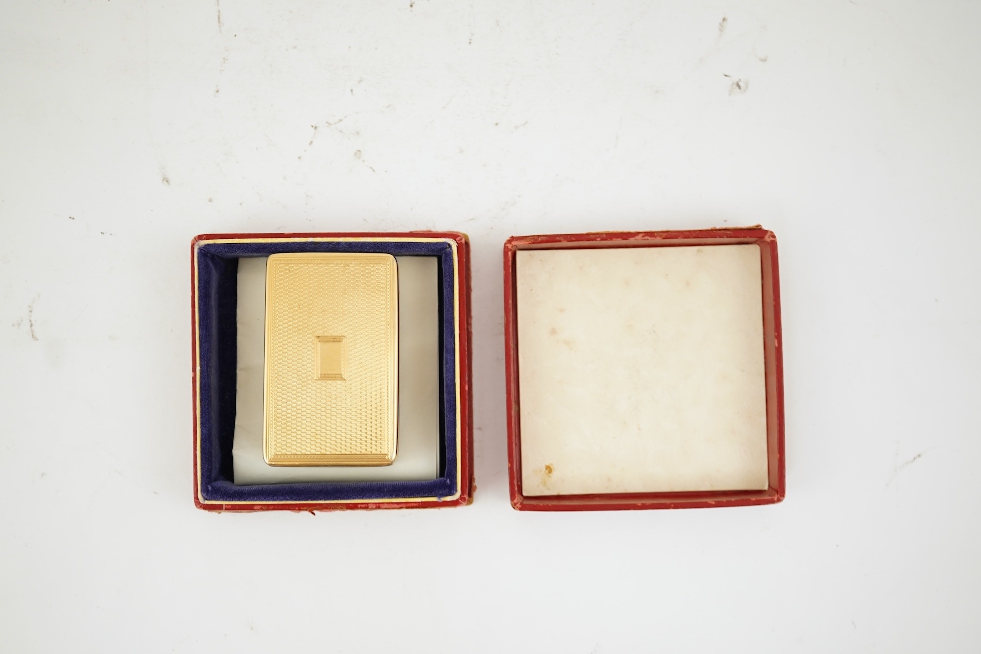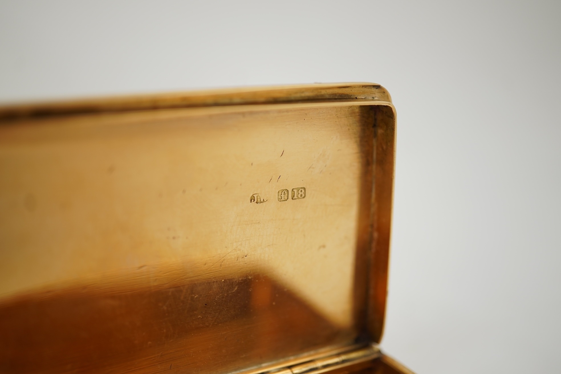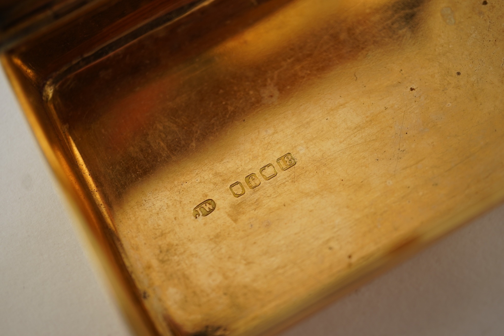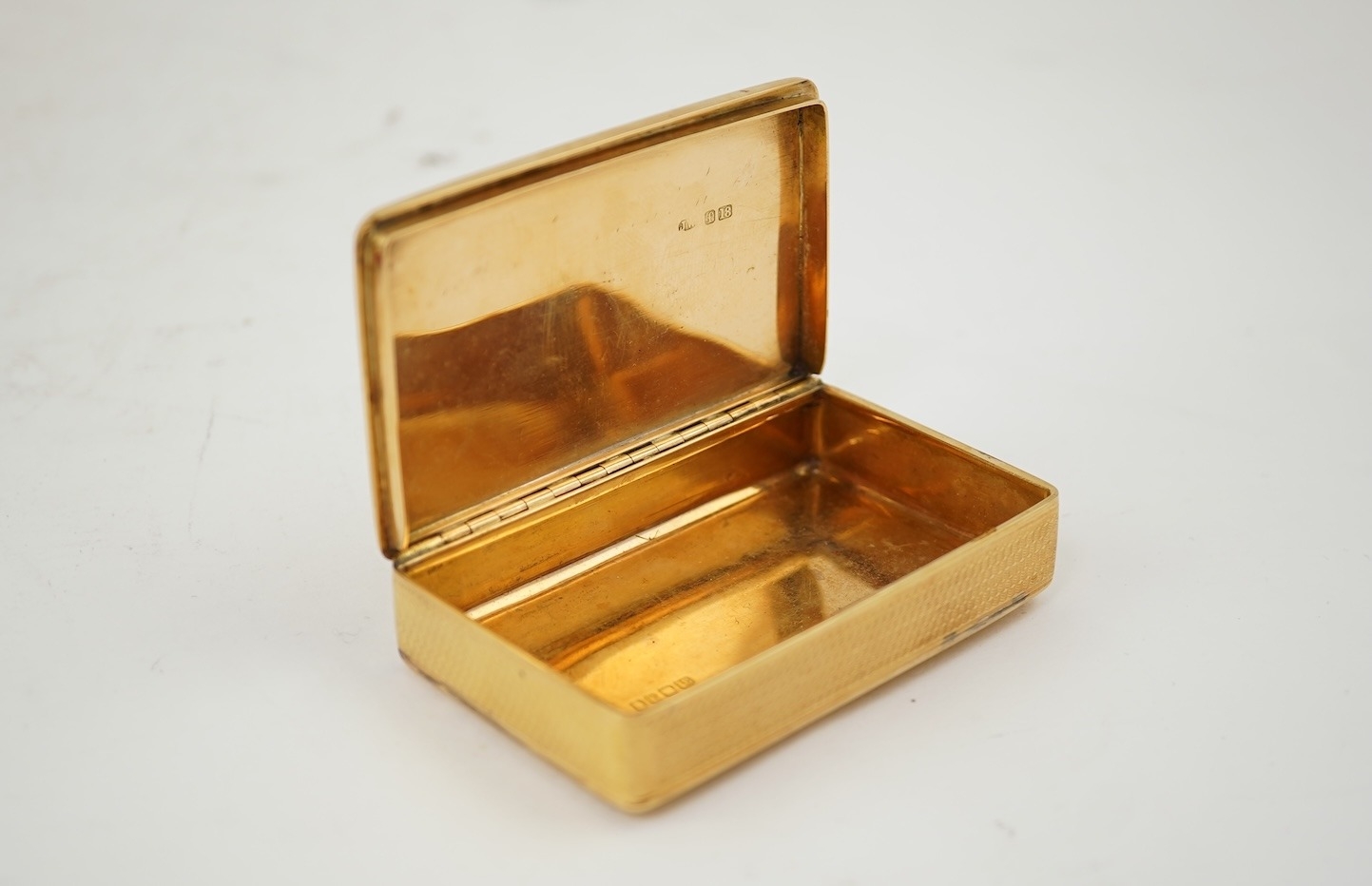 An Edwardian engine turned 18ct gold rectangular snuff box, by Joseph Walton, with central vacant cartouche, London, 1901, 71mm, 82 grams.