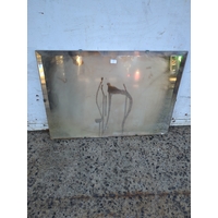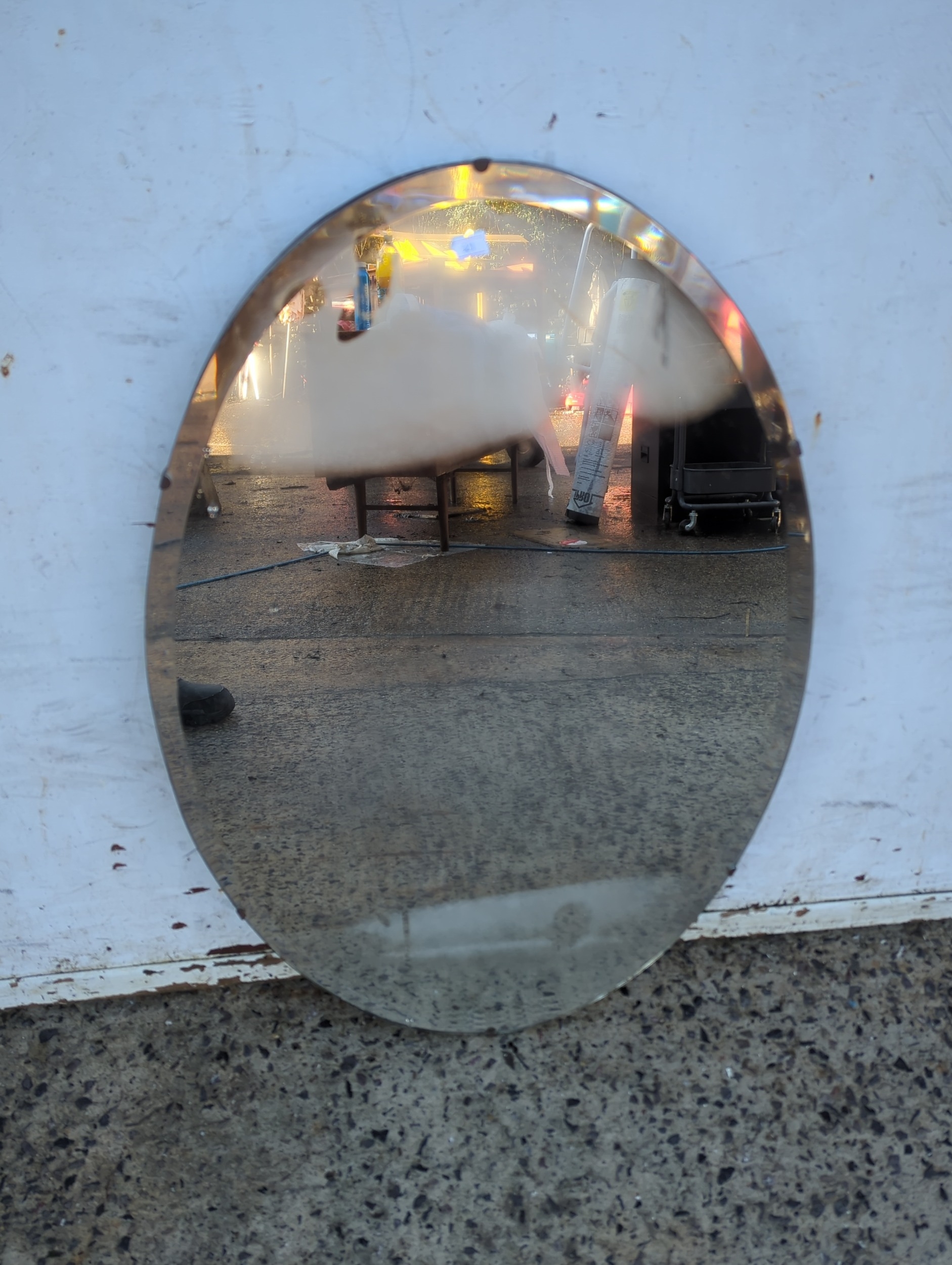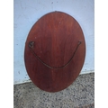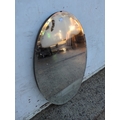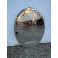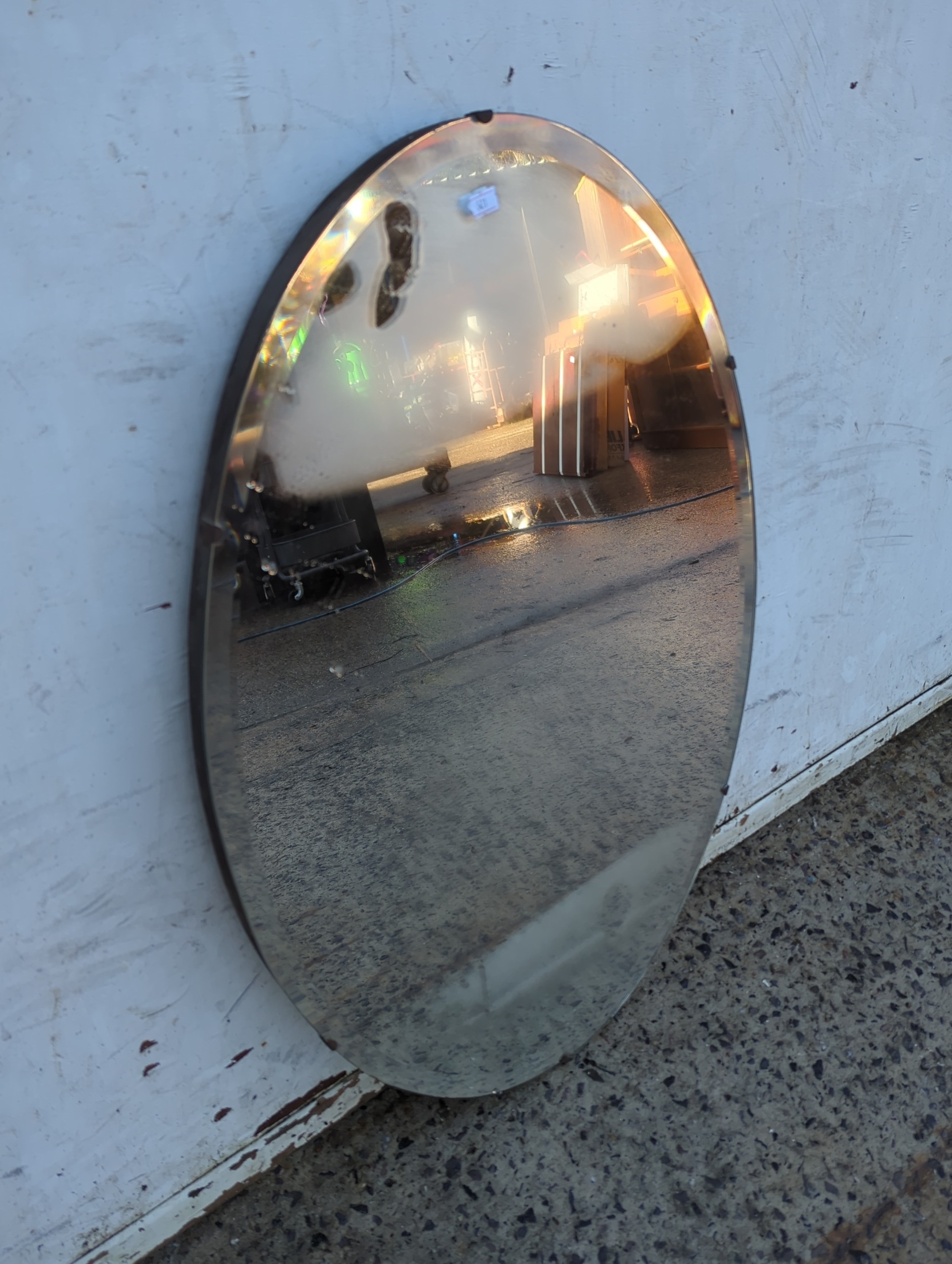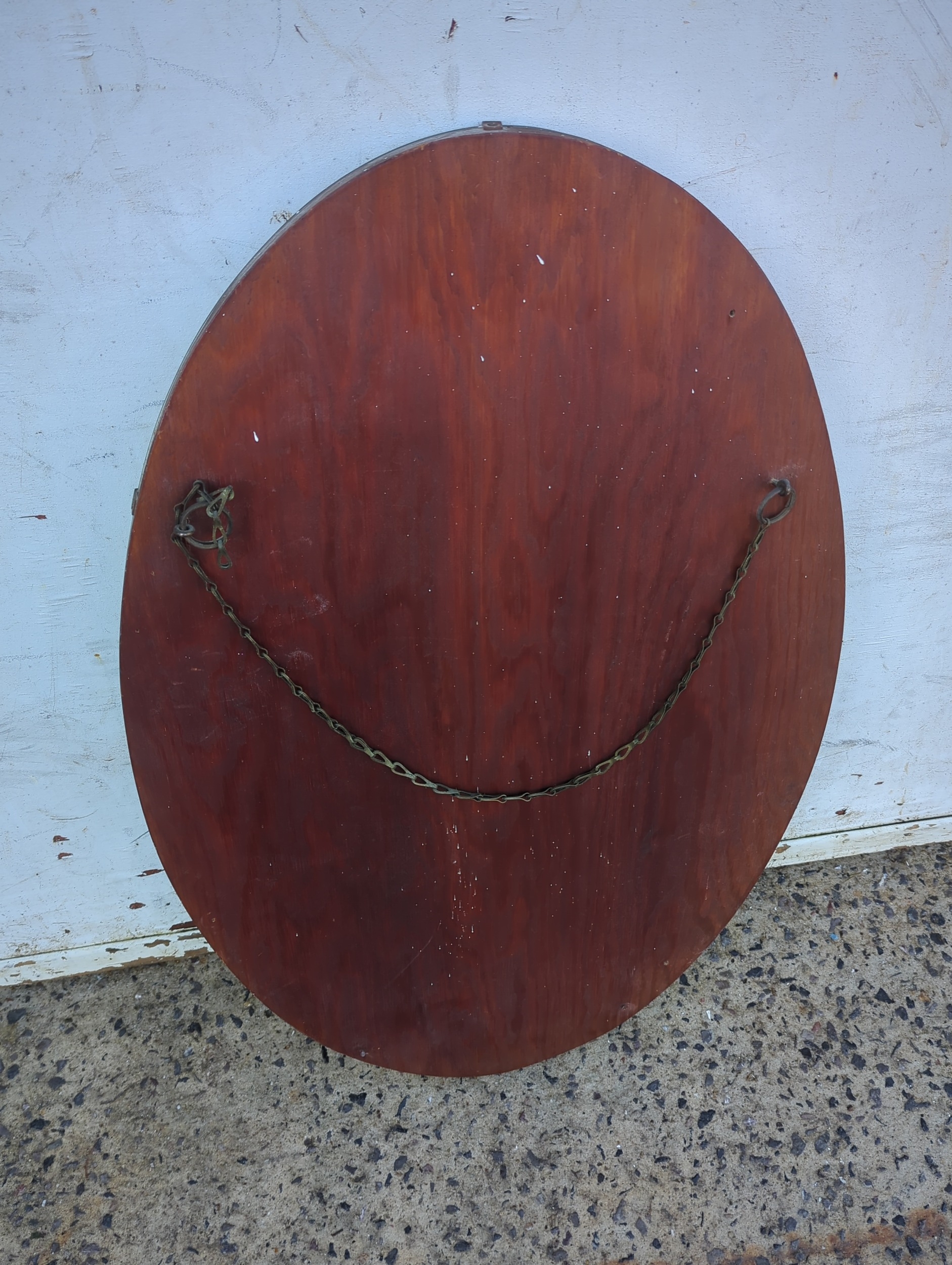 This is an oval wall mirror featuring a sleek reflective surface and a wooden back with a built-in chain hanger for easy wall mounting. The mirror's simple design allows it to blend seamlessly with various decor styles. It appears to be suited for both functional and decorative use in a variety of spaces.
