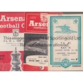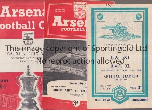 SERVICES FOOTBALL AT ARSENAL Three programmes for matches at Highbury: FA XI v RAF XI 27/10/1948 and 8/11/1950. horizontal fold, team changes and scores entered, both with small writing on the cover and British Army v Belgian Army 27/3/1957 including Duncan Edwards, slightly creased. Fair