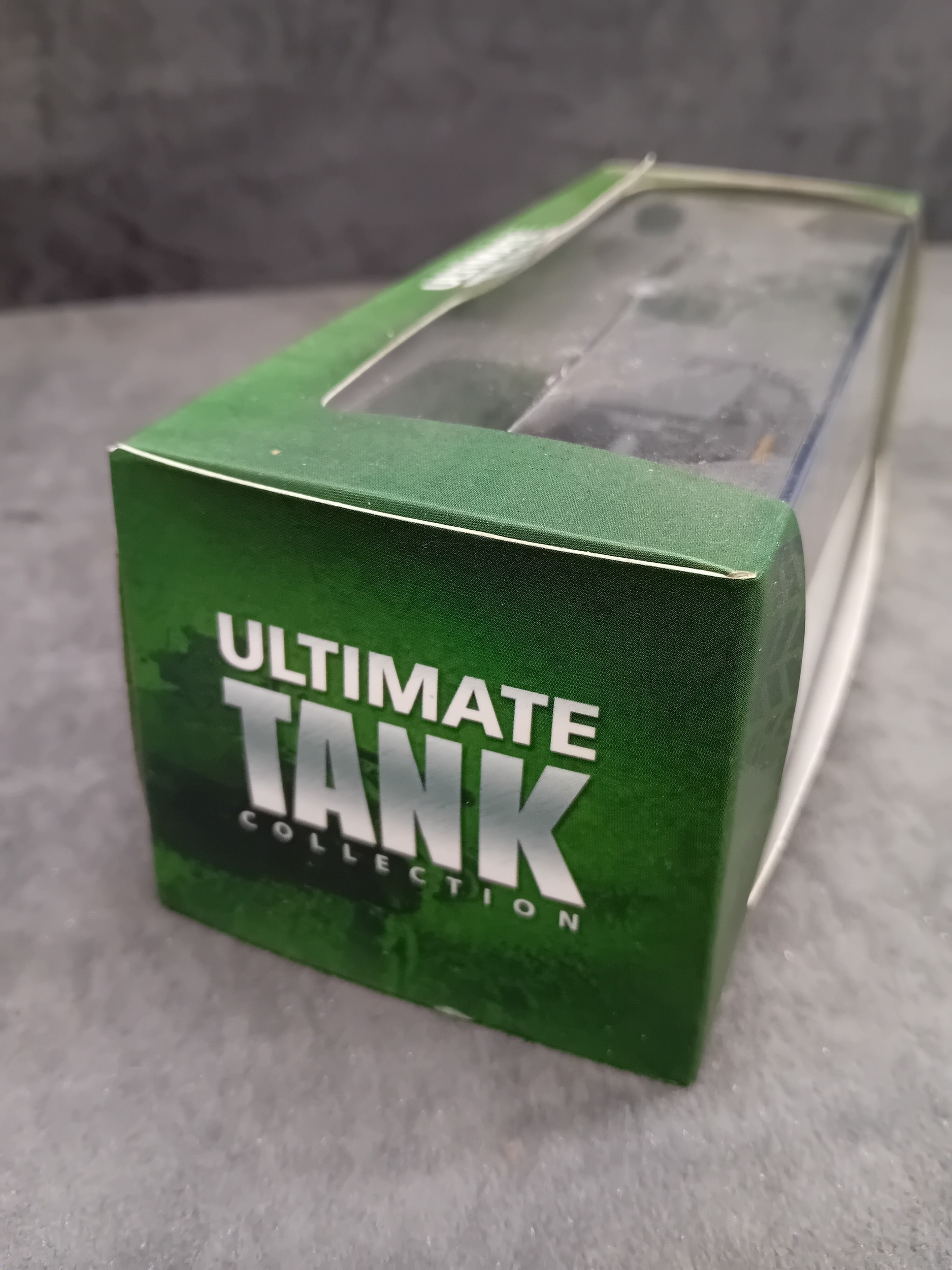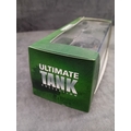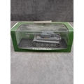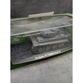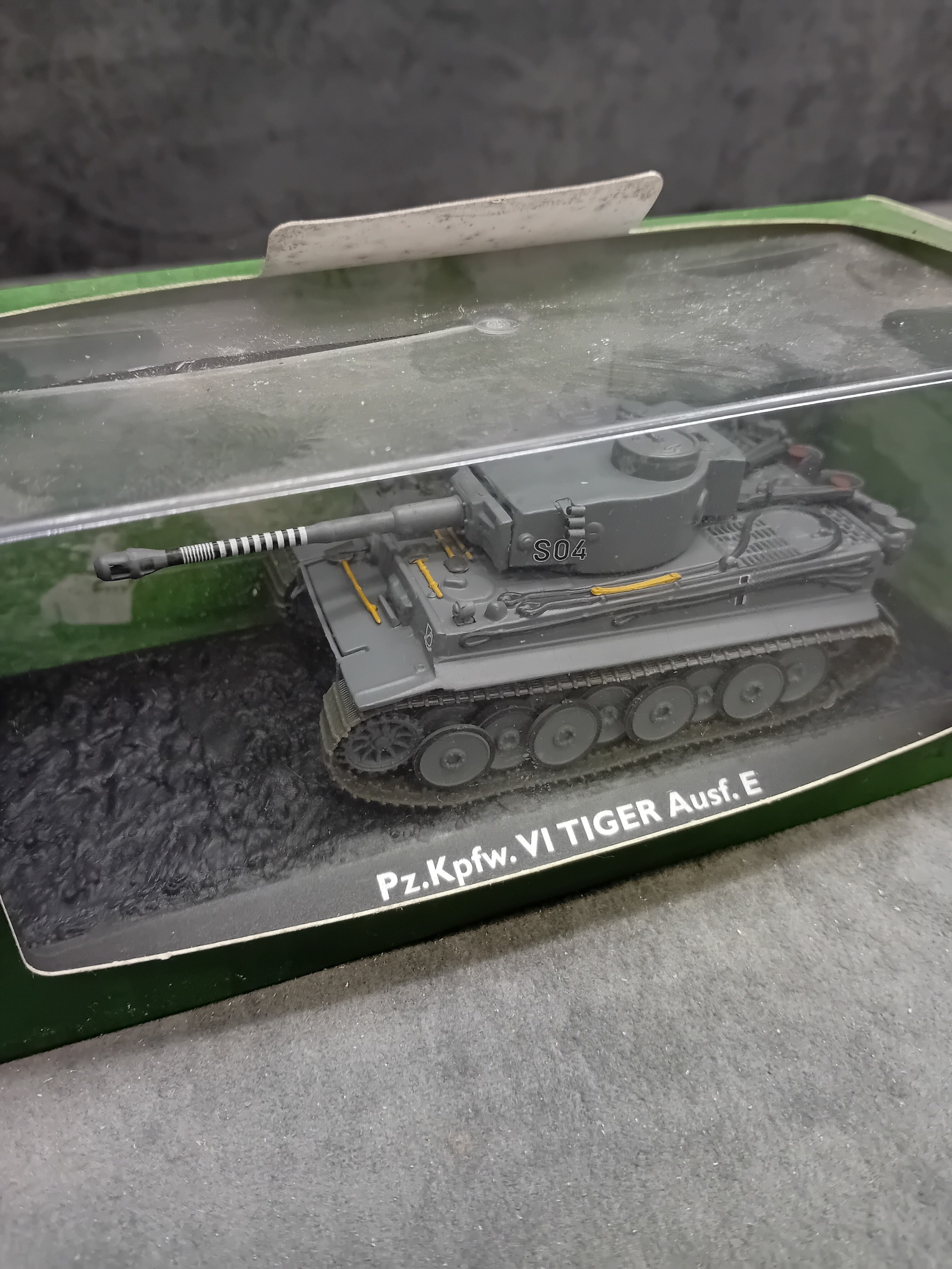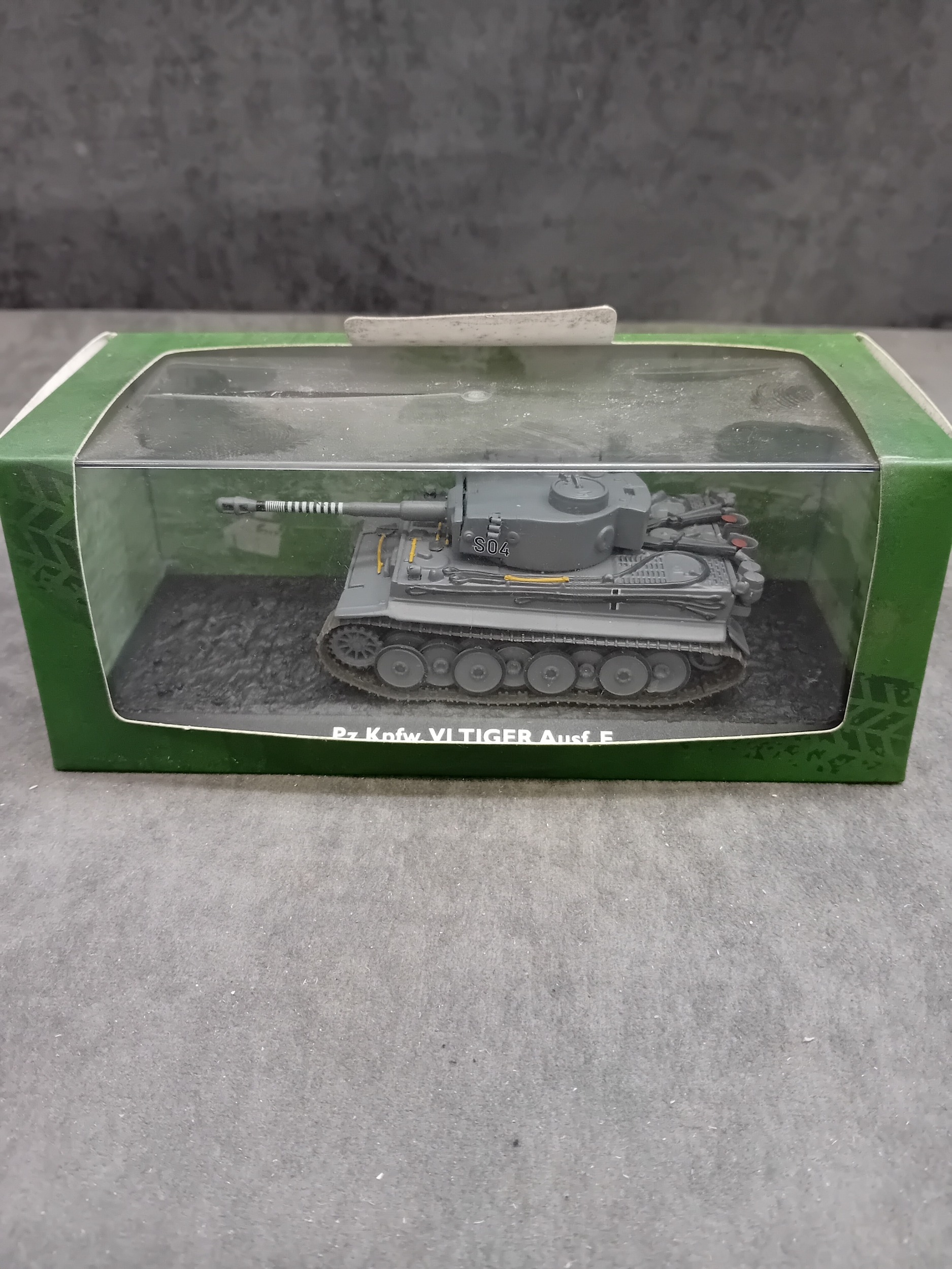 An Atlas Ultimate Tank Collection Pz.Kpfw. VI Tiger Ausf. E 1:72 scale model. This miniature replica of a military tank is grey with subtle yellow and white/black striped accents, featuring the marking 'S04' on its turret. It is displayed on a textured, dark grey base, encased in a clear plastic display box, which is housed within a green cardboard retail box. The side of the box is marked 'ULTIMATE TANK COLLECTION'.
