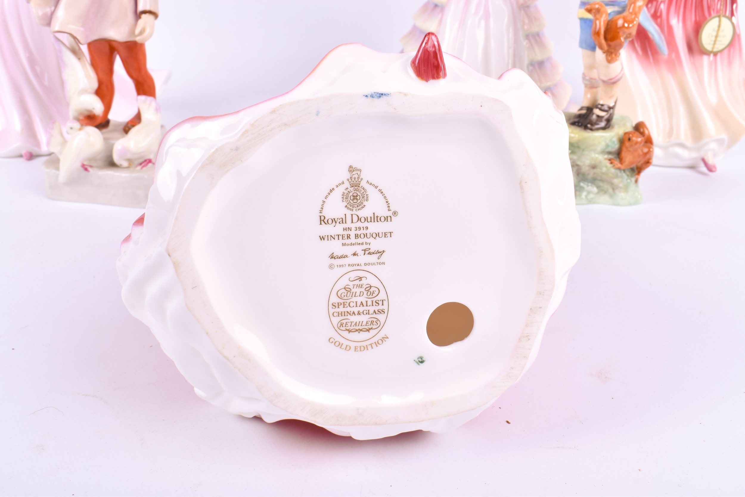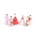 A group of six assorted porcelain figures. Including Royal Doulton, Coalport and other figures of ladies and two Royal Worcester children - October and November. Largest H21cm