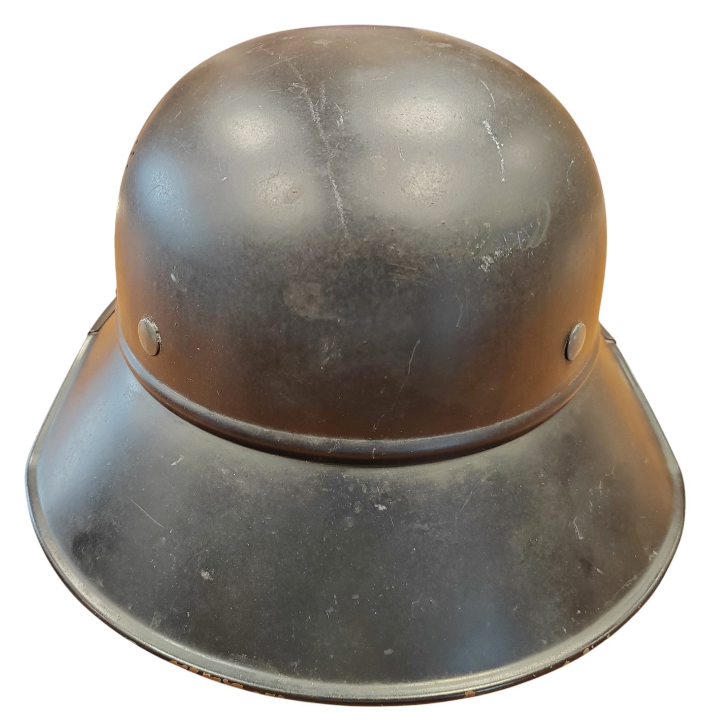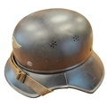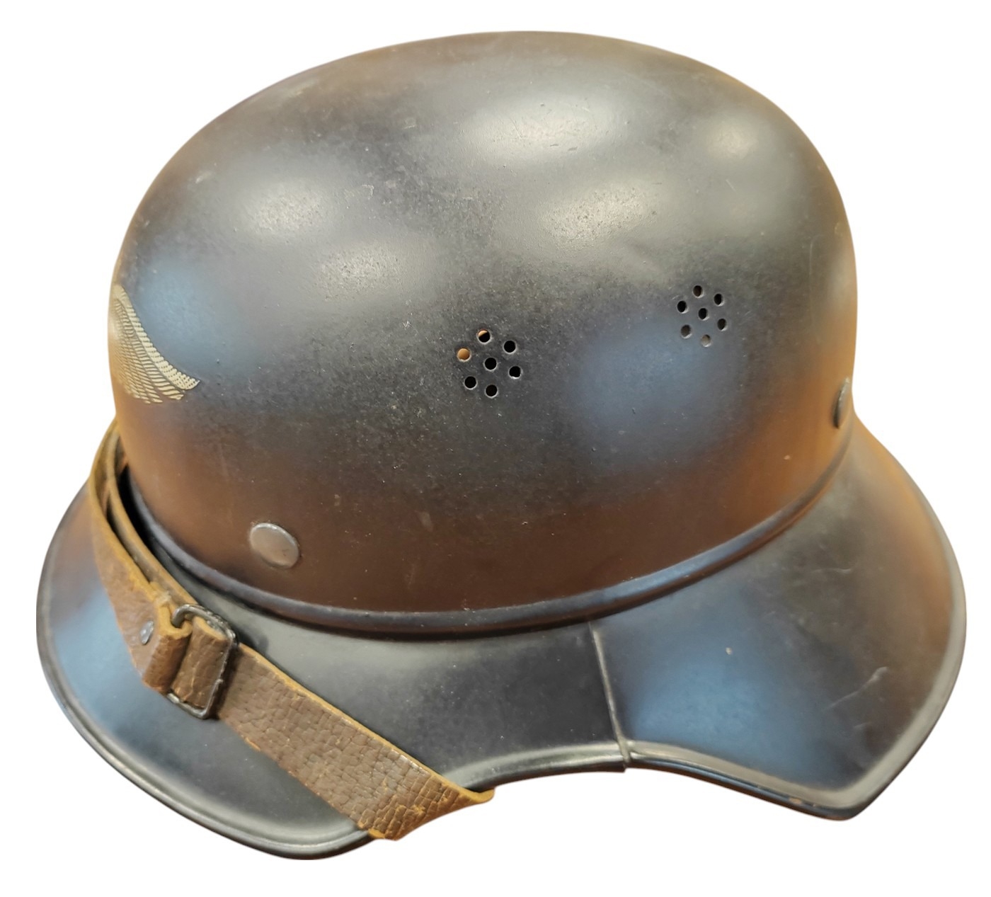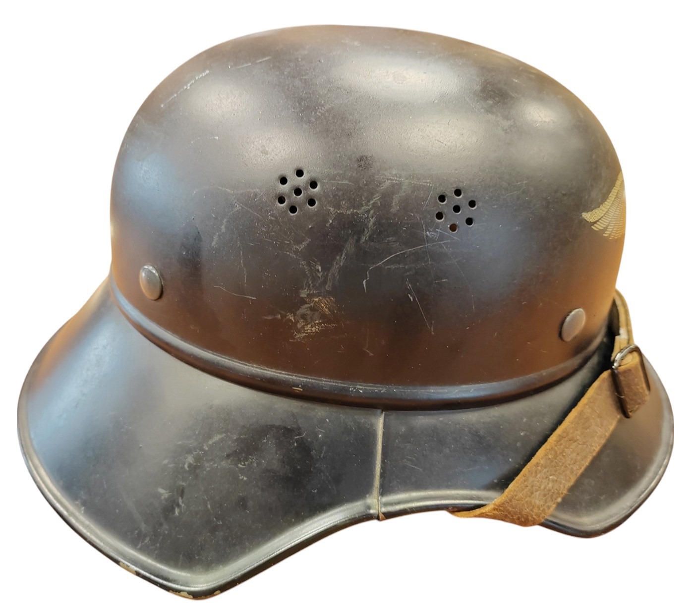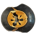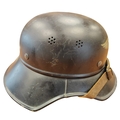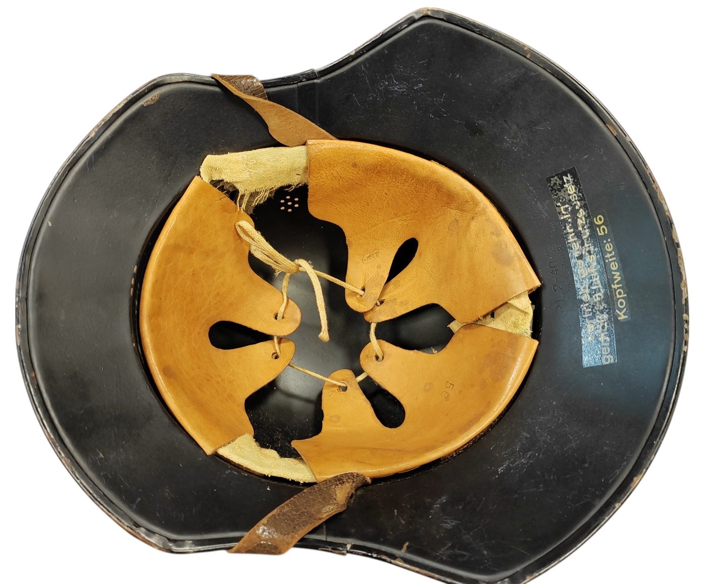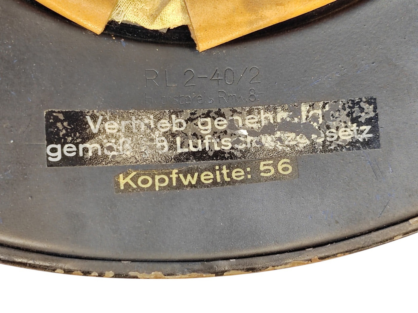 WWII Luftschutz gladiator helmet complete with liner and chinstrap, well preserved front decal, rear inner skirt marked RL2 - 40/2 Hochstpreis Rmk. 8-, plus decal adhered underneath tVertrieb genehmigt gemäß § 8 Luftschutzgesetz Kopfweite: 56 and leather lining marked 56, some marks to helmet otherwise very fine example. (B)