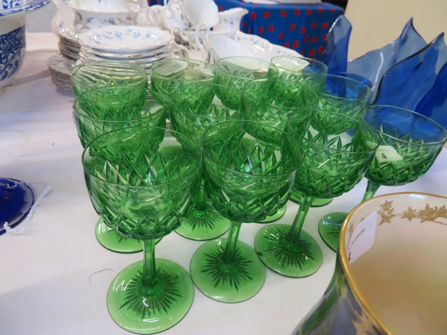 Twelve quality emerald green cut glass port glasses